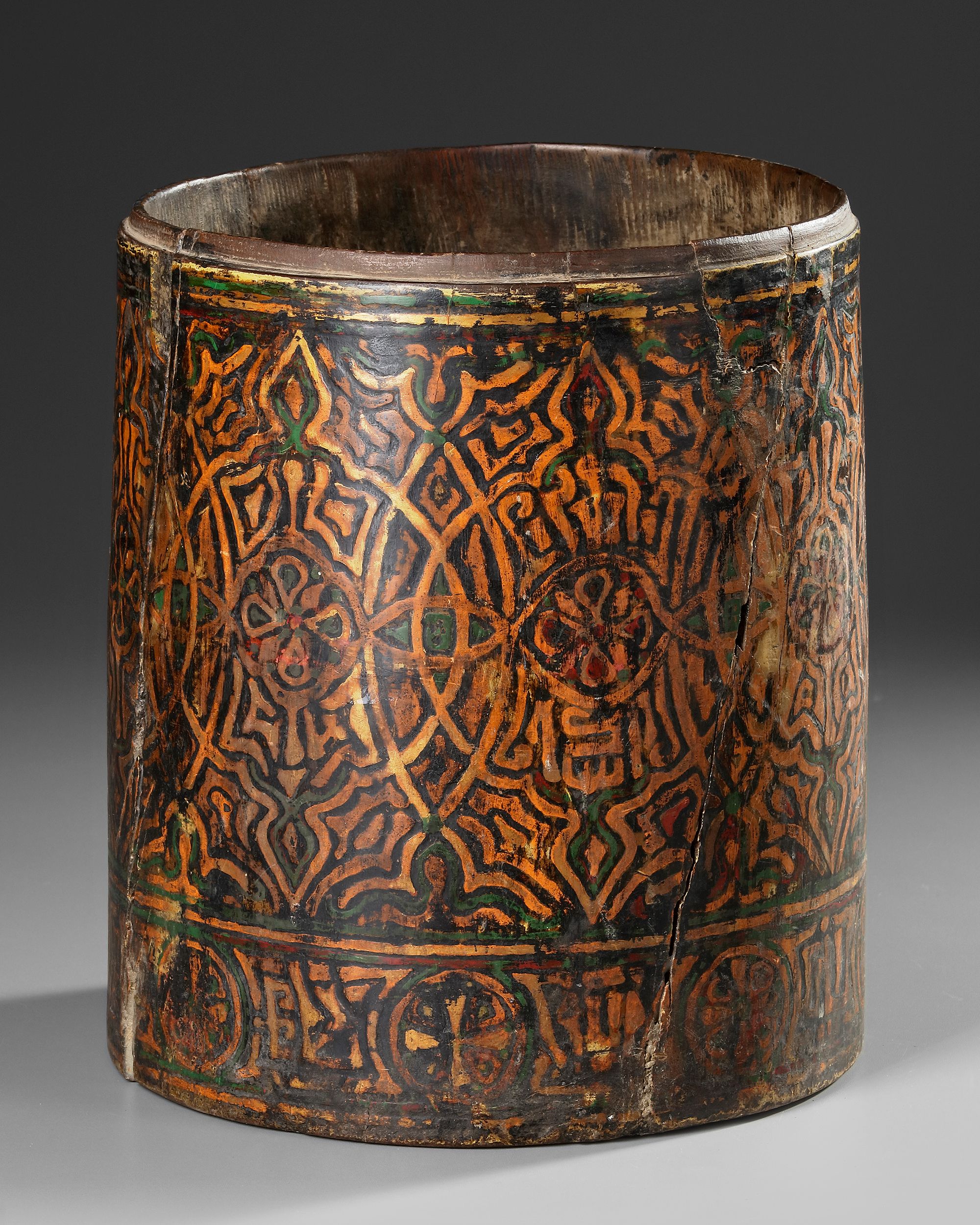With flat base and slightly sloping sides, the upper edge with slight recess to fit a lid, the exterior wooden surface overlaid in a succession of black, red, yellow and green and orange lacquers, then carved through to reveal a polychrome design, the broad central band with lobed roundels containing scrolling arabesques, the borders of the panels entwining and continuing into lobed concentric quatrefoils dividing each panel, a band below of stylized thuluth calligraphy interrupted by roundels containing quatrefoil panels.