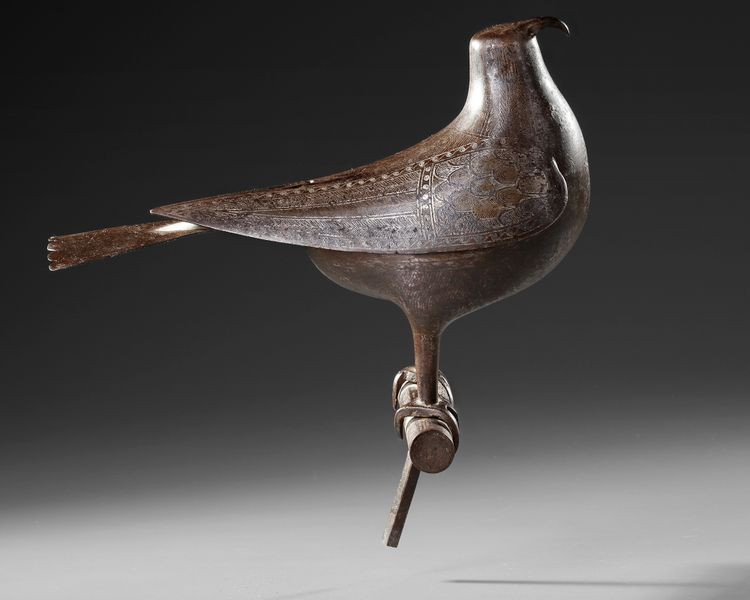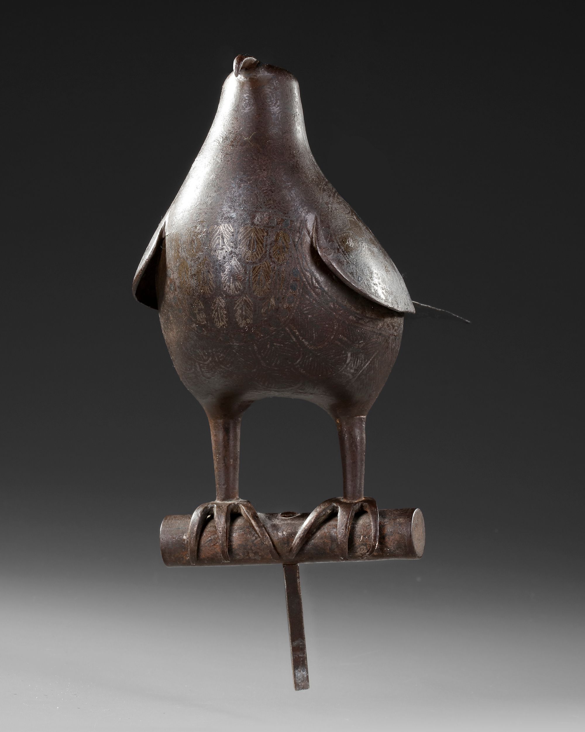 A Persian steel bird on wood stand, decorated to back, breast and tails with panels with geometric and gilt floral designs.