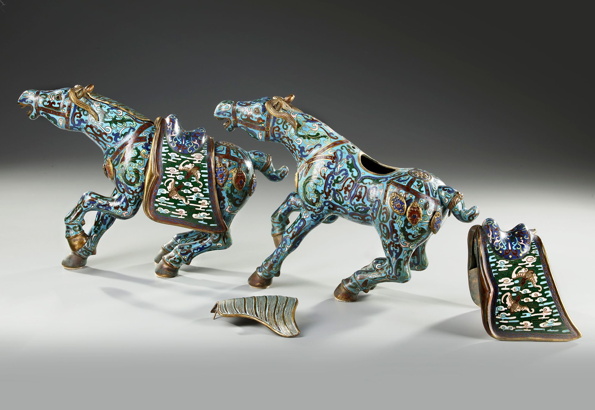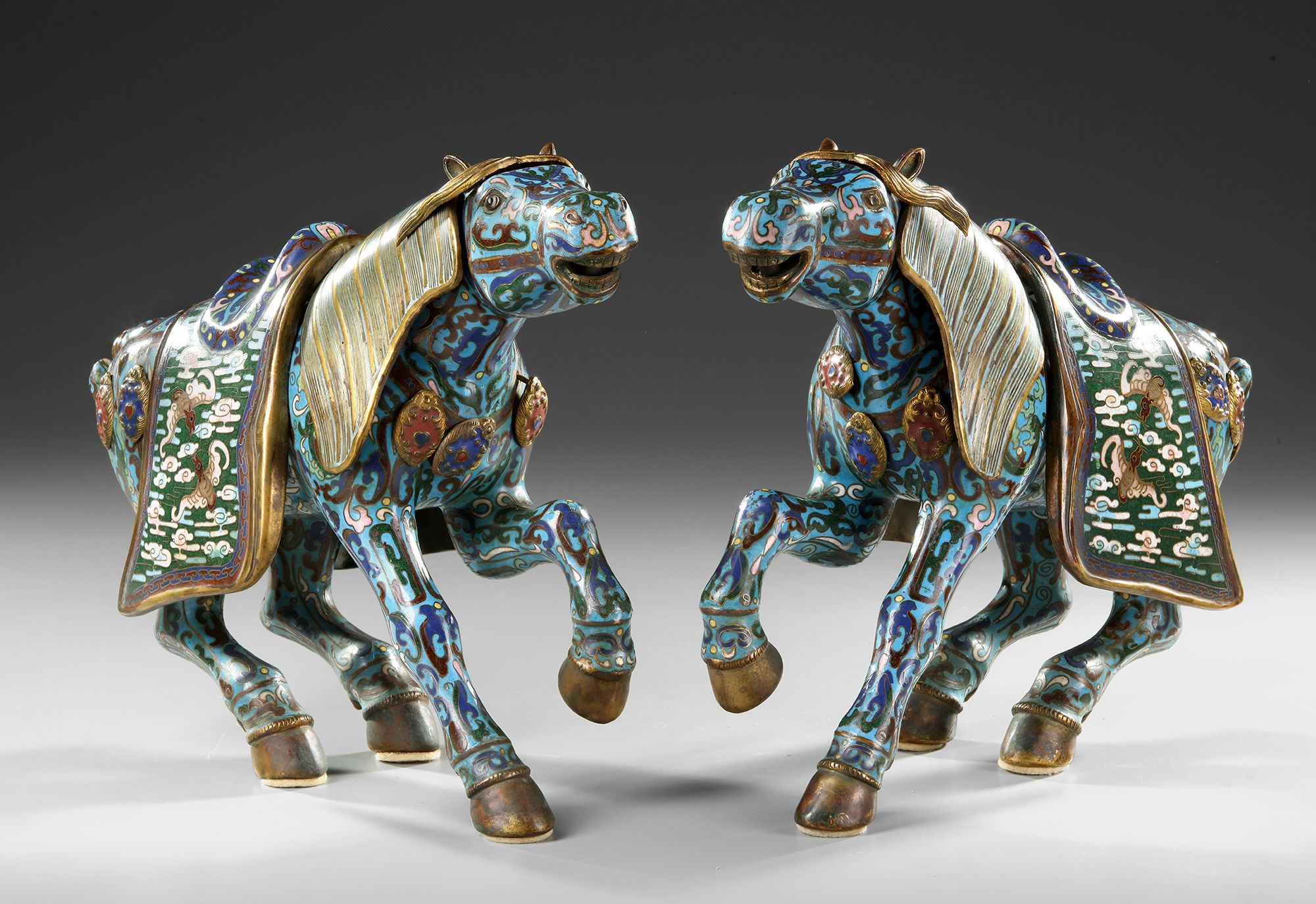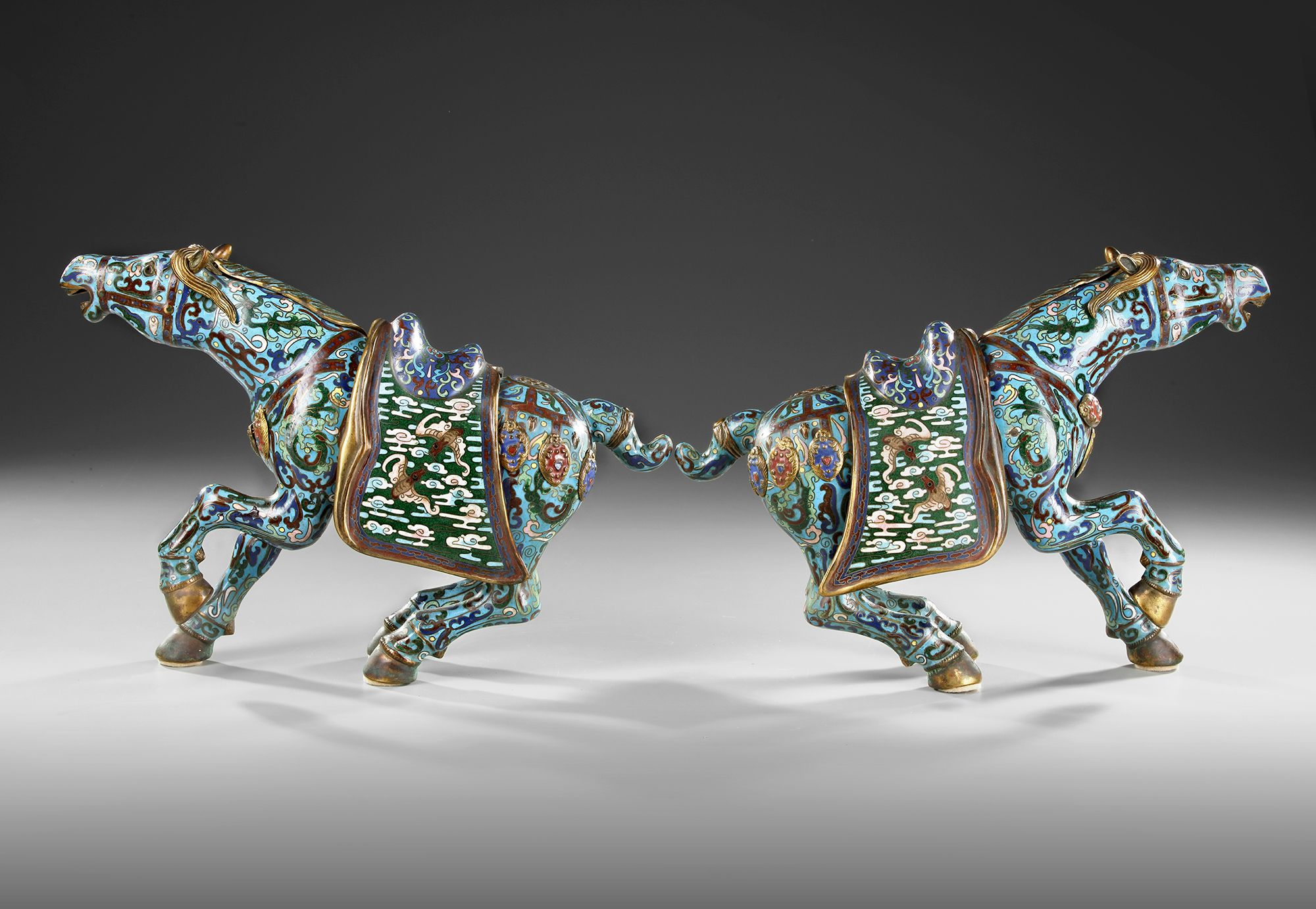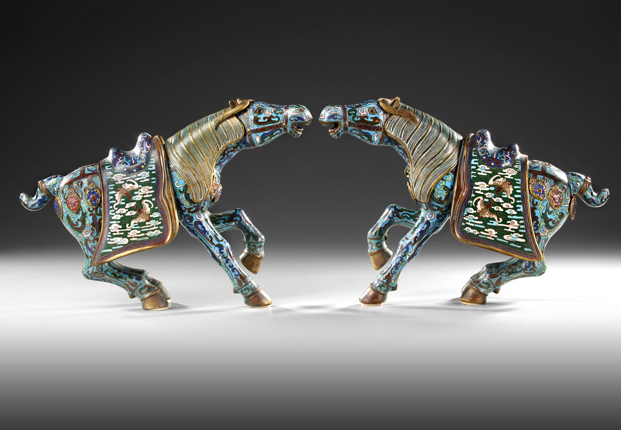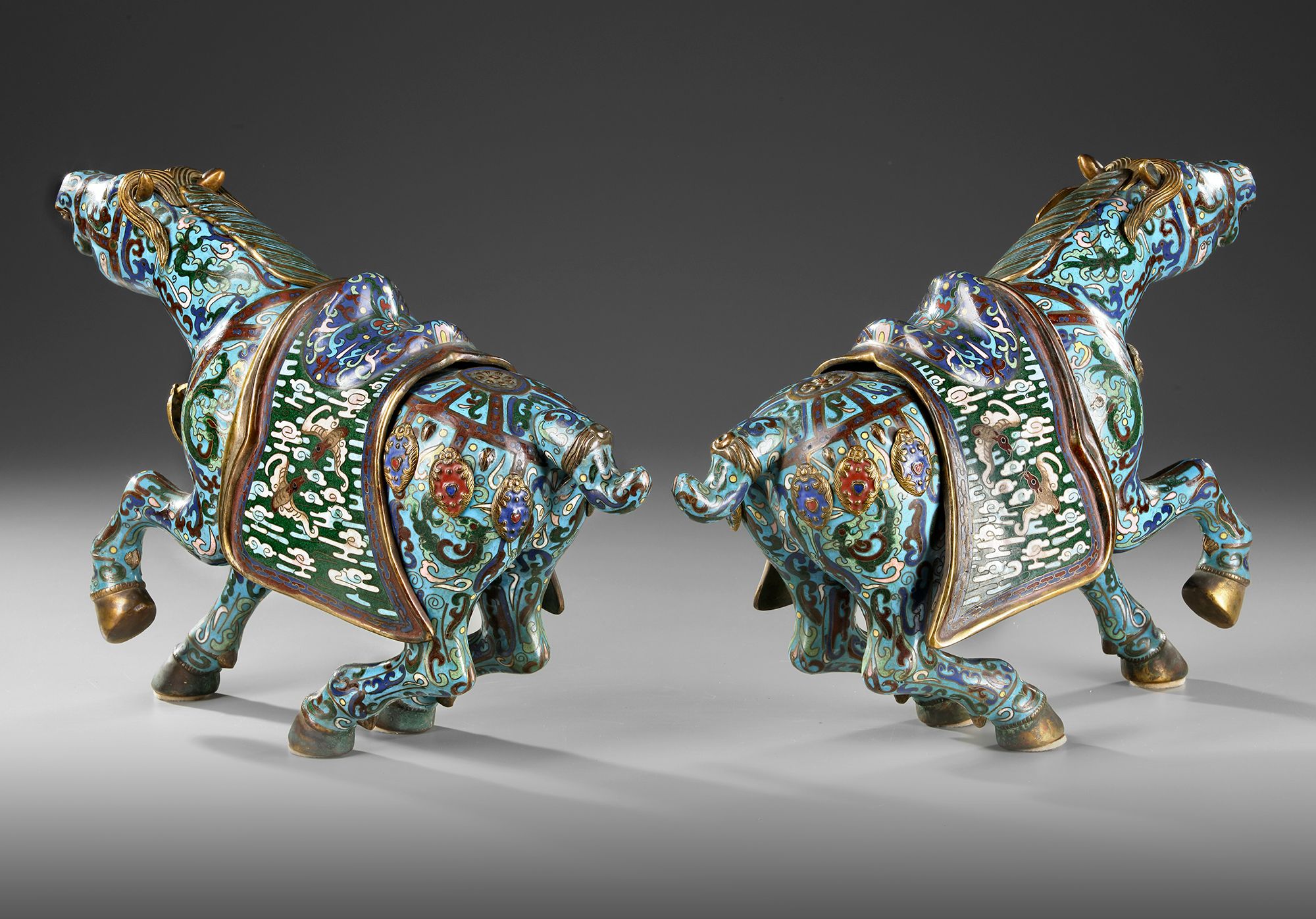 A PAIR OF LARGE CHINESE CLOISONNE ENAMEL FIGURES OF CAPARISONED HORSES, 20TH CENTURY