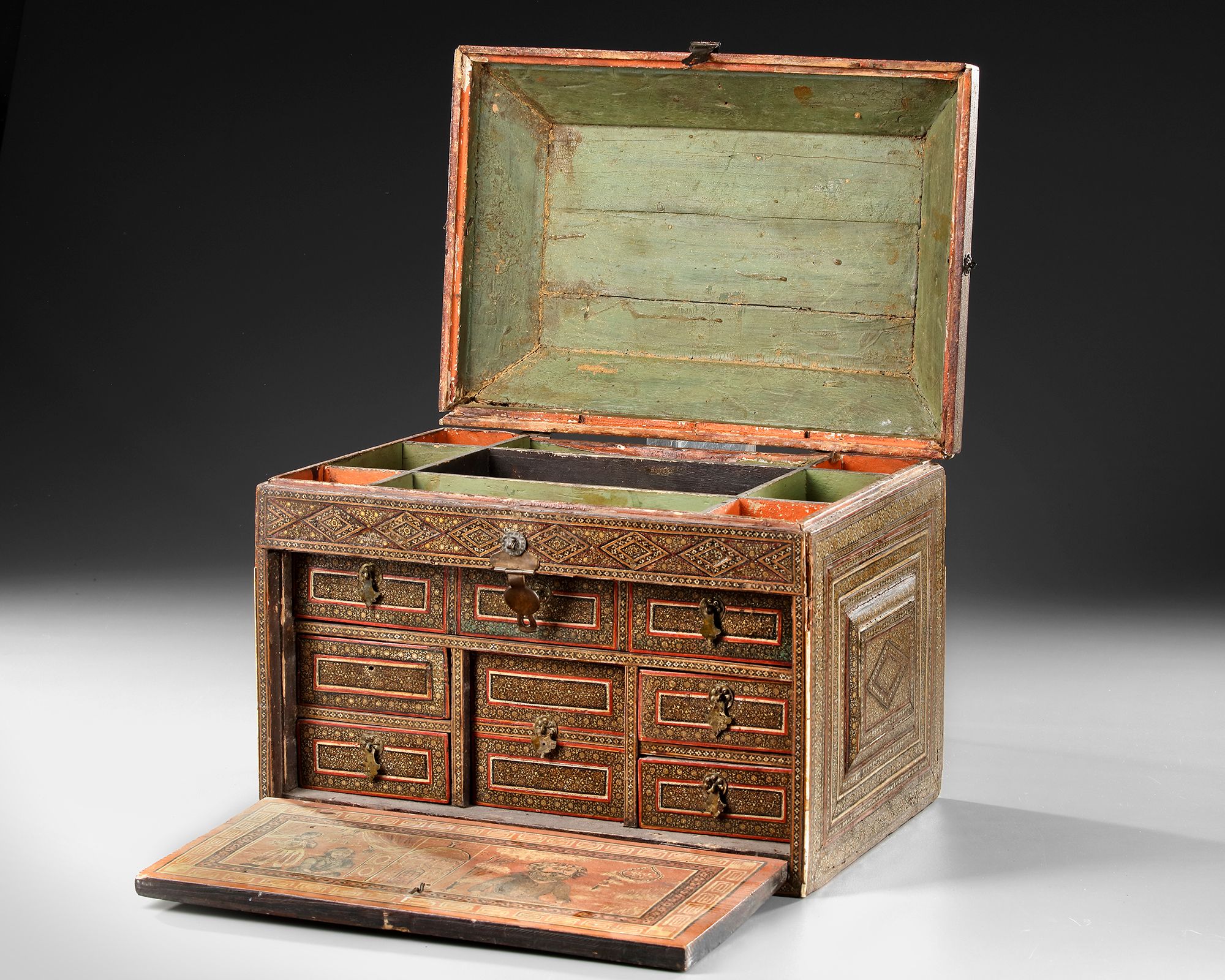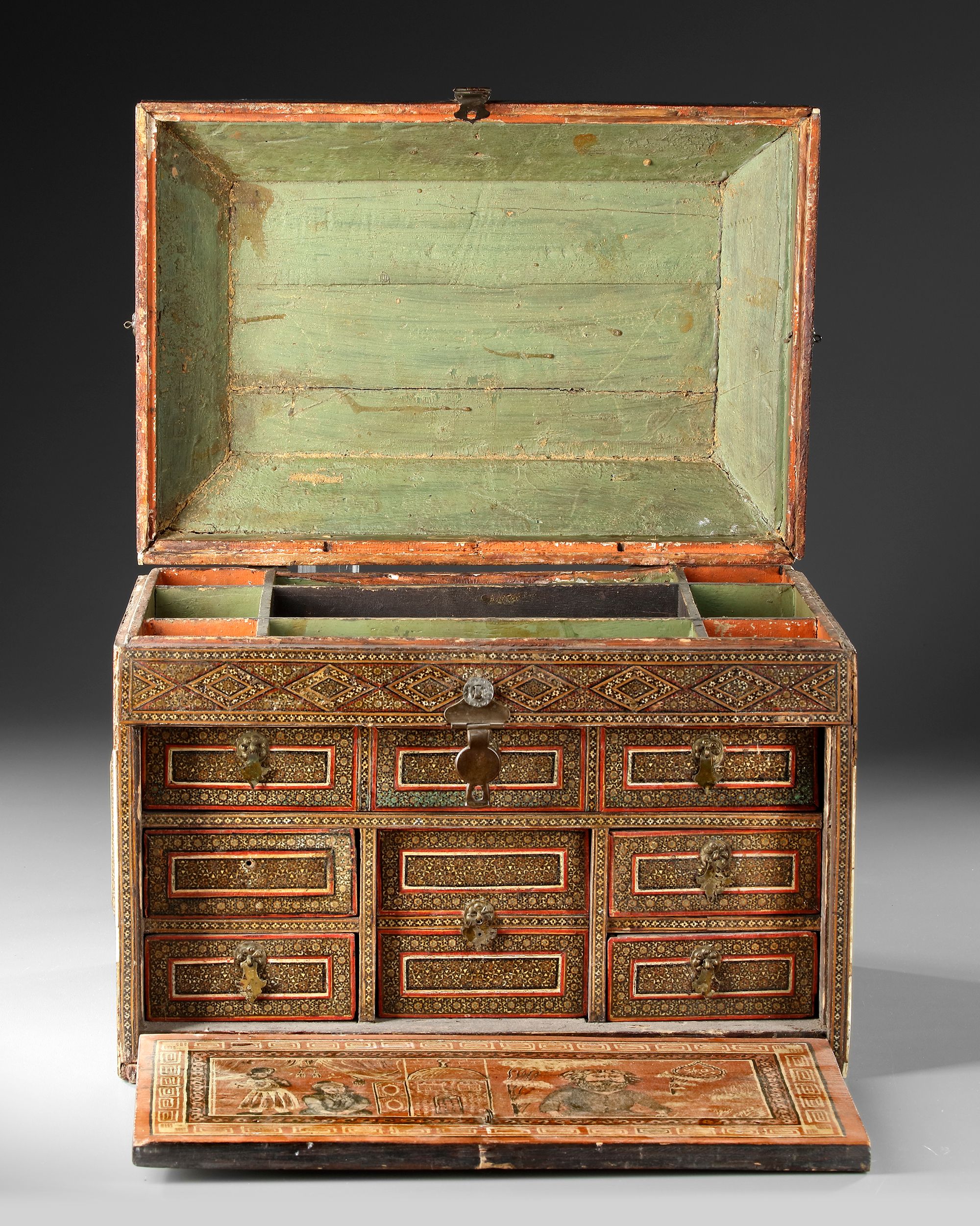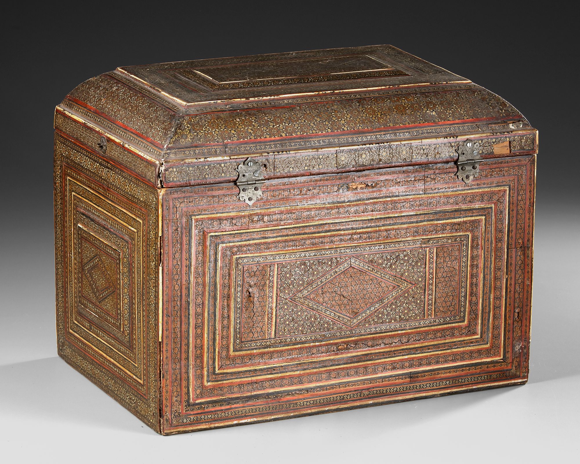 Of rectangular form with hinged cover, inlaid with bands of micro-mosaic bone, metal, wood and lac in a geometric composition made up of repeating stellar motifs, painted bone lock plate and floral rosette catch.