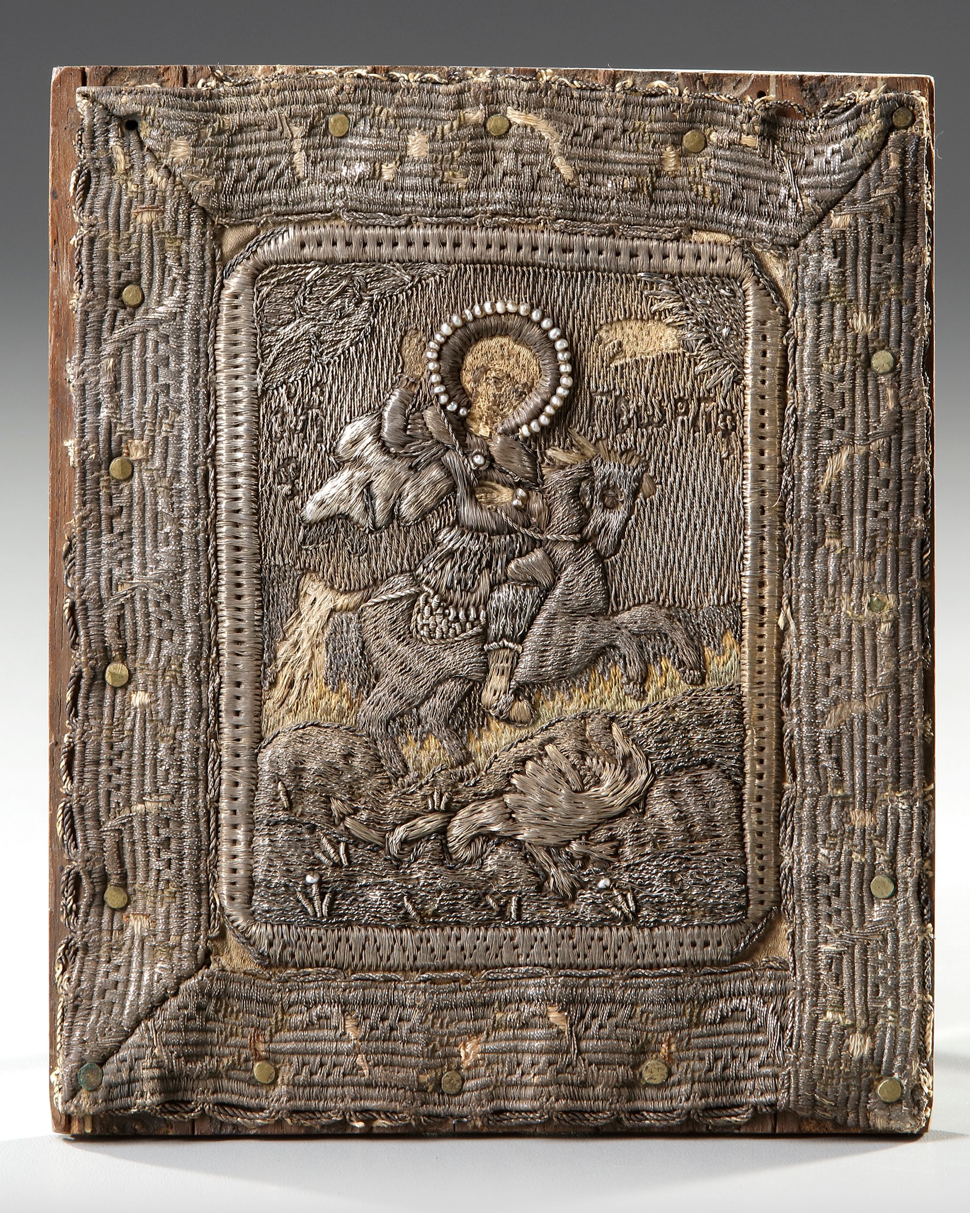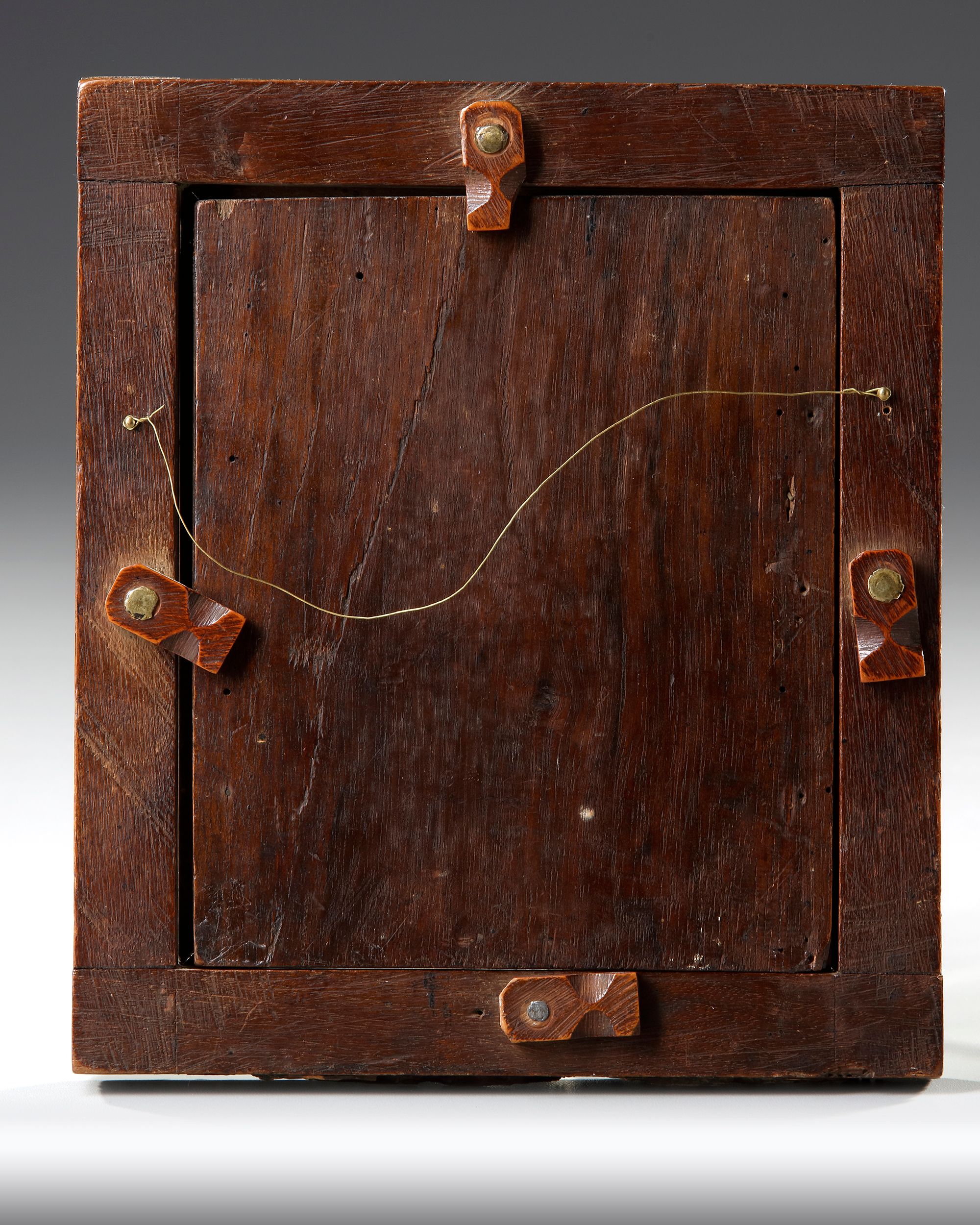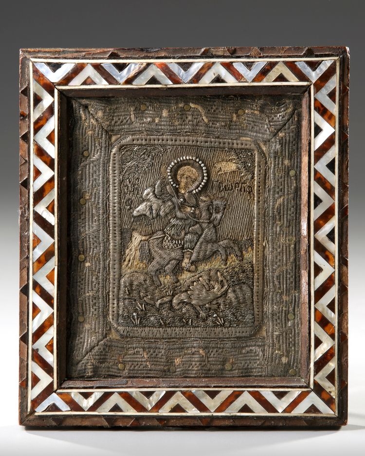 Saint George killing the dragon, with wooden frame inlaid with tortoiseshell and mother of pearl. 17 by 19 cm.