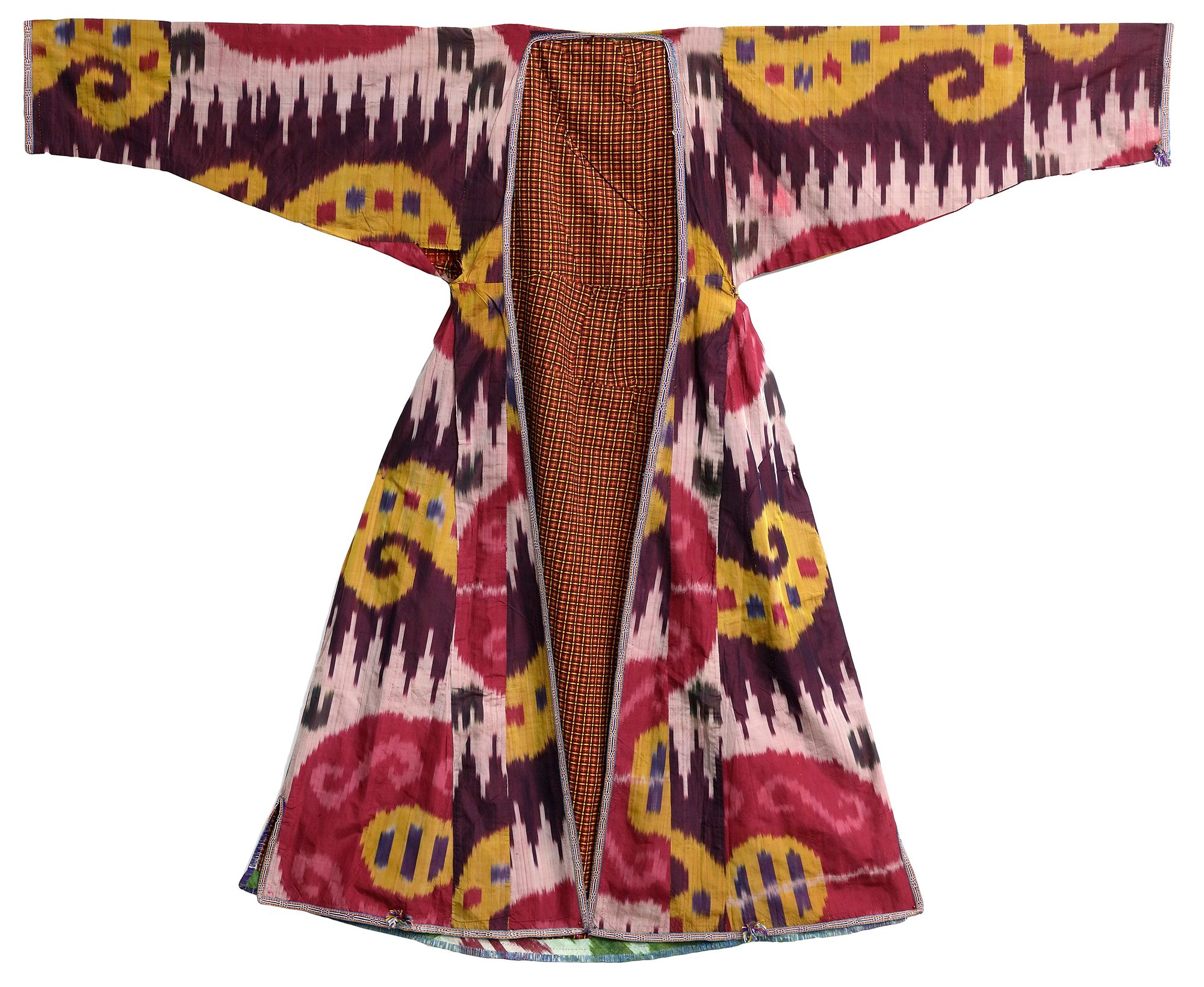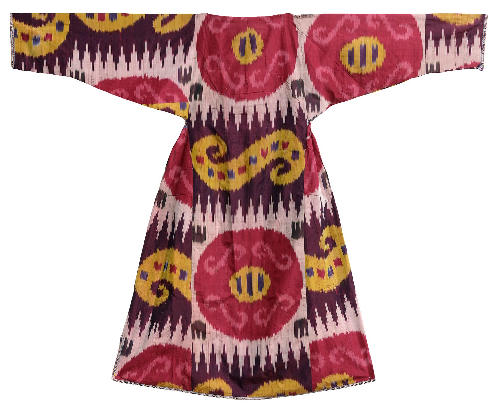 A beautiful Uzbek Ikat robe from Bukhara, The lovely colour compliment the patterns with natural red and yellow highlighted with the white.