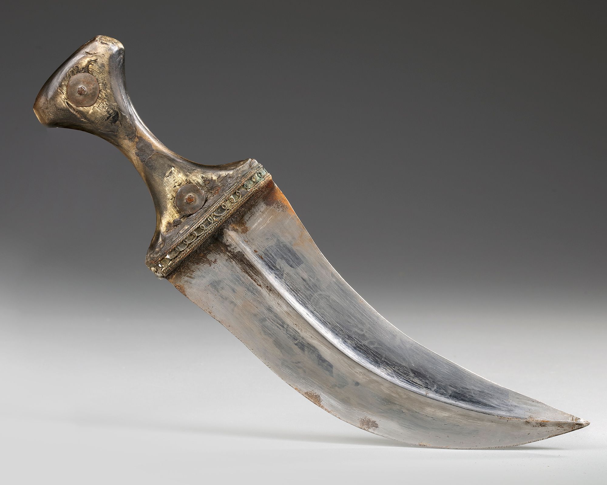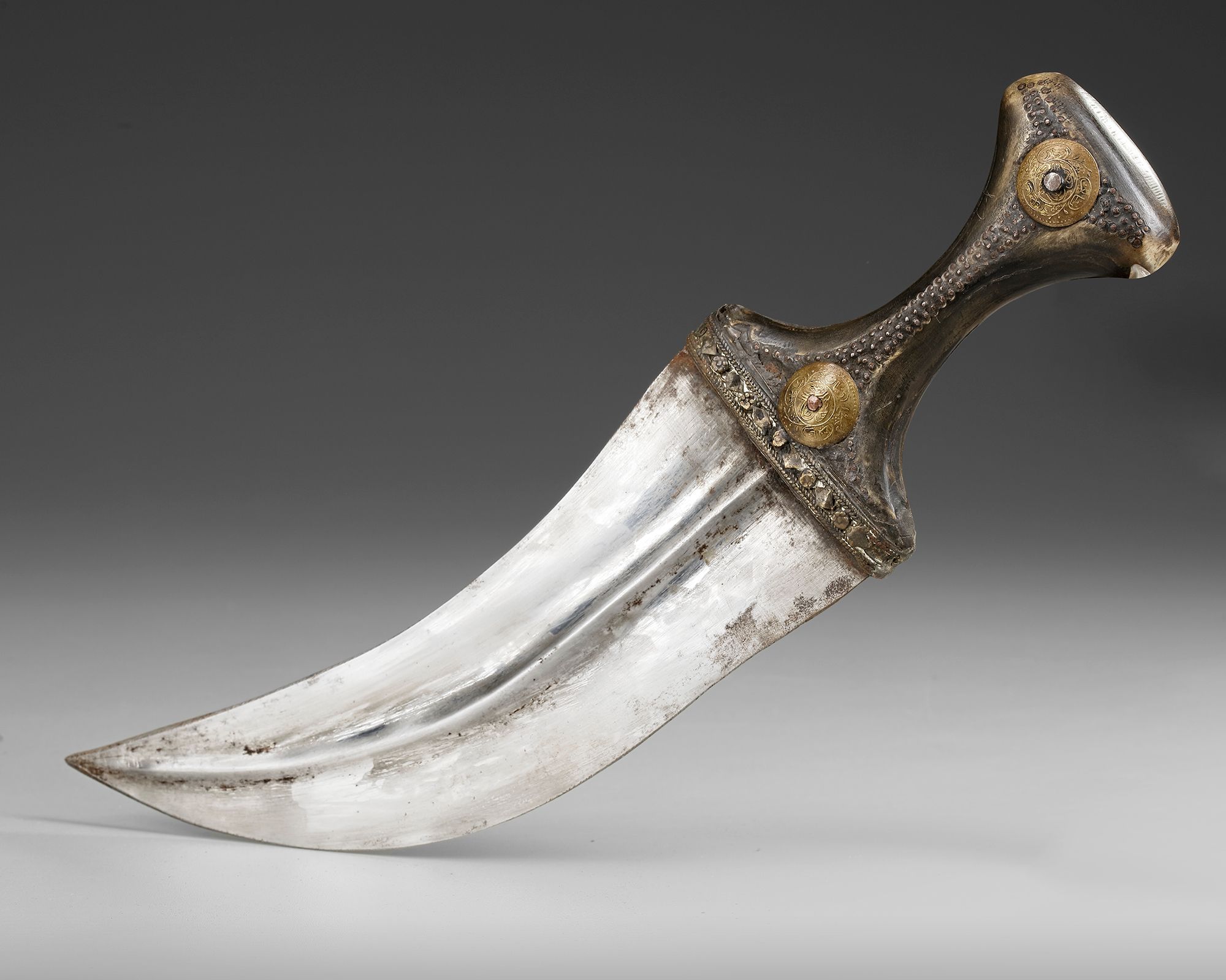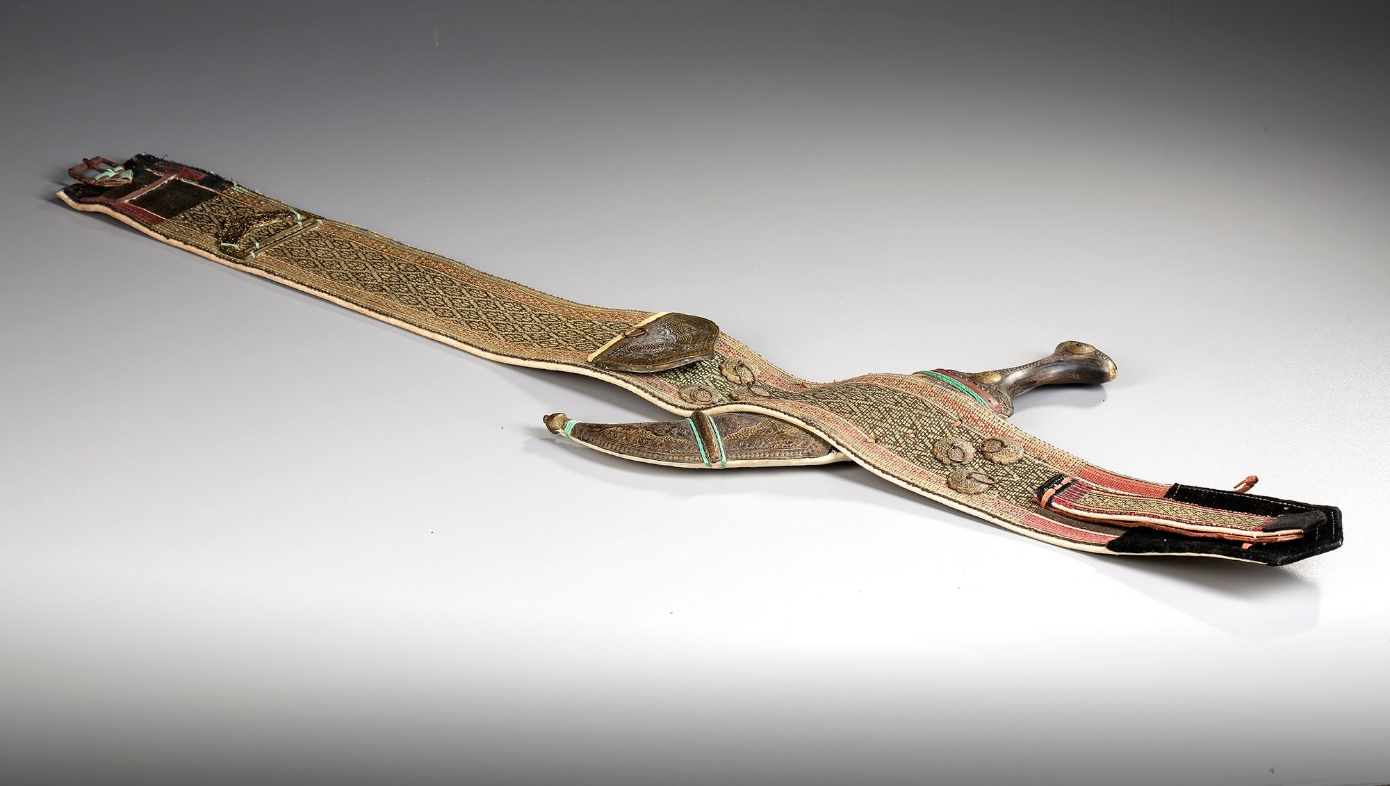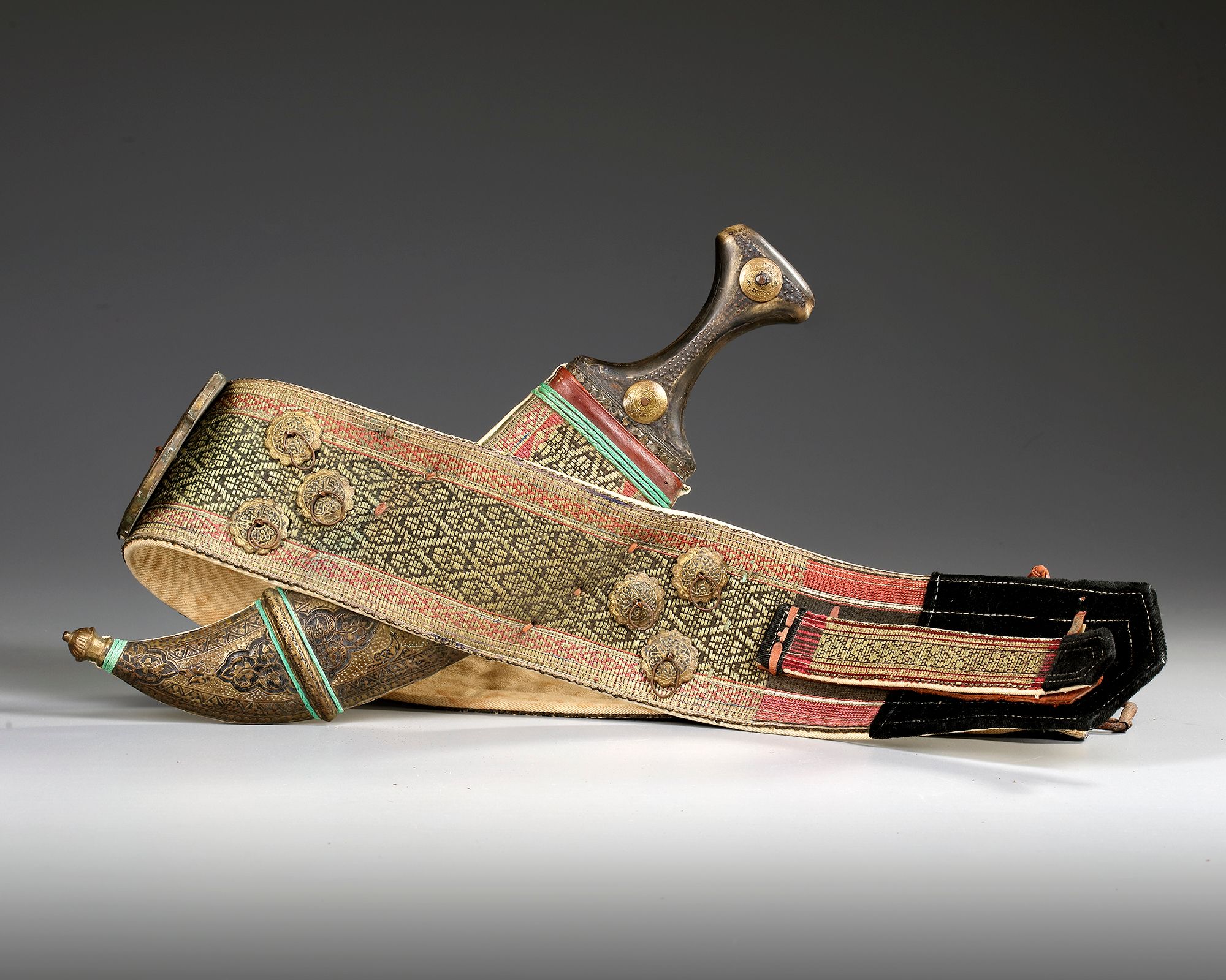 A typical Yemeni curved dagger ‘Jambiya’, of the ‘northern highlands’ type. Curved iron blade with middle ridge on both sides. The hilt consists of horn and is adorned with a brass decorative band, lines of inserted iron pins and with two round ornamental plates made of brass. These embossed brass plates imitate ‘coins’. The sheath is made of wood and covered in leather, whilst the wide leather belt is cloaked in fabric with typical Yemeni embroidery of polychrome leafy tendrils.