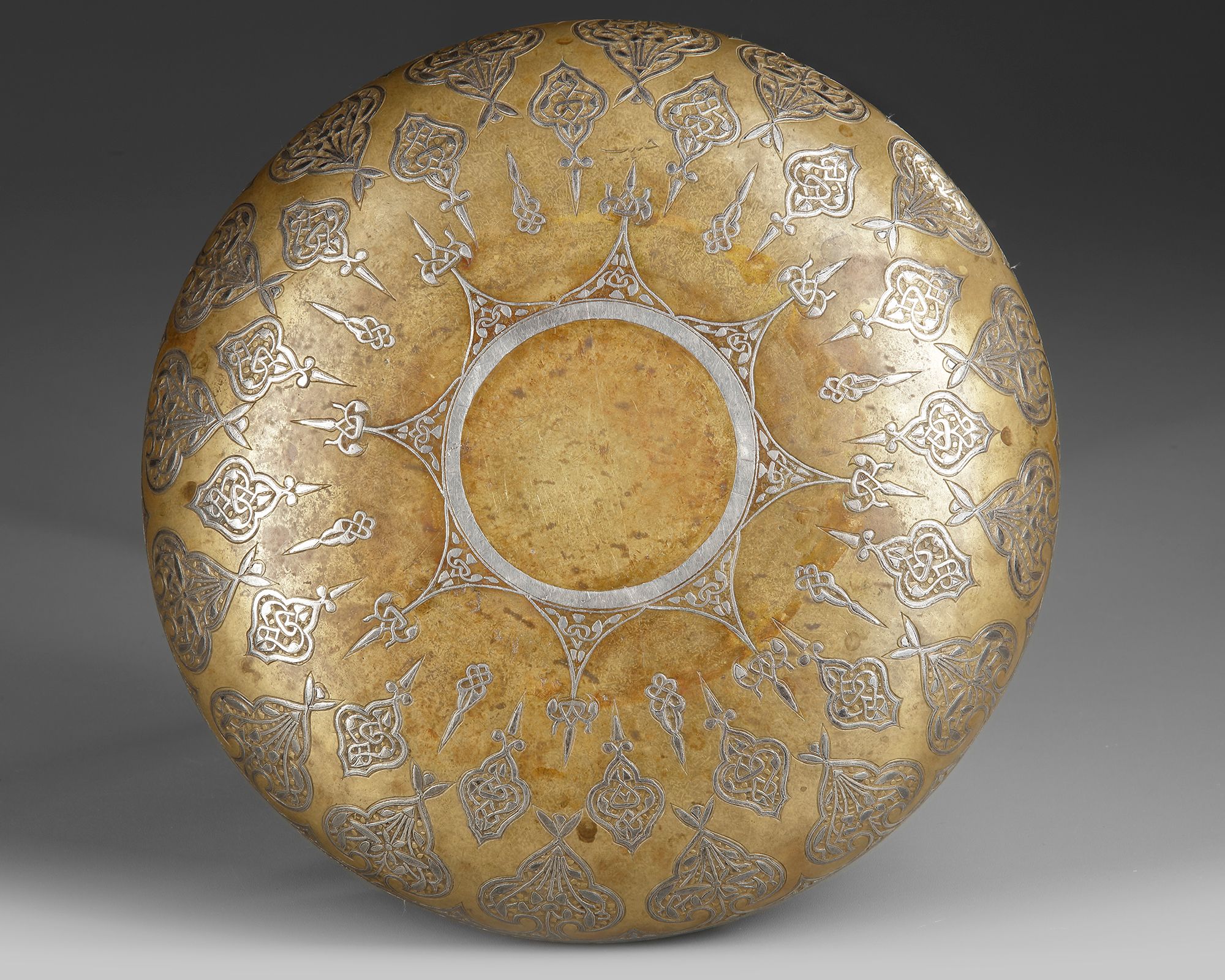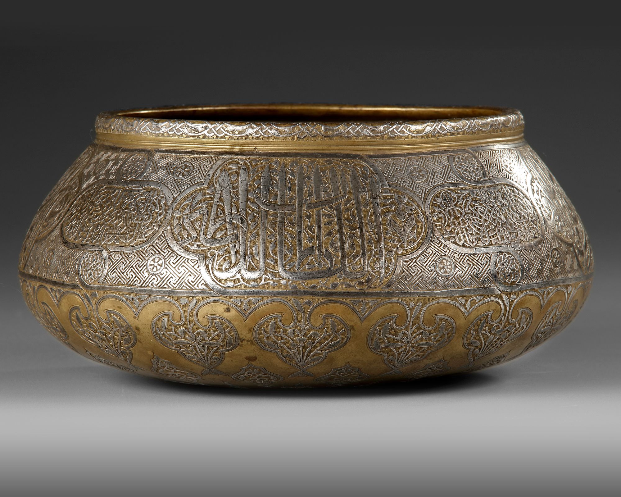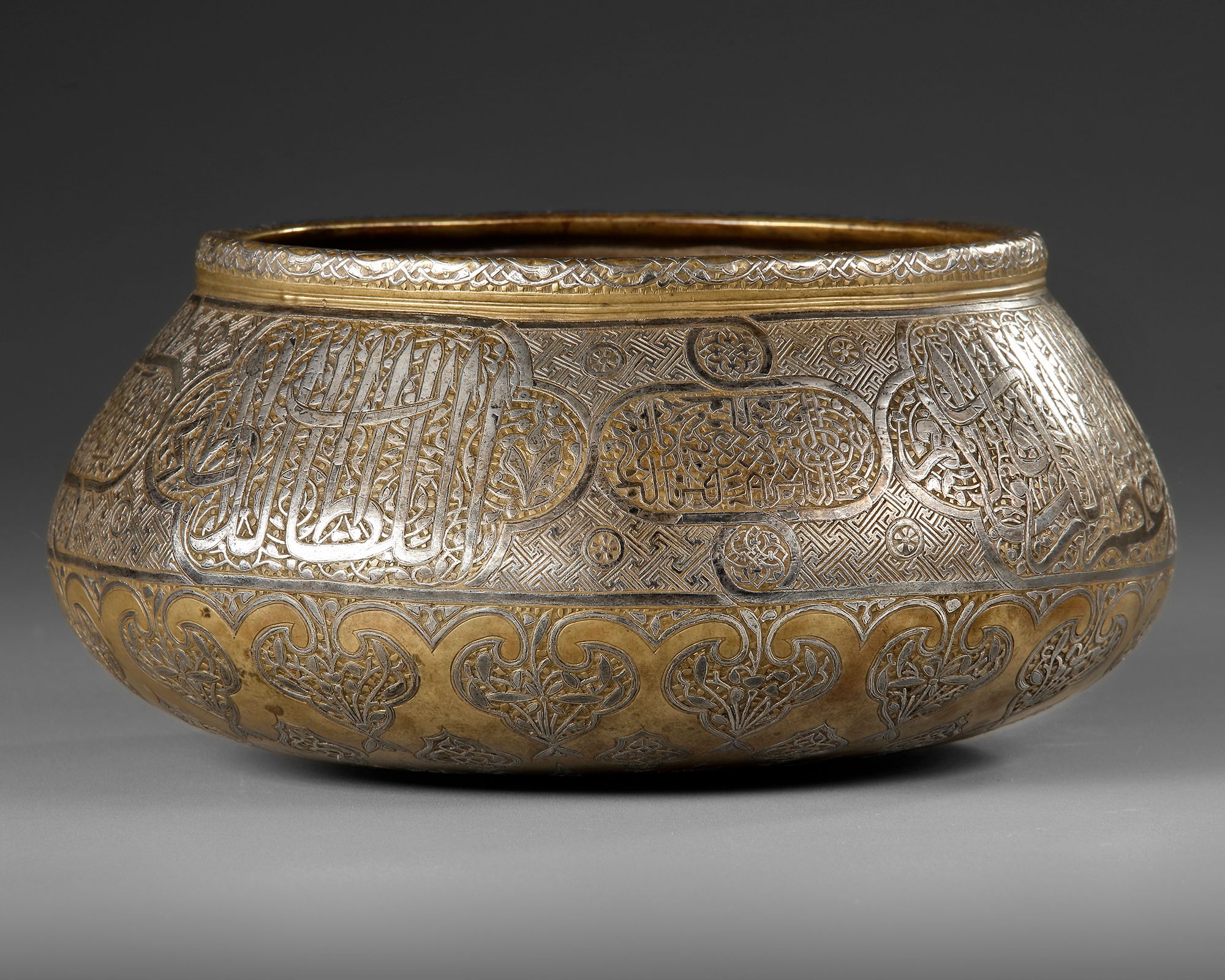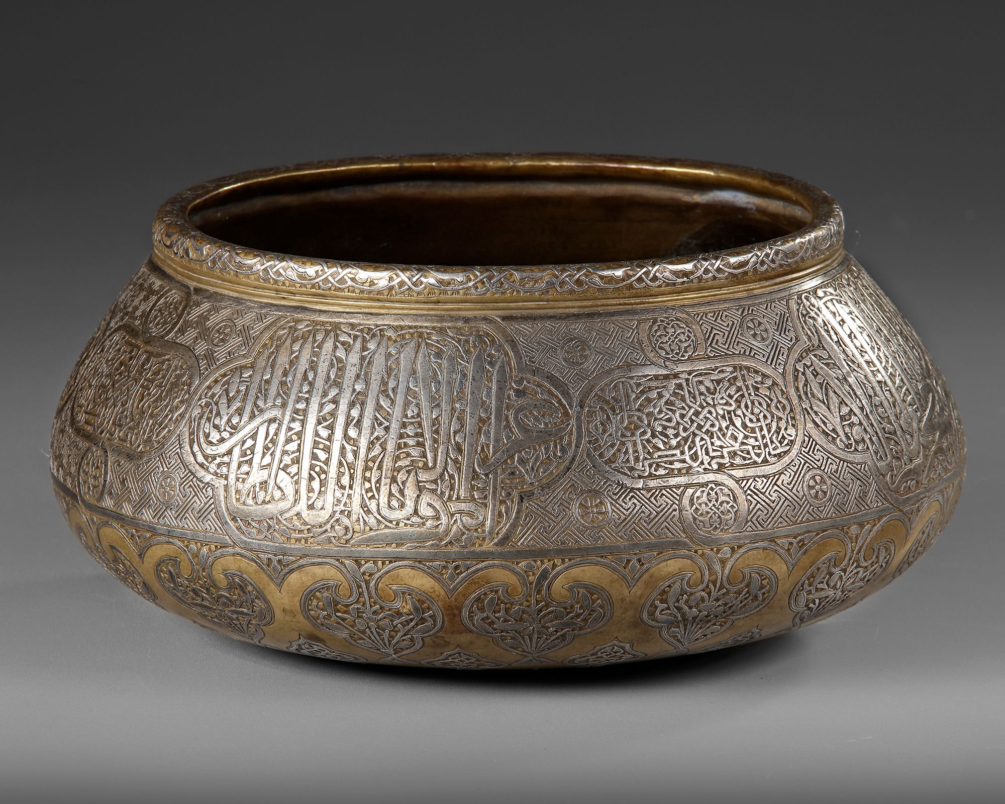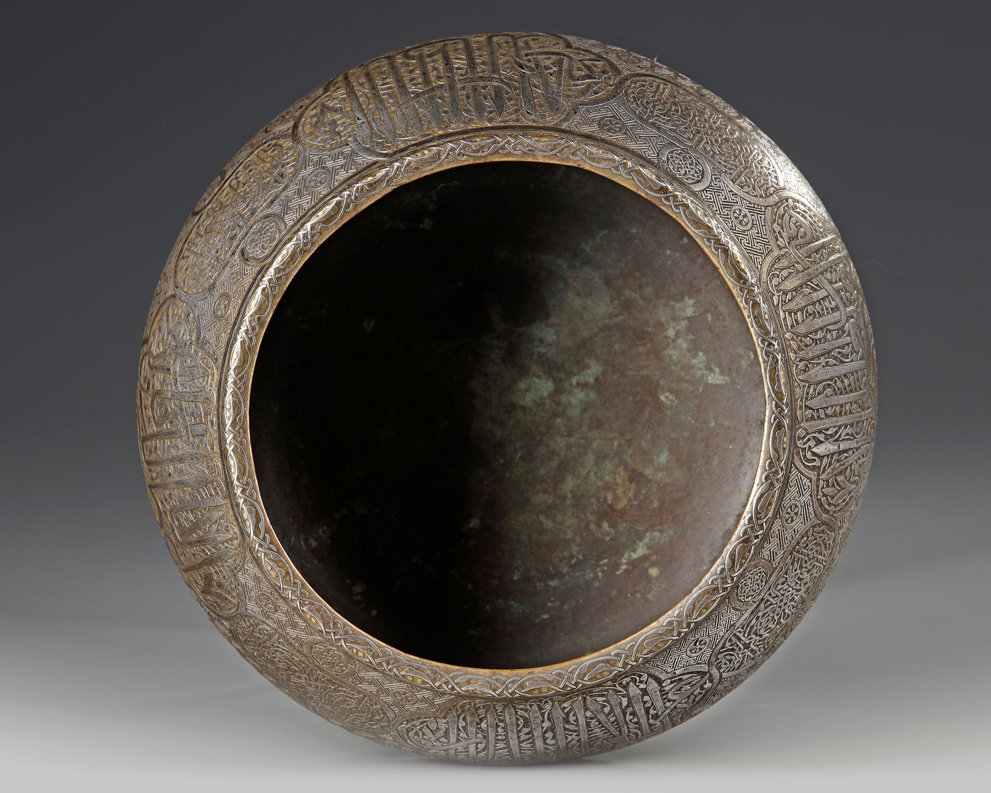 A brass basin with compressed body, decorated around the body with silver inlaid poly lobed medallion enclosing elegant inscriptions in large thuluth script on a geometric silver inlaid ground. Green patina inside Silver inlay with an old restoration. A few missing silver inlay mainly to the inscription. The base is entirely decorated