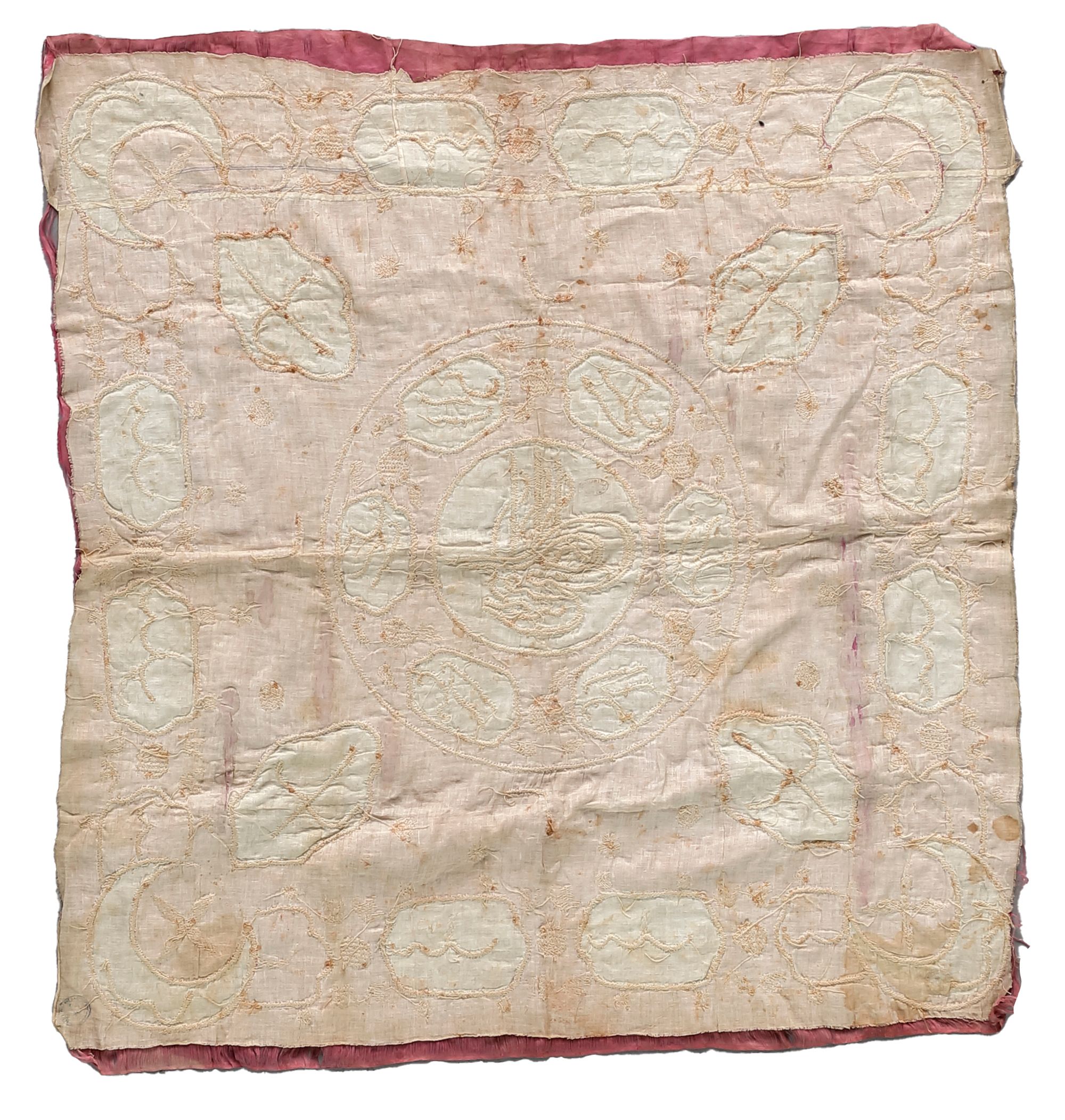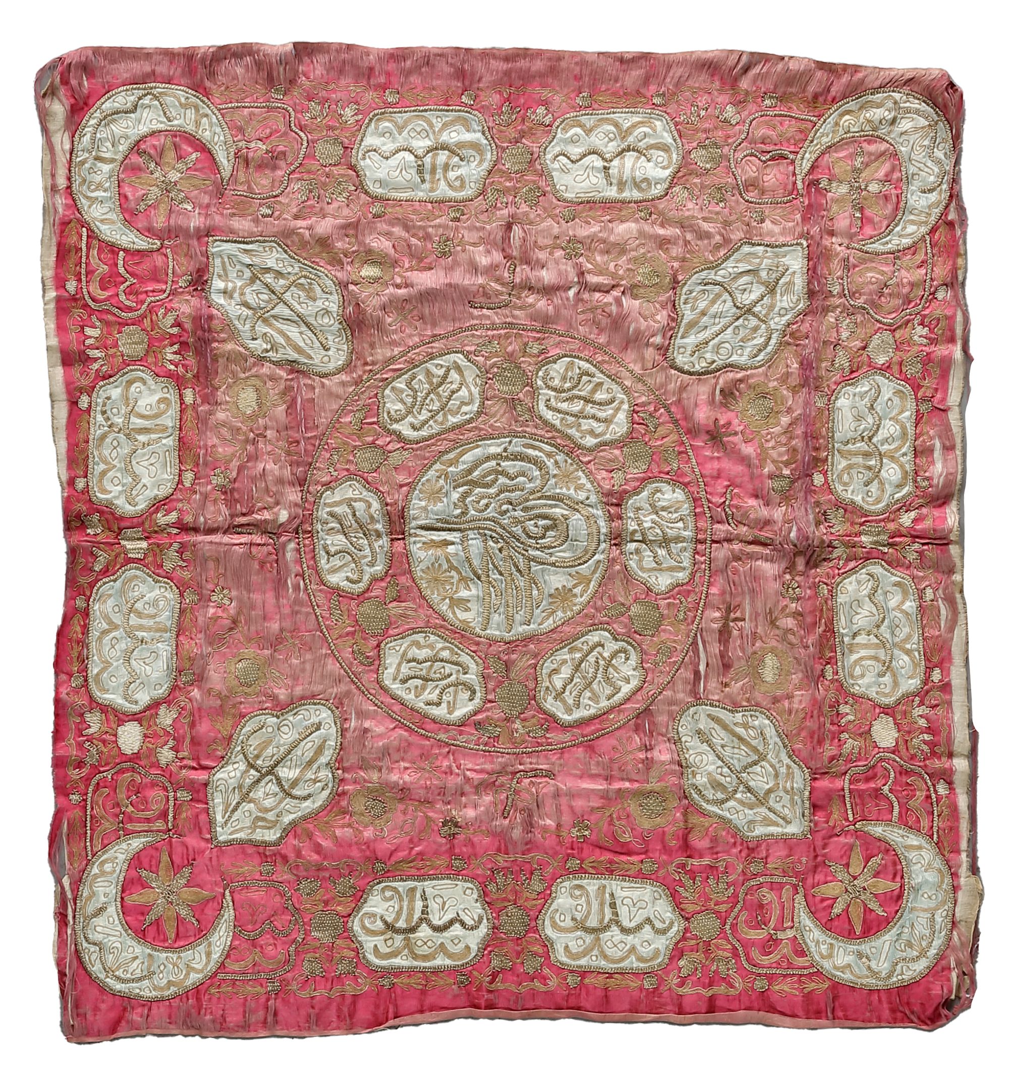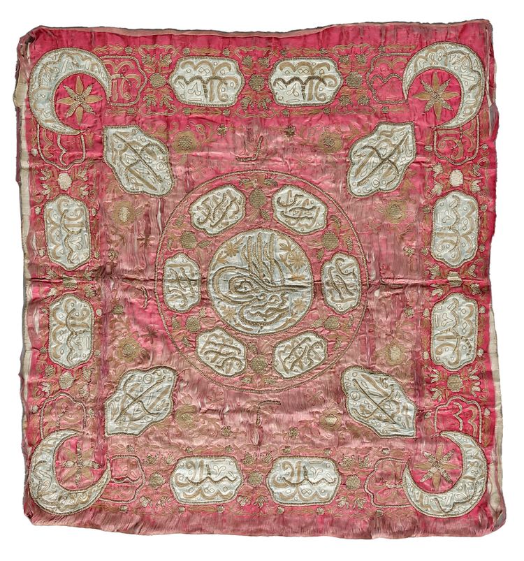 An Ottoman embroidered wrapping cloth bohca, Of rectangular form, emroidered in gilt threads a central roundel enclosing the tughra of Abdulhamid surrounded by cartouches of calligraphies in Ottoman Arabic script on a deep red silk ground. In Ottoman society, a bohca was used as a wrapping cloth. Some were used to wrap domestic items in and others were used as a traveling cushion. 120 by 110 cm.