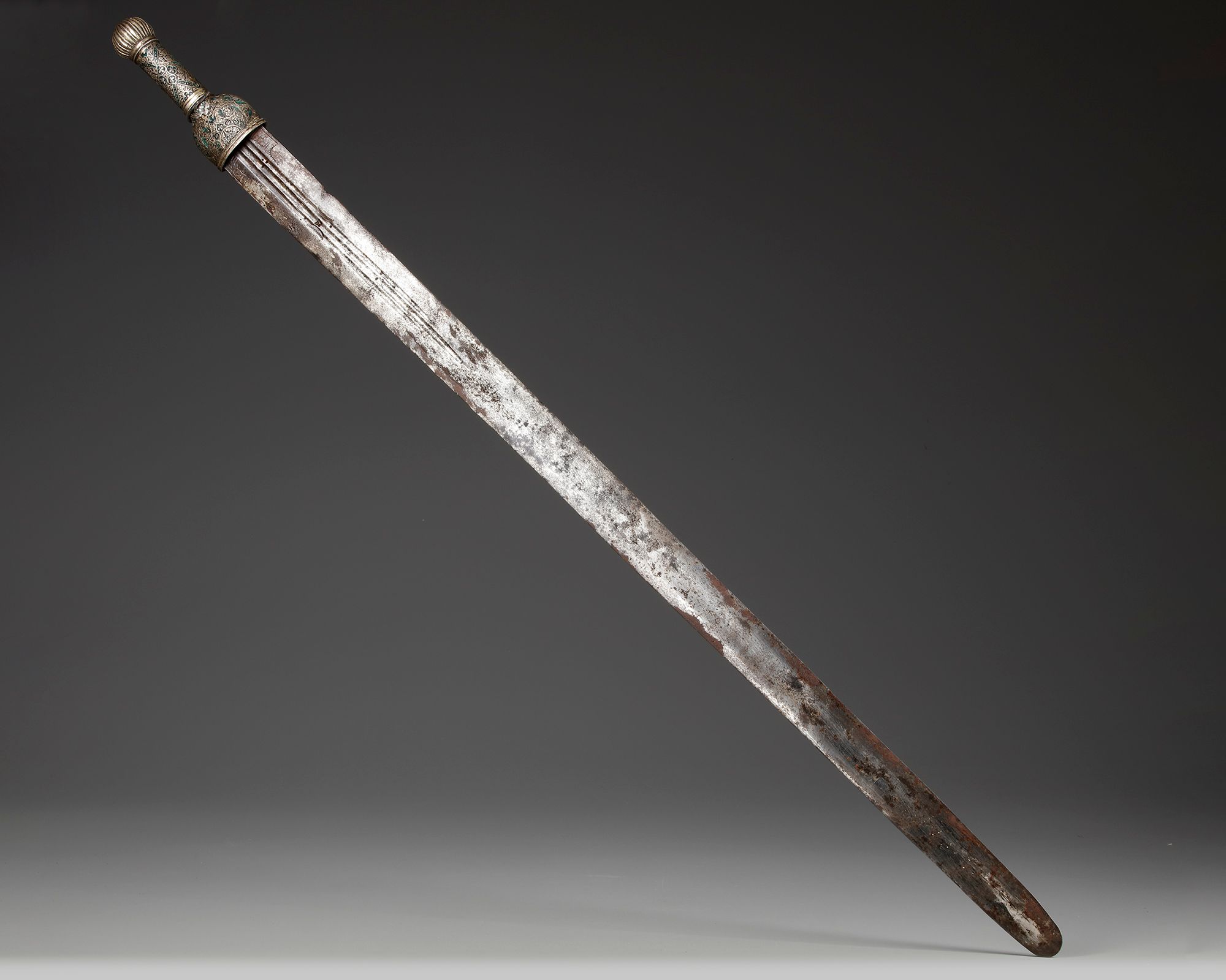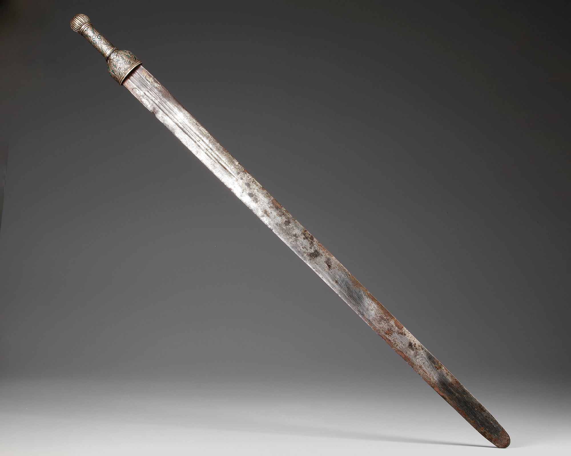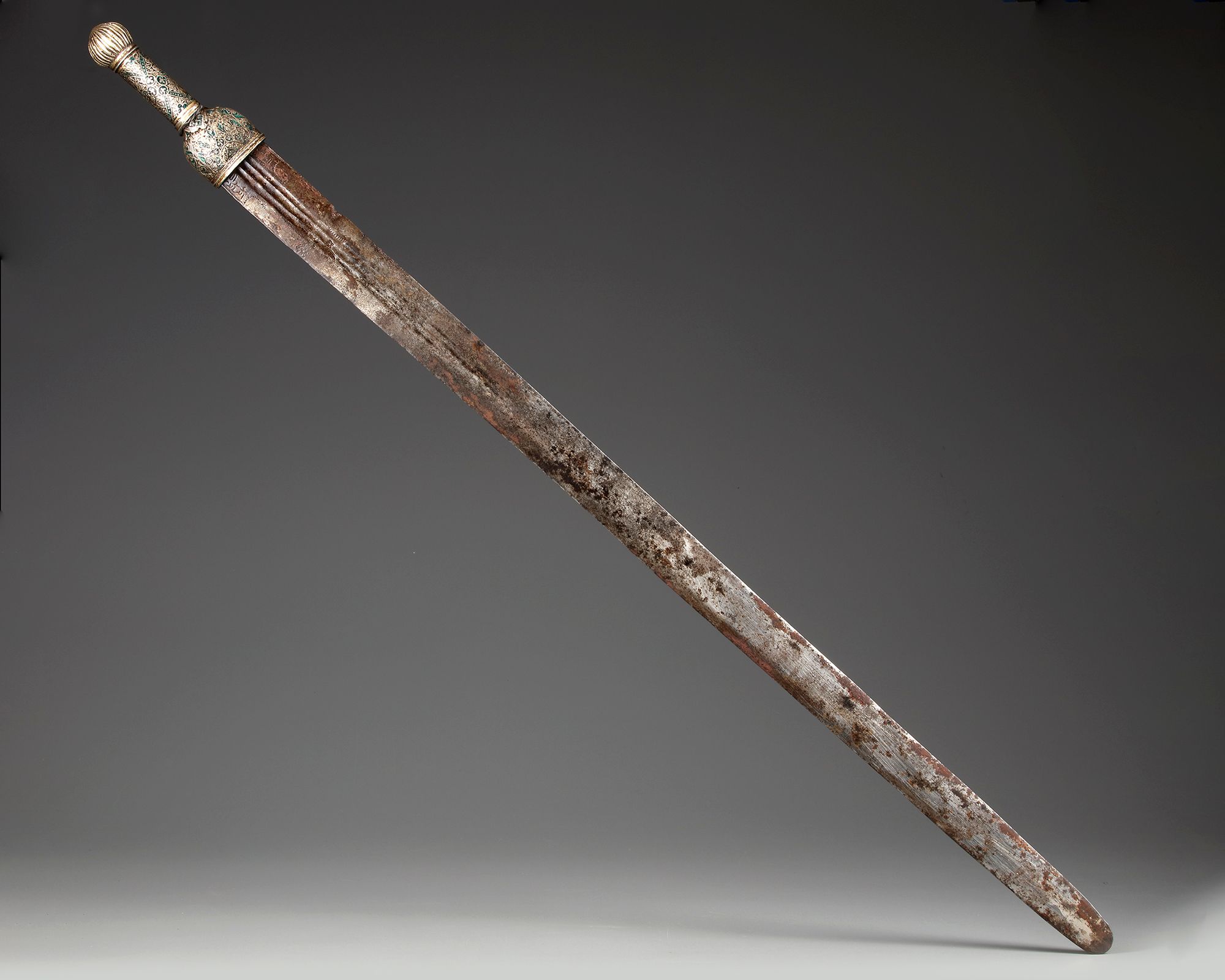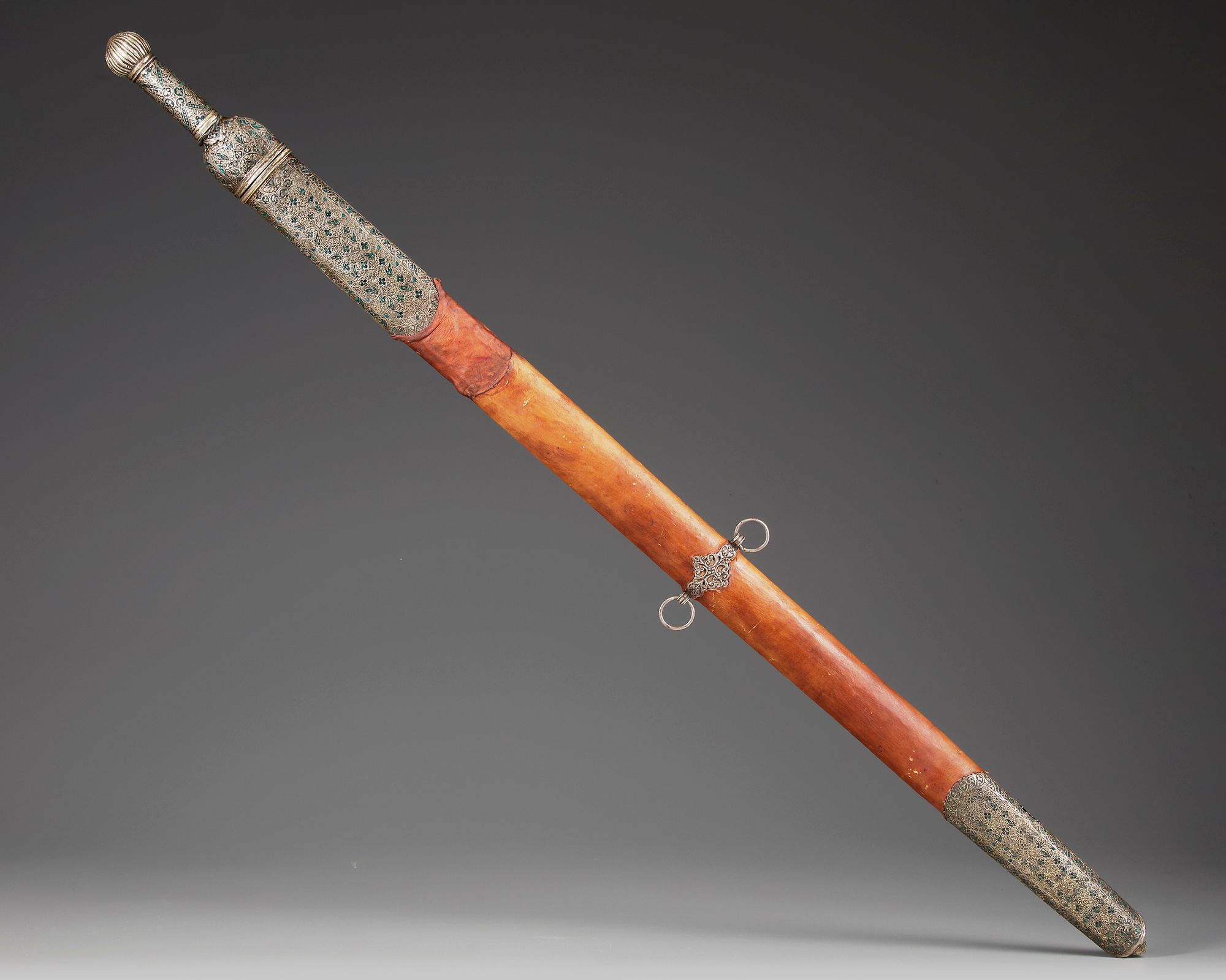 A sword (saif) with flat slightly tapering double-edged blade, on one side with inscriptions in naskh script, the green mina enameled silver hilt with ribbed pommel, the guard and the grip carved with floral decorations. The leather covered scabbard body with two belt attachment rings, the locket and chape with a similar green mina enameled and silver carved decoration with traces of gilding.