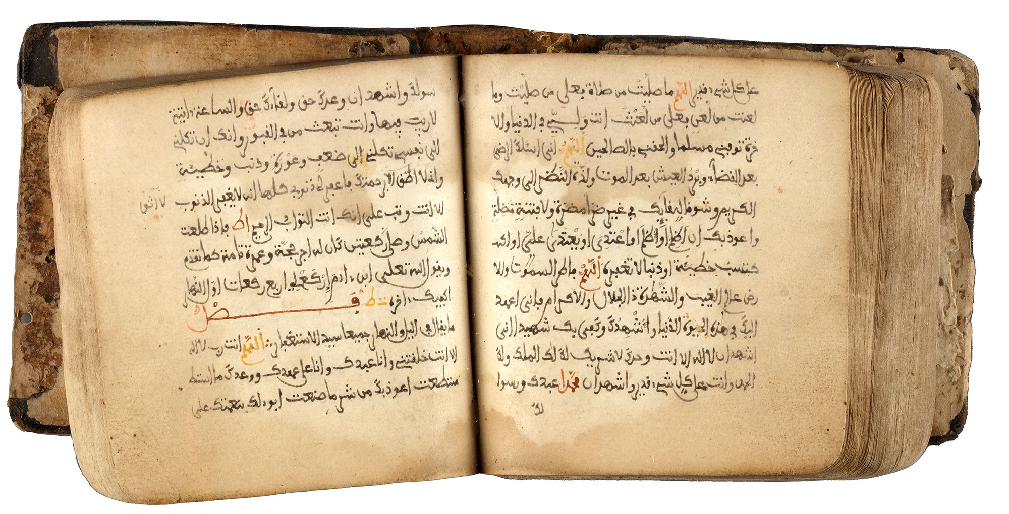 Arabic manuscript on paper, approximately 8-11 lines to the page, written in Maghribi script in black, red or yellow, various diagrams and charts, titles and important sentences written in red and polychrome, in a brown leather stamped binding.