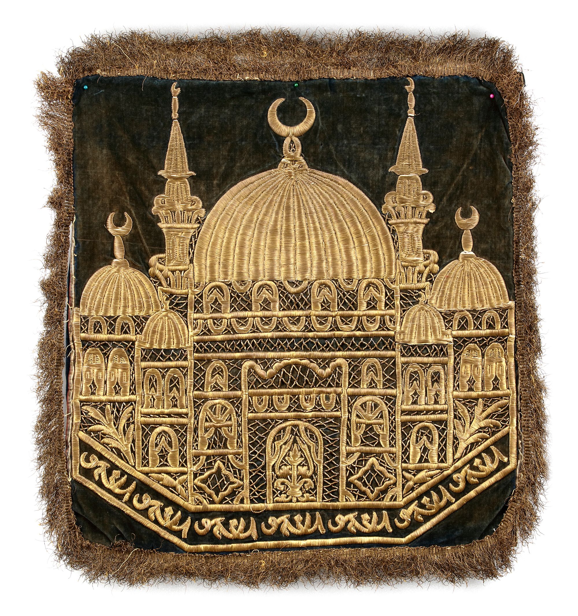 An Ottoman hanging panel, embroidered in gilt threads on a black silk ground with the Mosque of Sultan Ahmed. 42 by 45 cm.