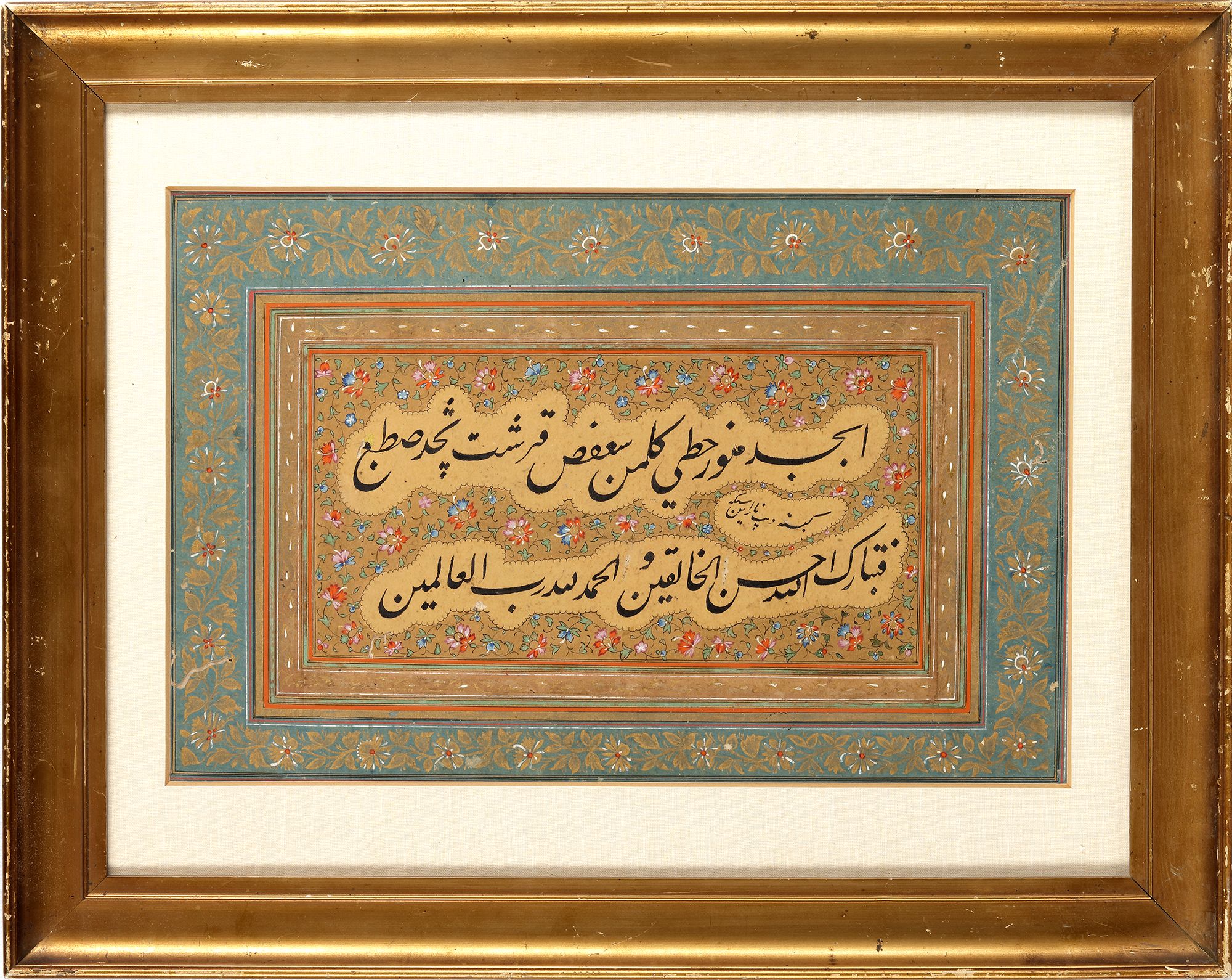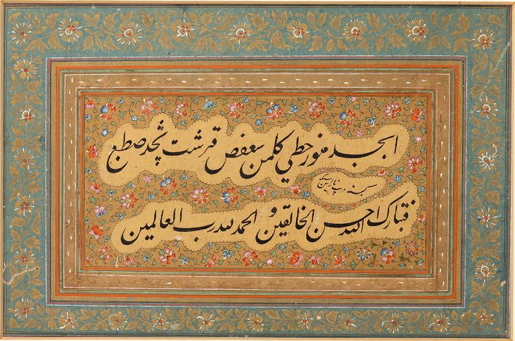 Persian text, two lines elegant black nastaliq script within clouds on gold and polychrome ground, the outer border heavily gilt and decorated with floral sprays on a blue ground.