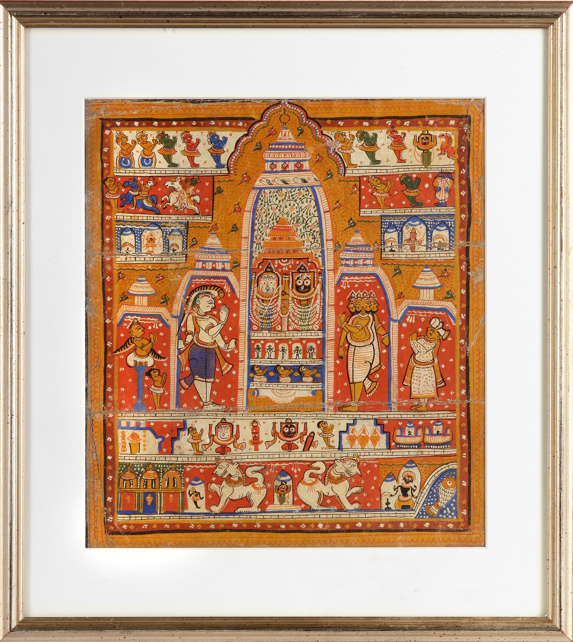 Pigments on pata or cloth, depicting symbolic representations of the ritual topography of city-temple, pilgrimage souvenirs painted by the hereditary citrakaras or painters associated with the great temple of Jagannath at Puri in Orissa in eastern India. The earliest known by far is one in the Victoria and Albert Museum dated 1670.