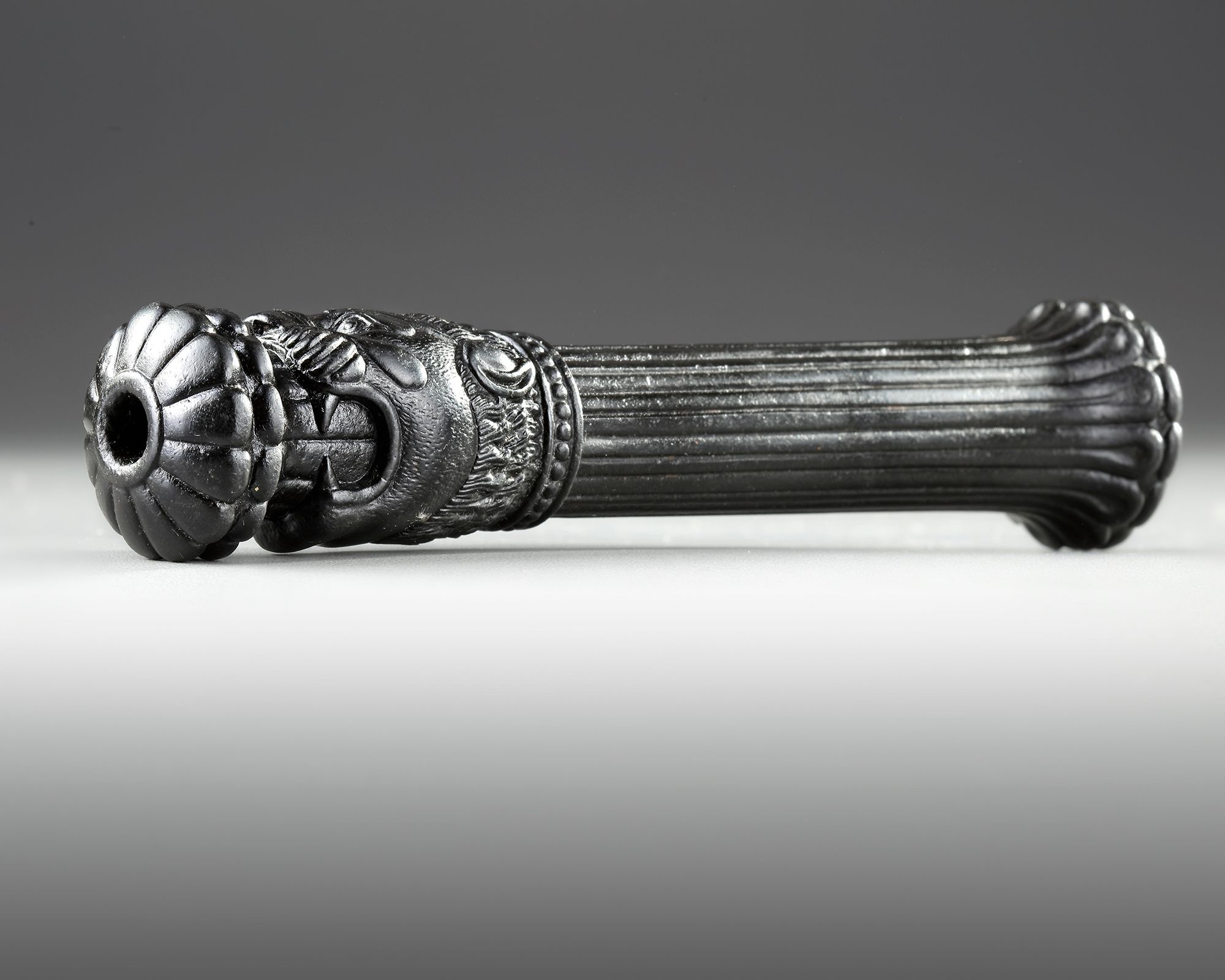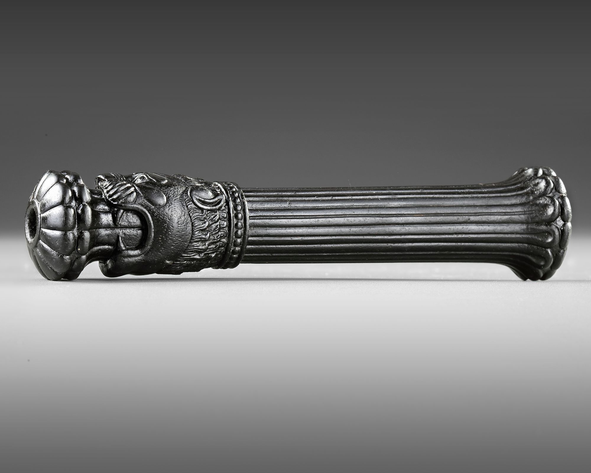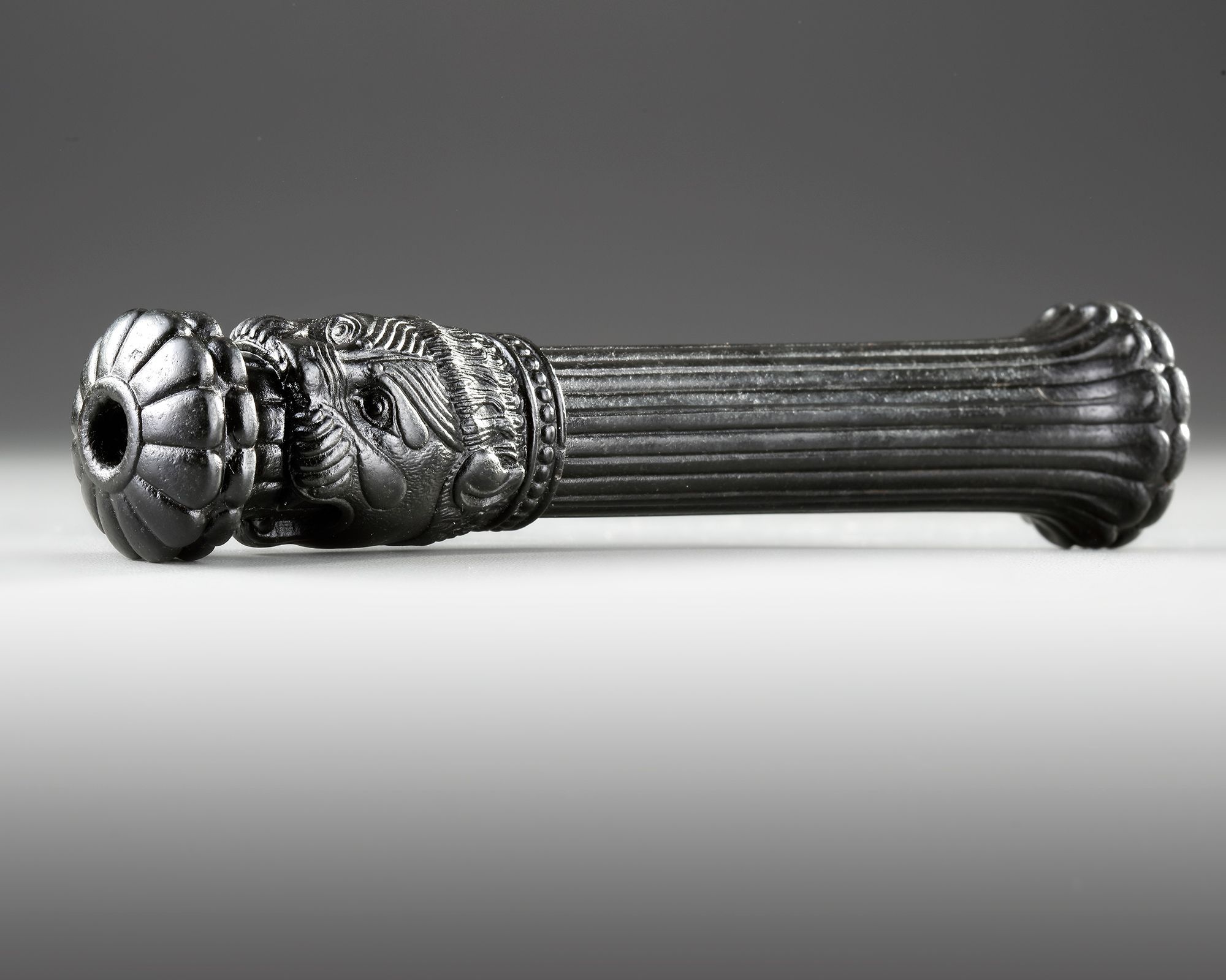 An Achaemenid basalt cylindrical sceptre with a lion's head finial spouting a lotus flower from its mouth. The shaft of the sceptre is grooved and expands to a rounded base which itself is divided into segments. At the top of the lotus flower the base is mirrored and is pierced by a deep hole which must have held a lotus flower, probably in silver or gold. The reliefs at Persepolis show such scepters in the hands of the Great King and some of his attendant courtiers. It is an object of the highest quality and historical importance. Black basalt, Achaemenid 5th century BC.