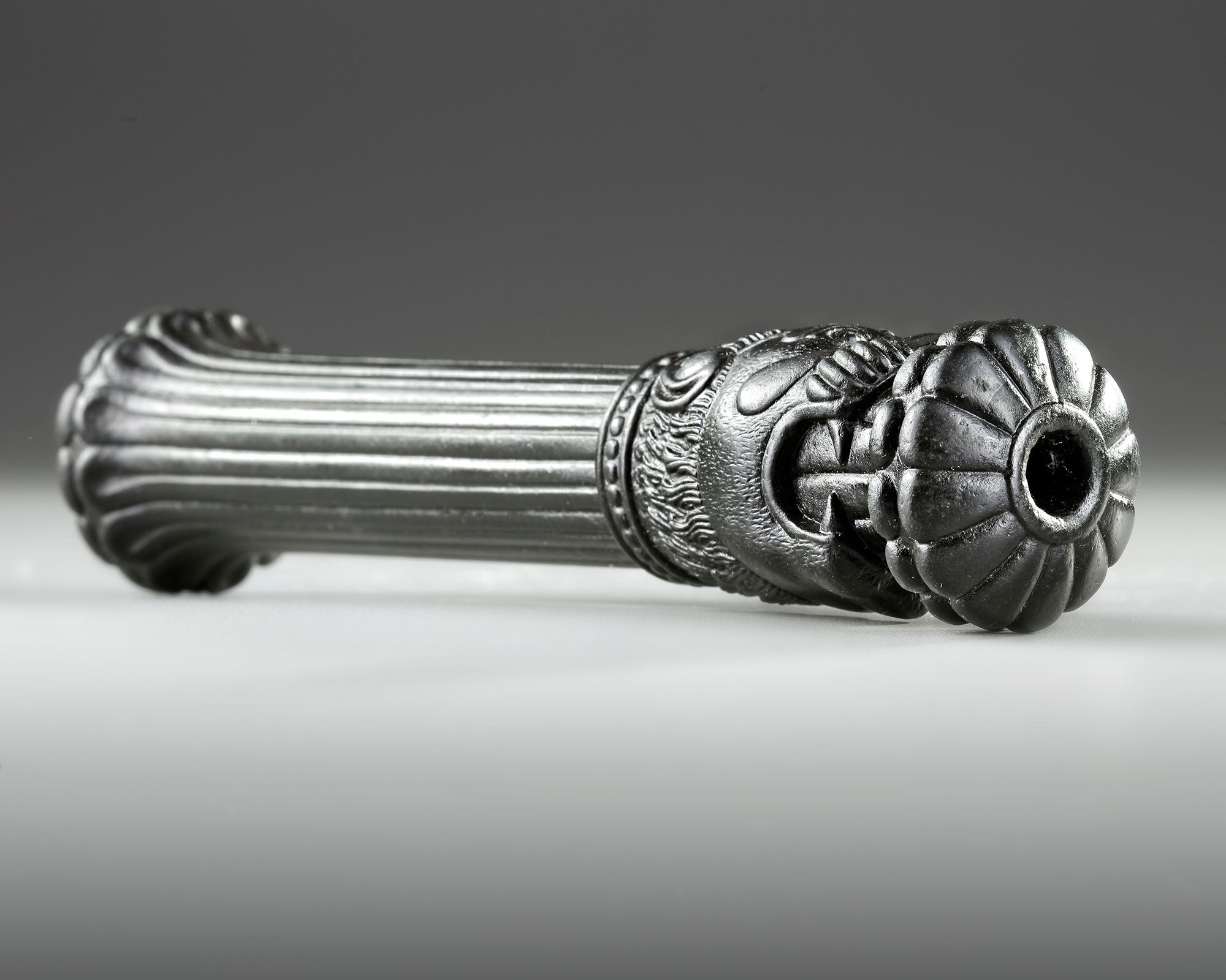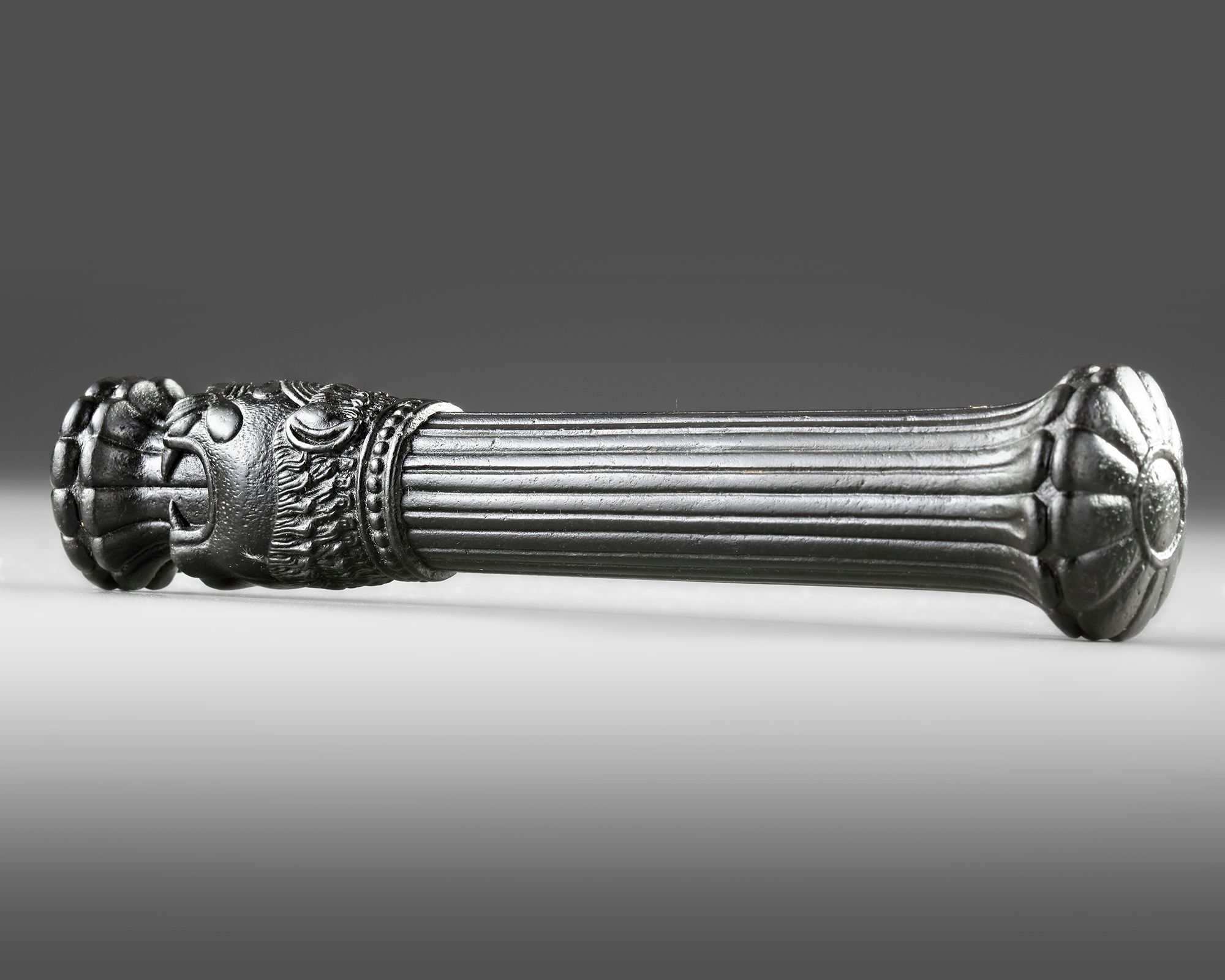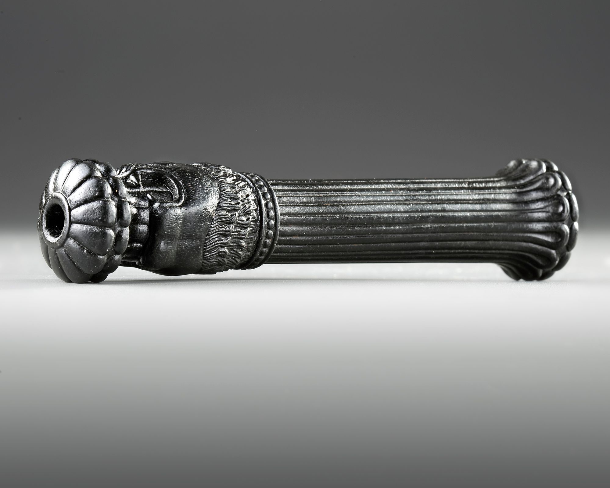An Achaemenid basalt cylindrical sceptre with a lion's head finial spouting a lotus flower from its mouth. The shaft of the sceptre is grooved and expands to a rounded base which itself is divided into segments. At the top of the lotus flower the base is mirrored and is pierced by a deep hole which must have held a lotus flower, probably in silver or gold. The reliefs at Persepolis show such scepters in the hands of the Great King and some of his attendant courtiers. It is an object of the highest quality and historical importance. Black basalt, Achaemenid 5th century BC.