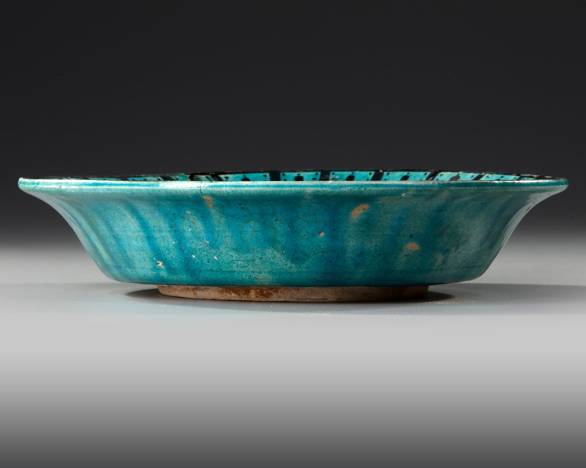 A pottery dish rising from short vertical foot through rounded body to everted rim, the interior painted in black under the glaze with a central roundel enclosing two elegant birds perched on a blossoming branch, surrounded by a diaper band of triangles.