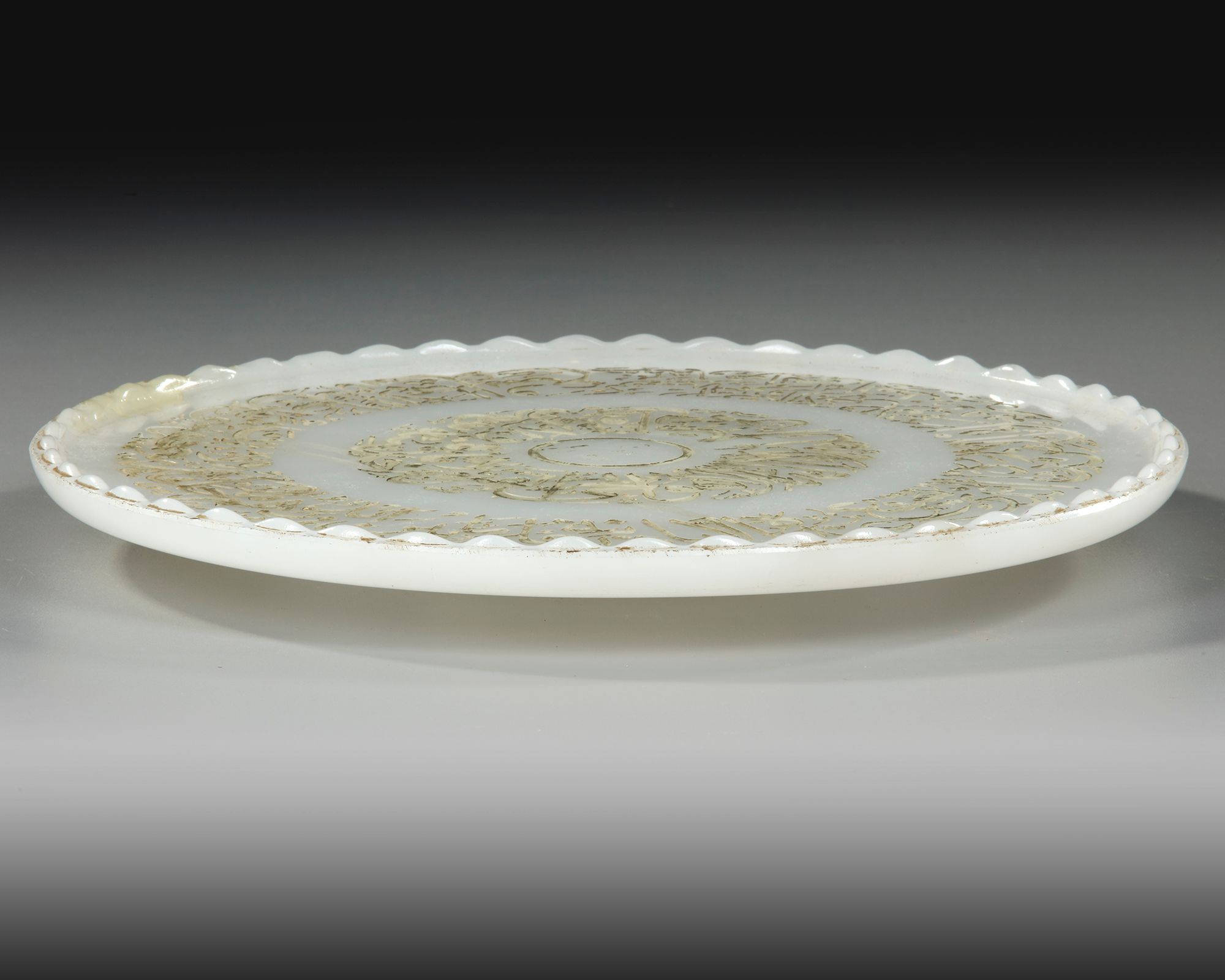 An opaline dish resting on a small foot with barbed rim, carved with two wide bands of Ayat al-Kursi from surah al-Baqraa in large thuluth script.