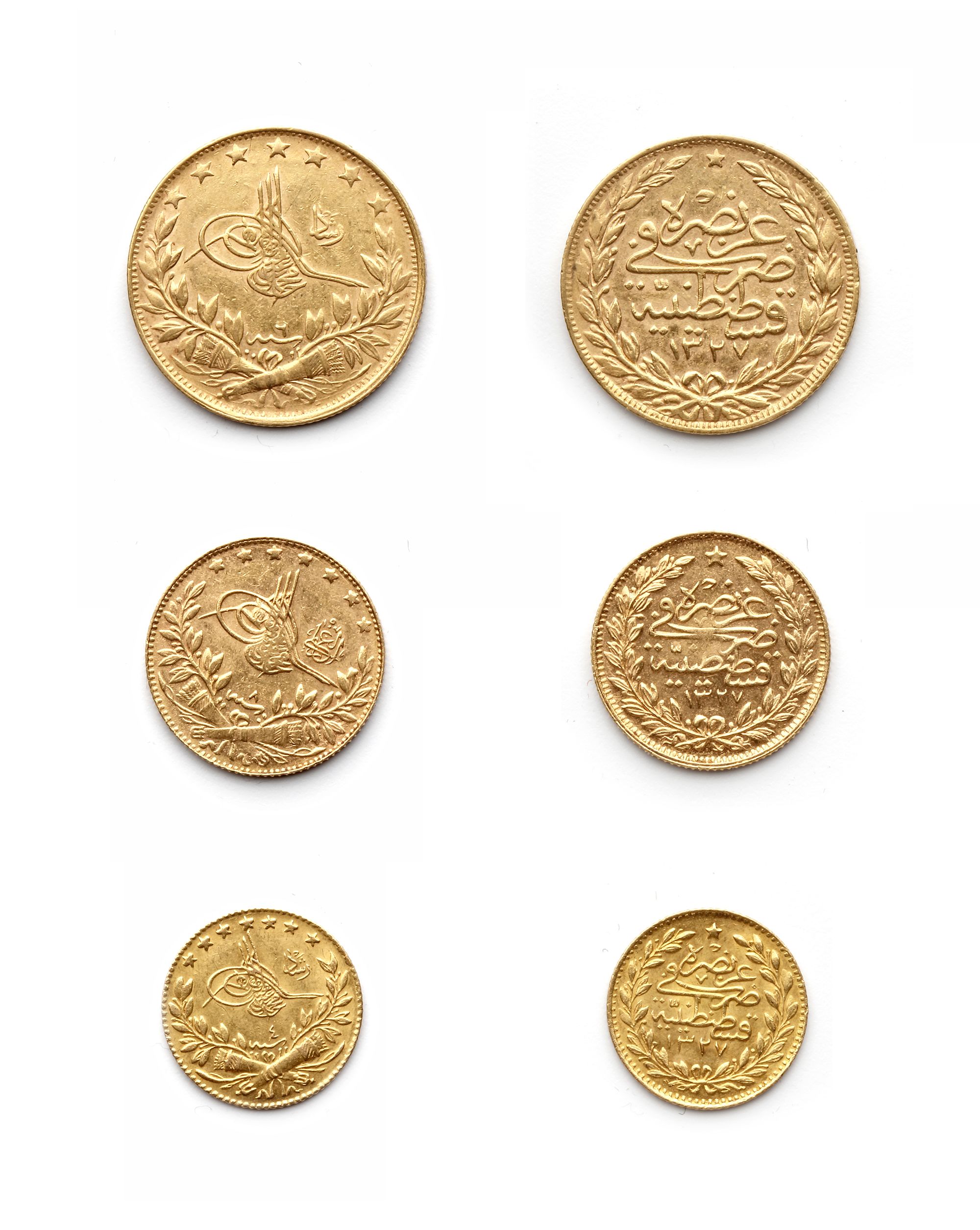 Islamic coin, Ottoman Empire, Muhammad V Rashad, AH 1327-1336 / AD 1909-1918 AV 100kurus, Qustantiniyya mint, date1327h, regnal year 6, ( 21mm, 7.3 g). About extremely fine. KM 754; Friedberg 52.