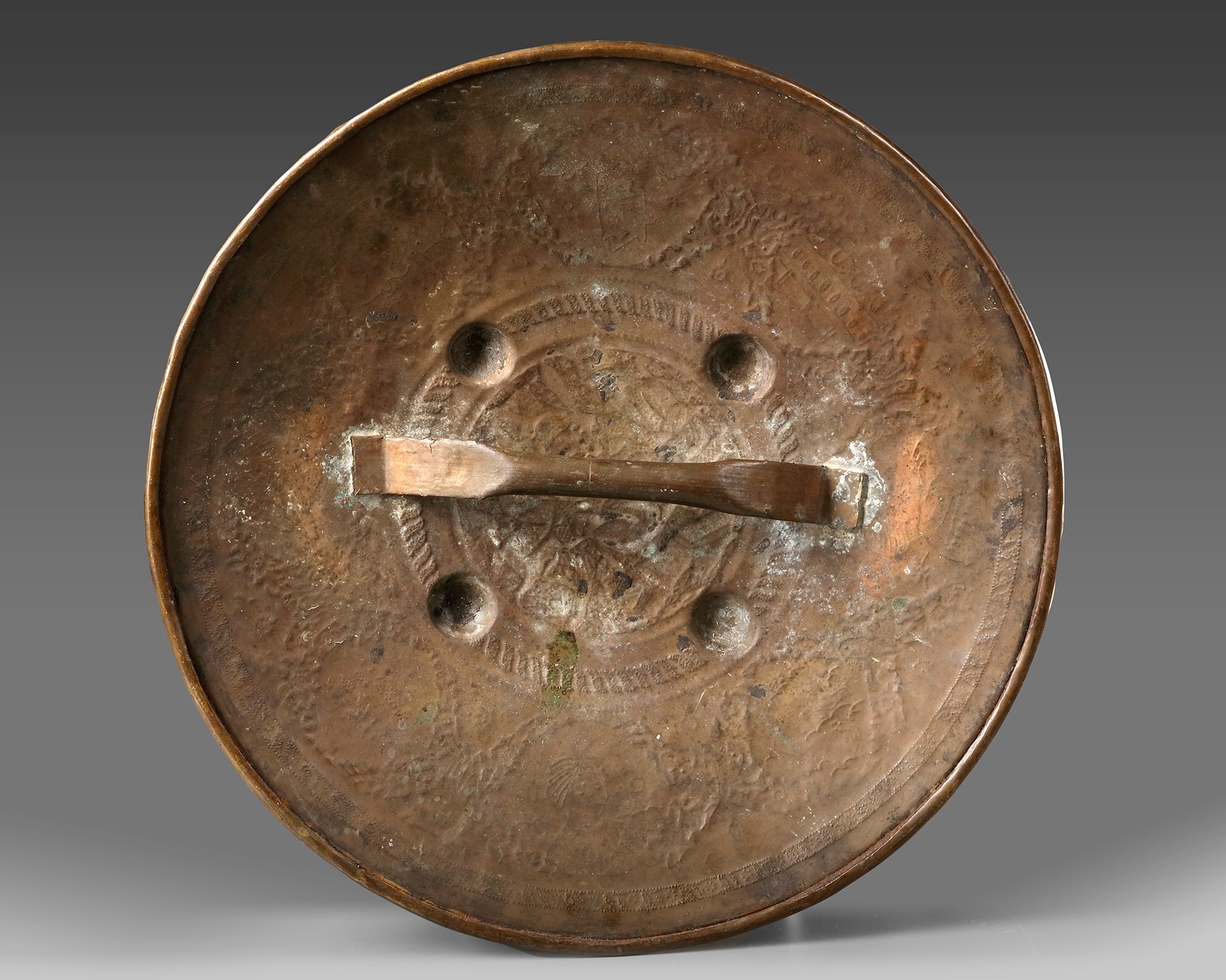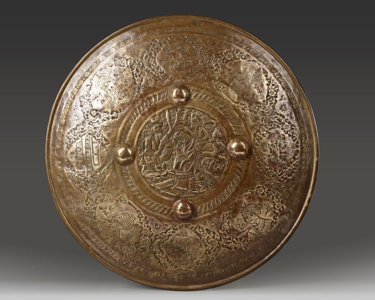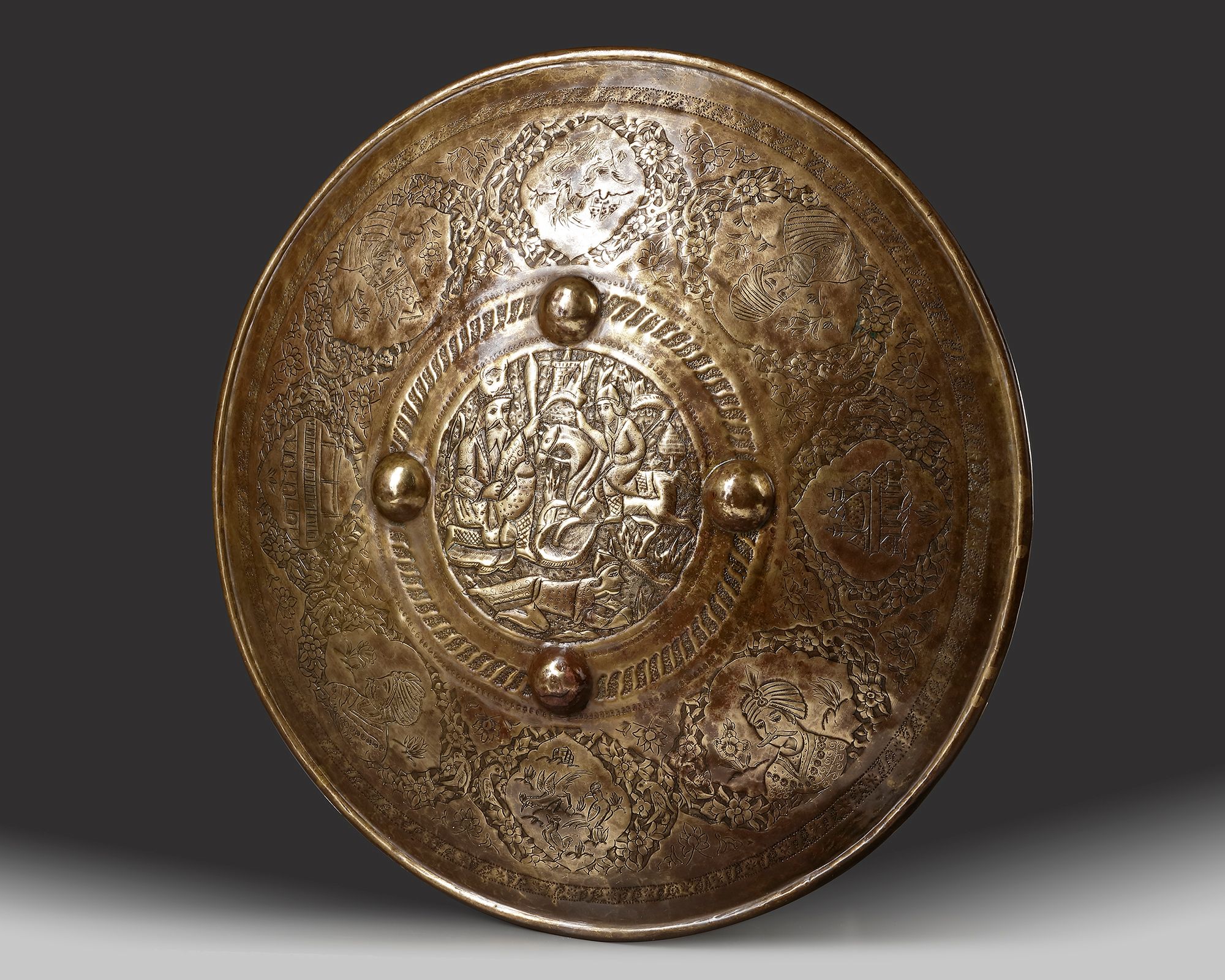 A Persian gilt copper figural shield with four bosses, the decoration deeply hammered and engraved with a central roundel enclosing Rostam in battle scene, surrounded by panels enclosing engraved Qajar rulers, mosques and birds on a ground engraved densely with birds perched amongst foliage.