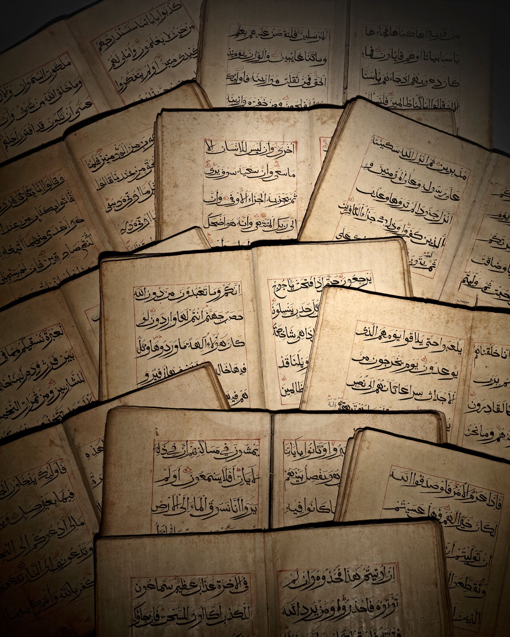 Arabic manuscript on paper, 30 volumes, 5 lines to the page, written in Sini script in black ink, verses separated by red florets, surah headings in red cursive script amidst red panels, text within red rules, tajwid and diacritics in red ink, the two opening with illuminated rectangular panels comprising three lines of text, the borders of the panels decorated with floral and geometric gold motifs.