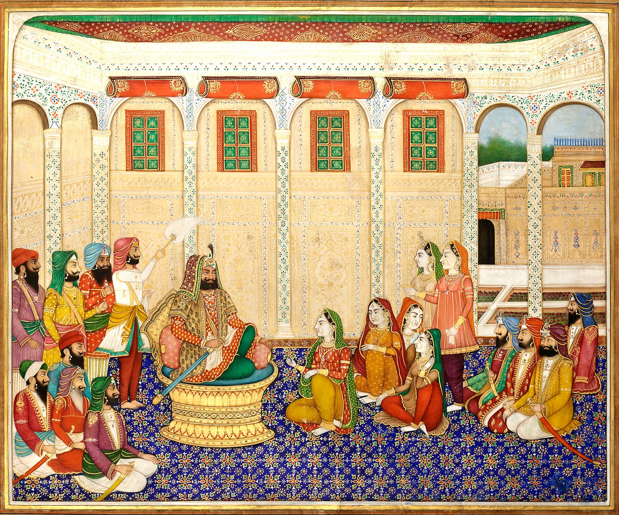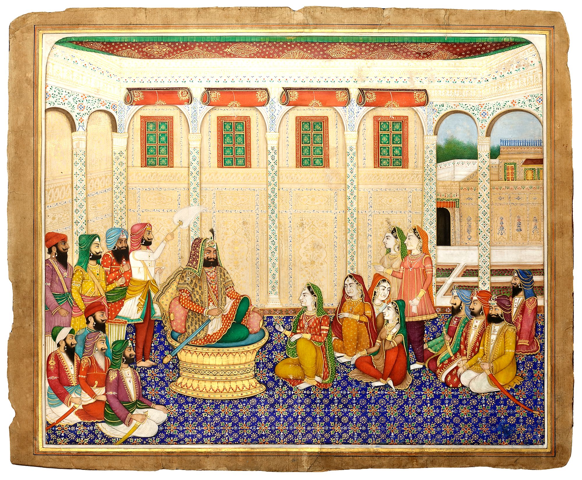 CATALOGUE NOTE This painting depicts the court of the Sikh ruler, Maharaja Sher Singh, in audience with local ladies flanked by his close circle of ministers, and attendants. He is depicted in the centre seated on his father’s famous golden throne.