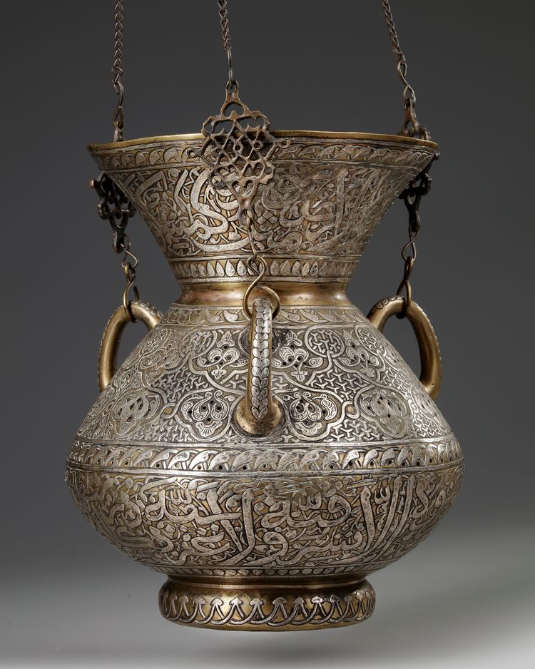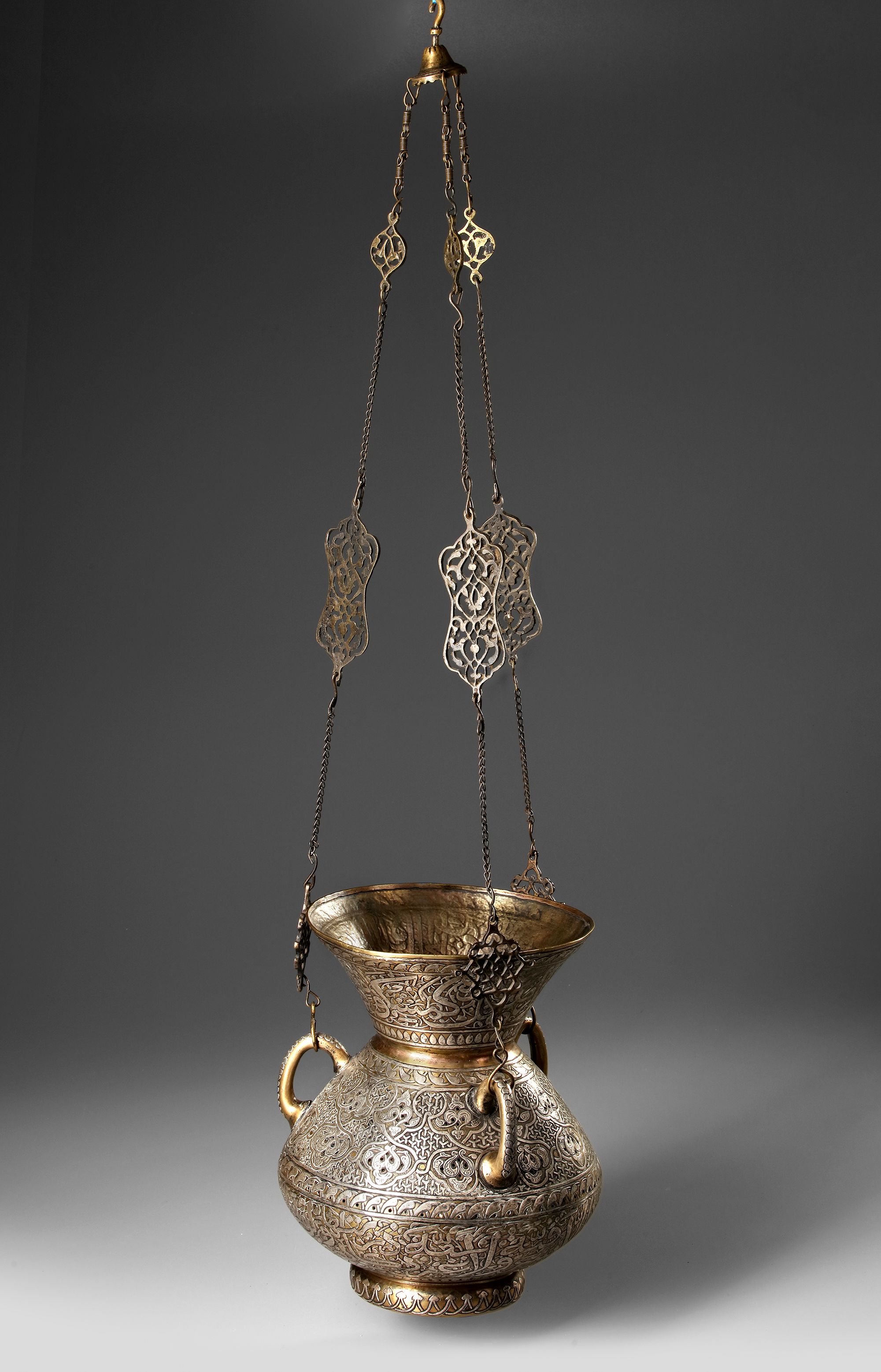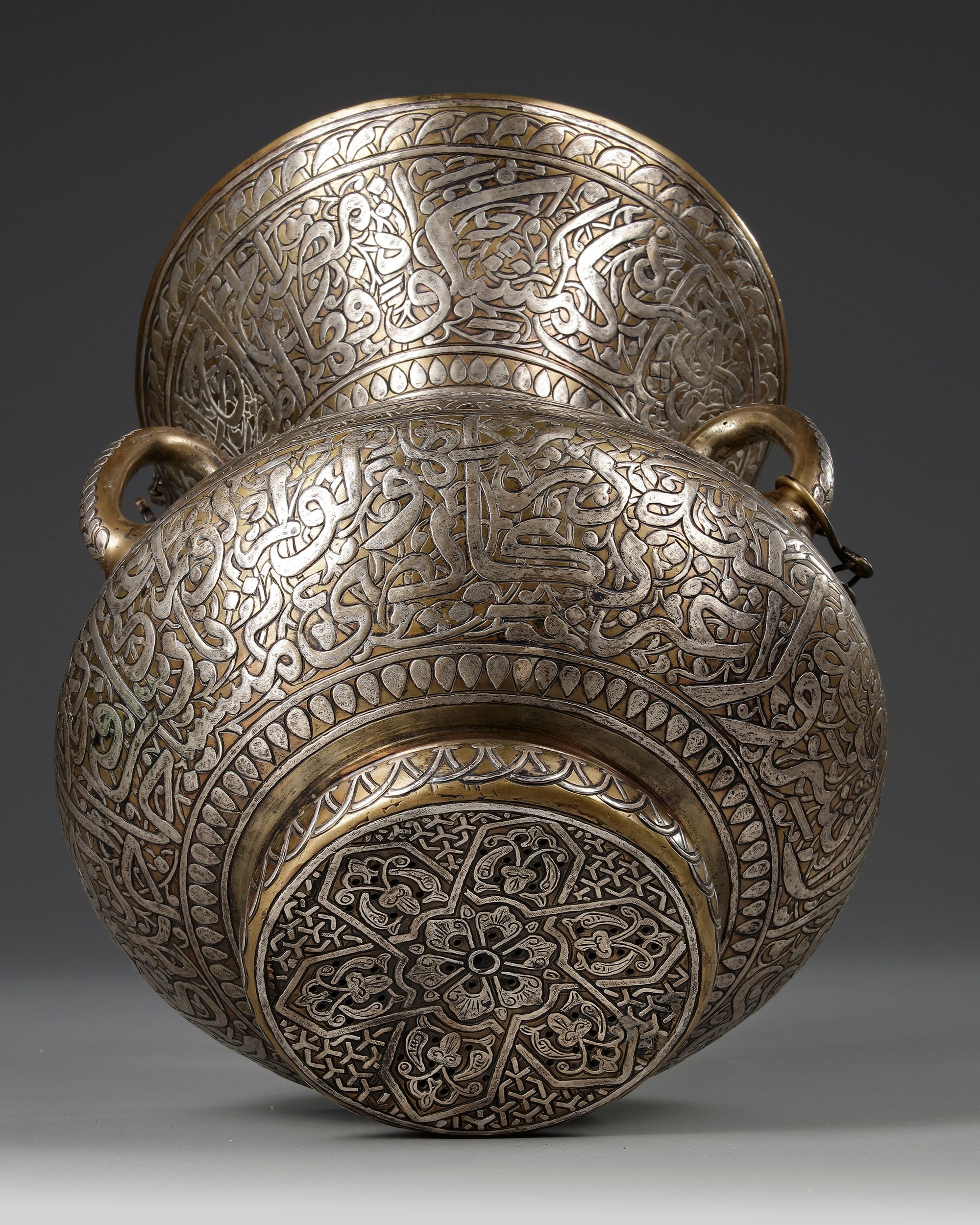 The bulbous body on a small foot with long flaring neck and lug handles around the body, decorated around the body with a wide band of pierced and silver inlaid floral leafy sprays, the flaring mouth and the lower part of the body with a band of large inscriptions in thuluth script.