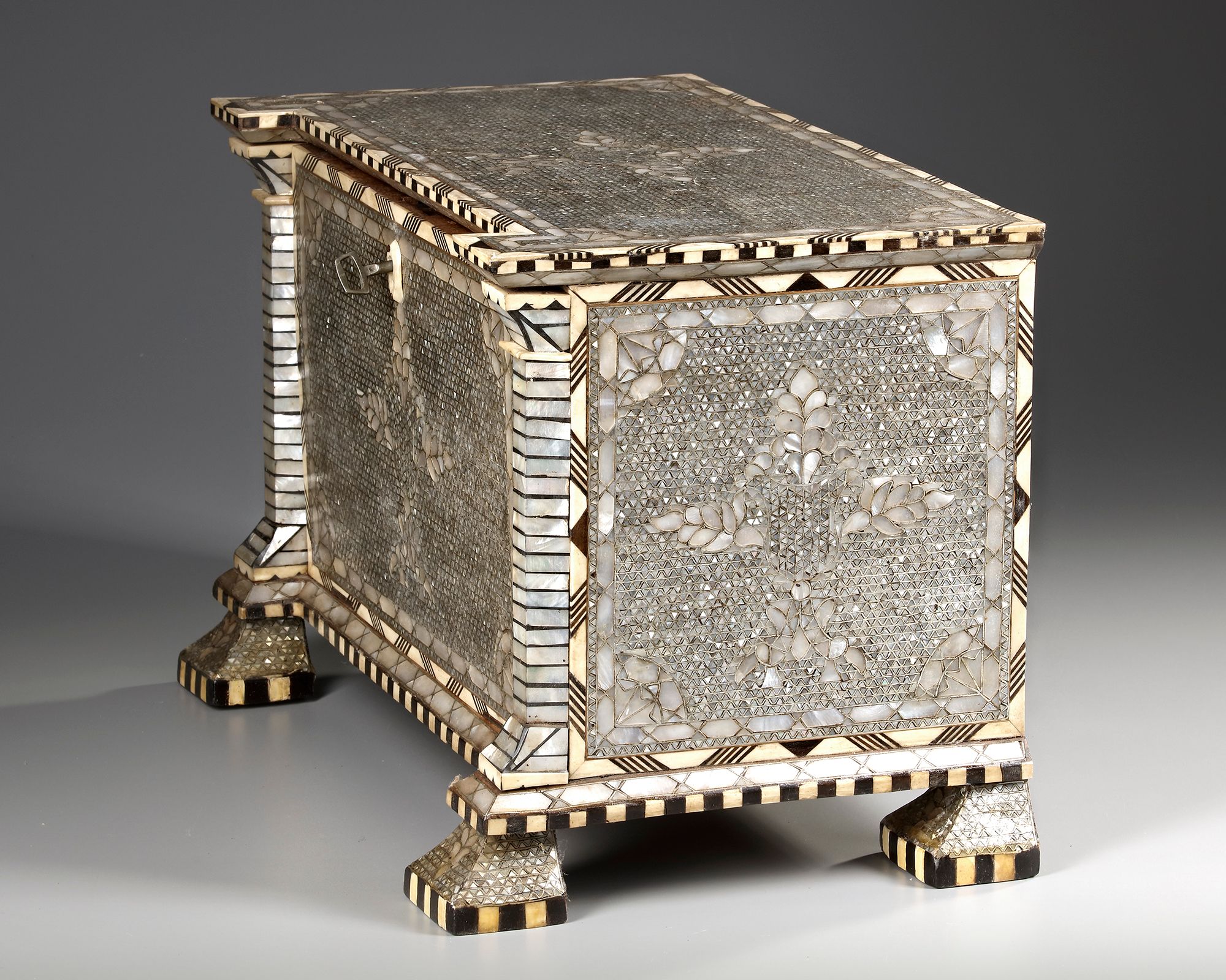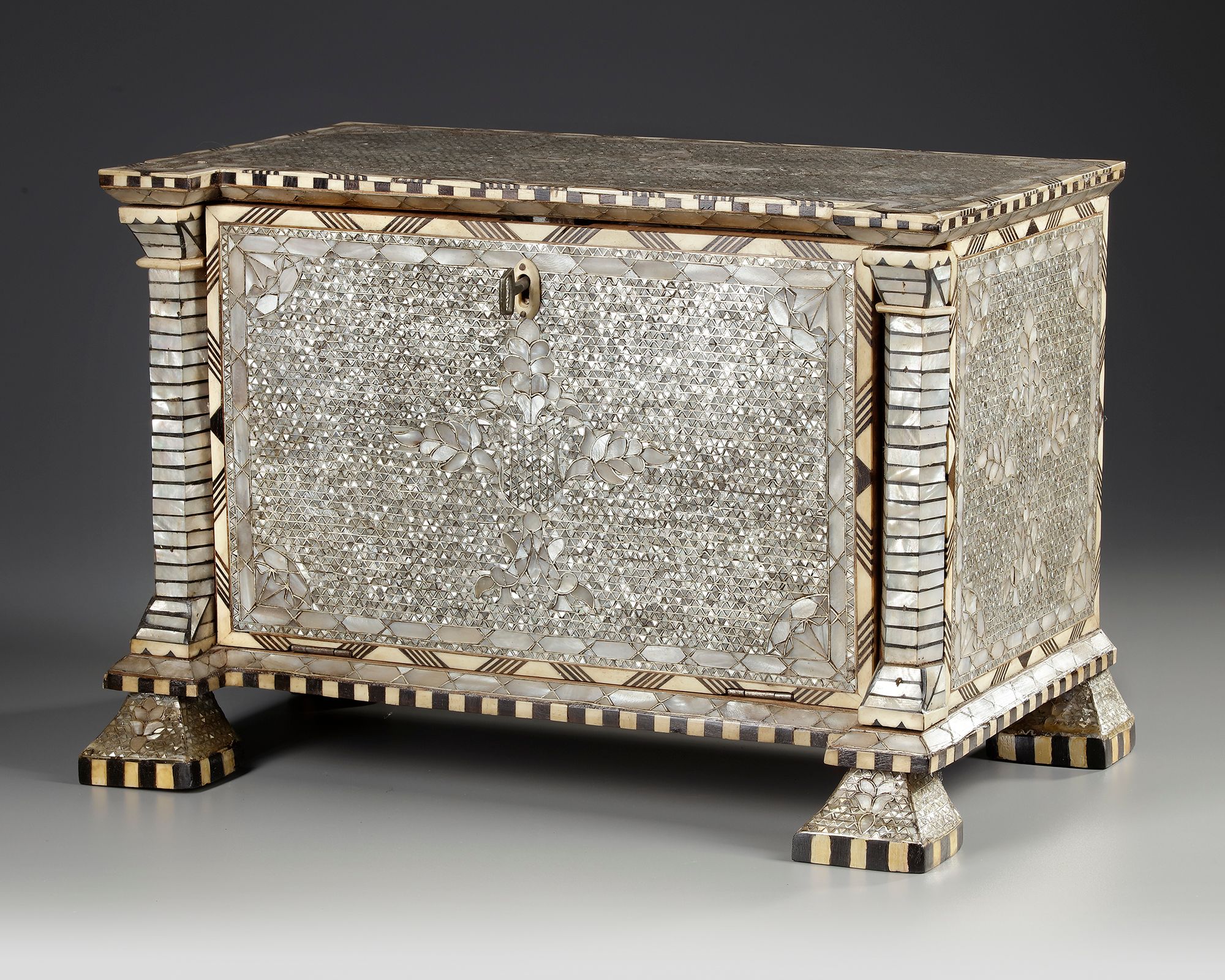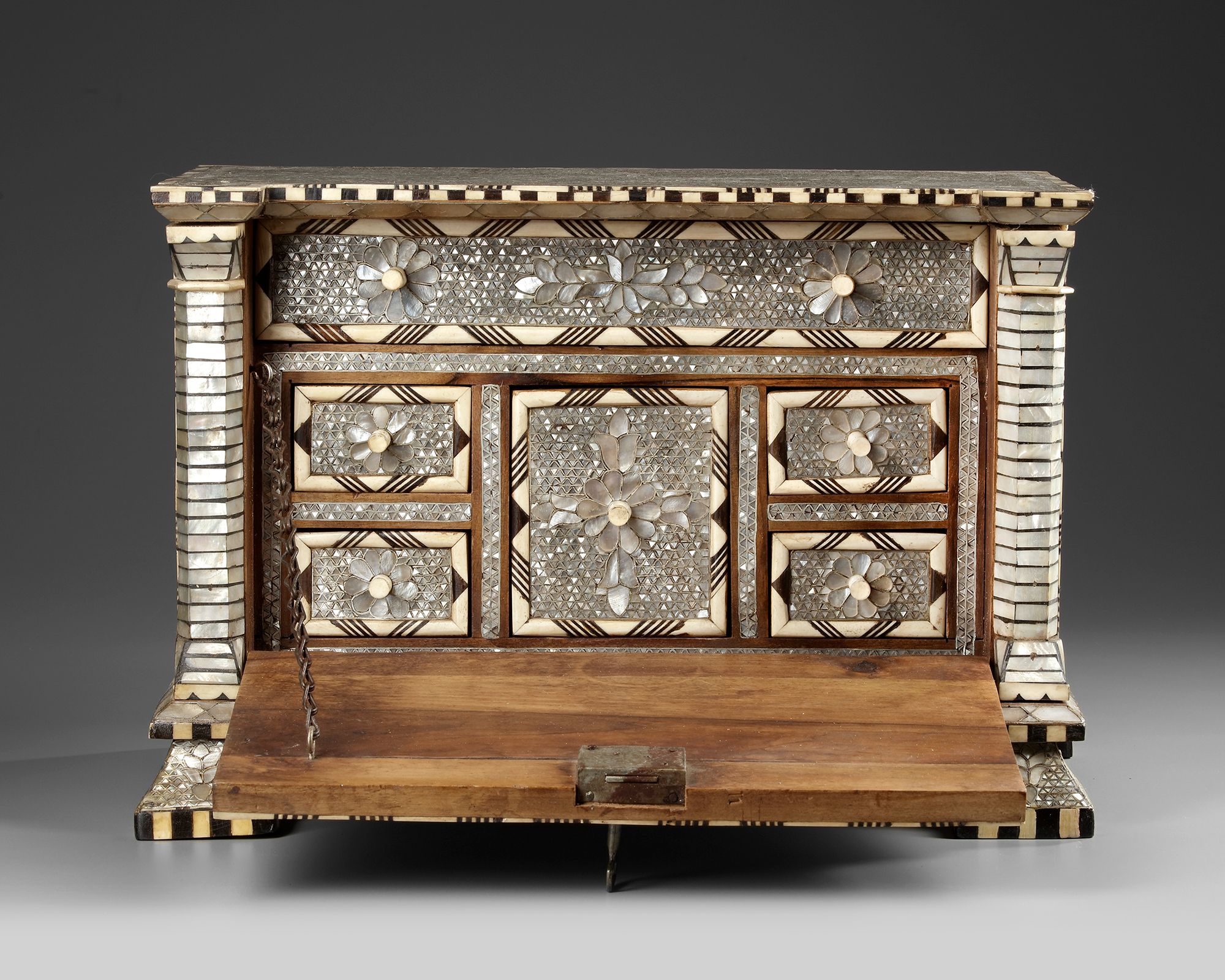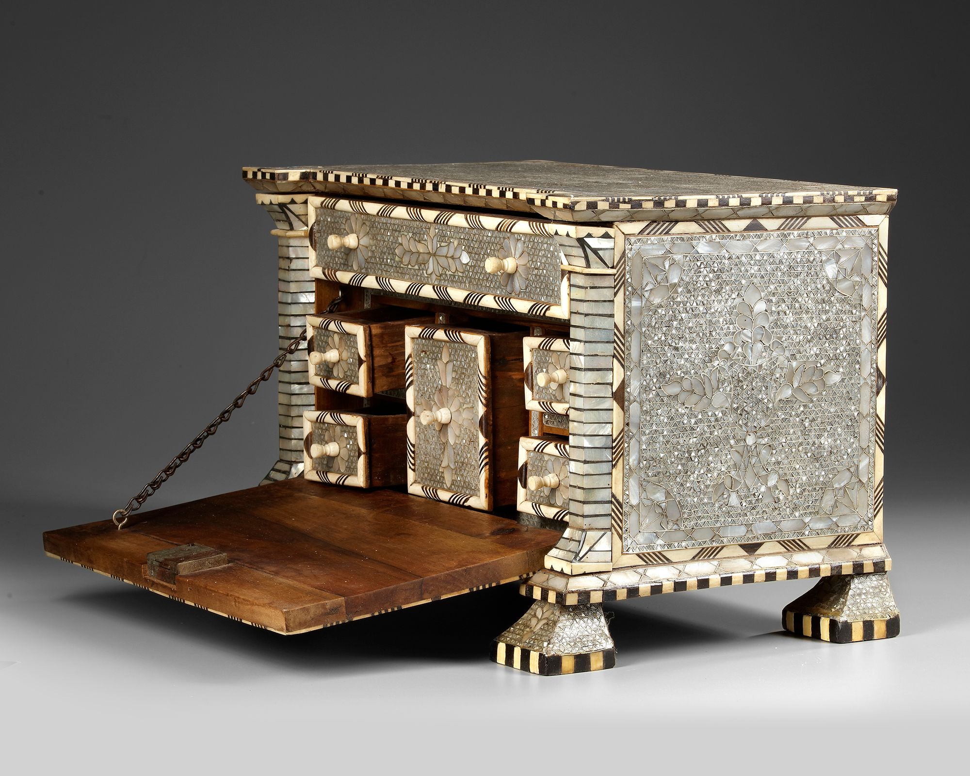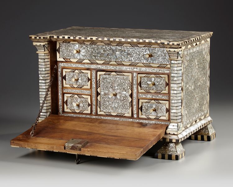 The box with ring hinged drop front revealing six interior drawers, front and sides densely inlaid with floral patterns on a small triangles inlaid ground within a bone laid border to each side and top framing diaper pattern, drawer fronts with bone ring pulls centered on similarly decorated panels.