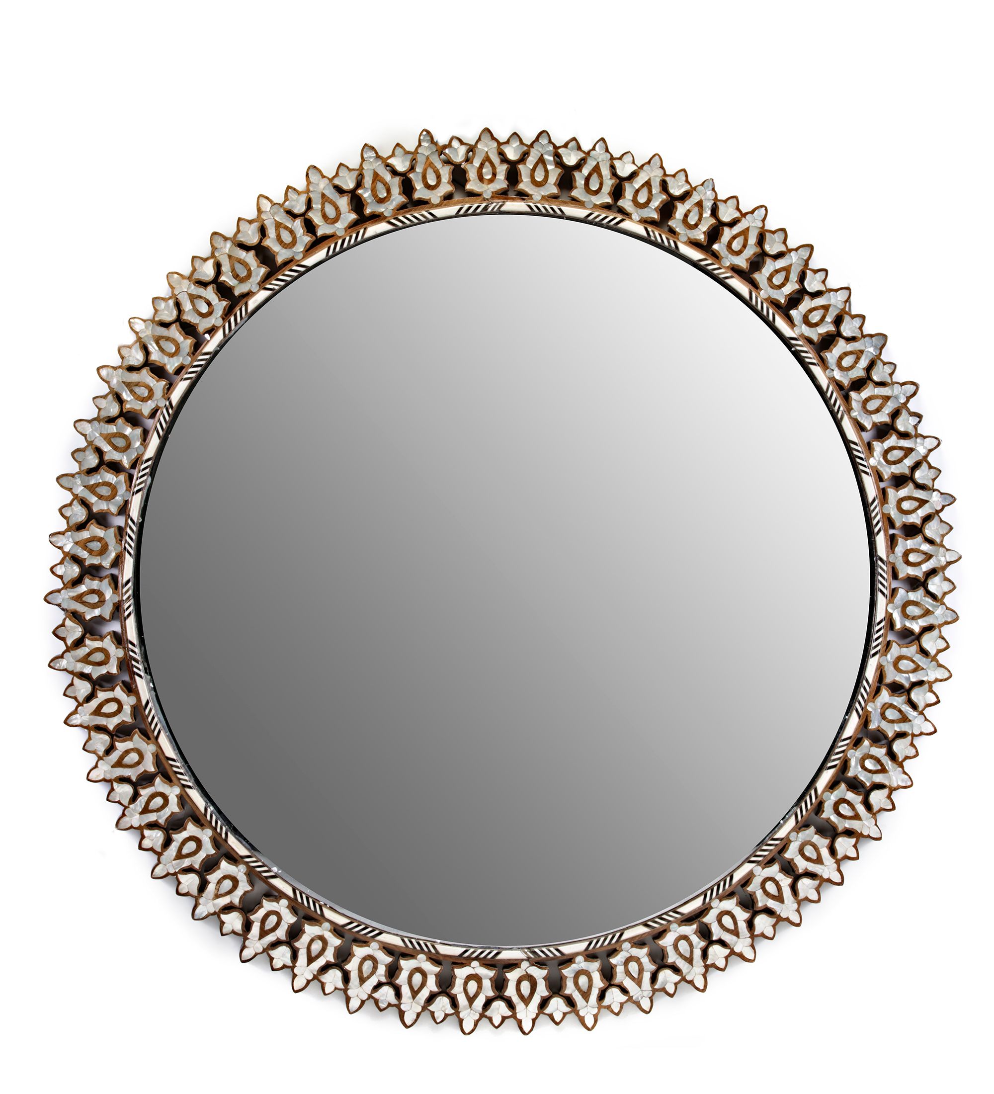 This round vintage mirror features an intricate hand-carved solid walnut wood with remarkable and elegant mother-of-pearl floral patterns.