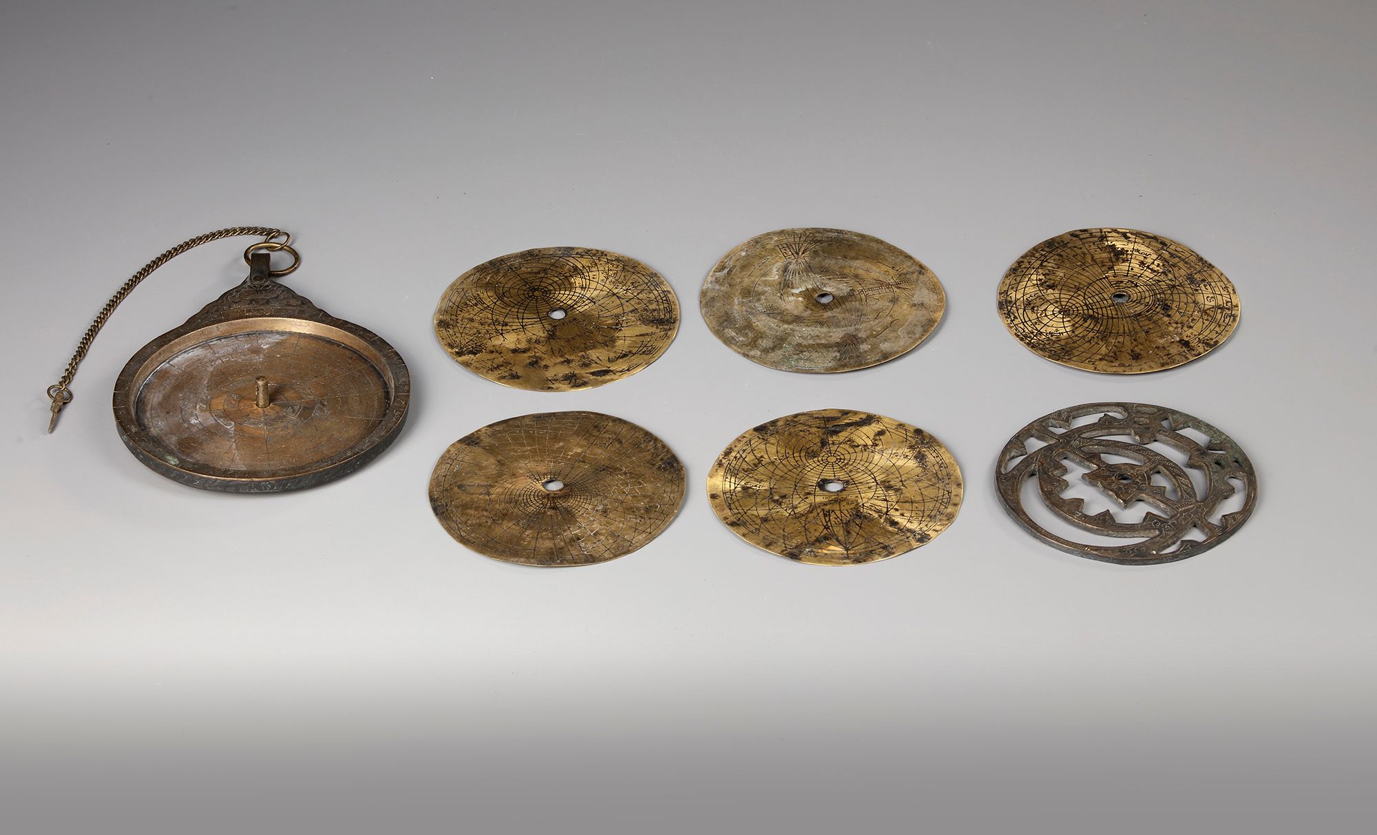 Cast brass, hammered and engraved with elaborately designed cusped throne, containing five plates and a finely designed foliate rete