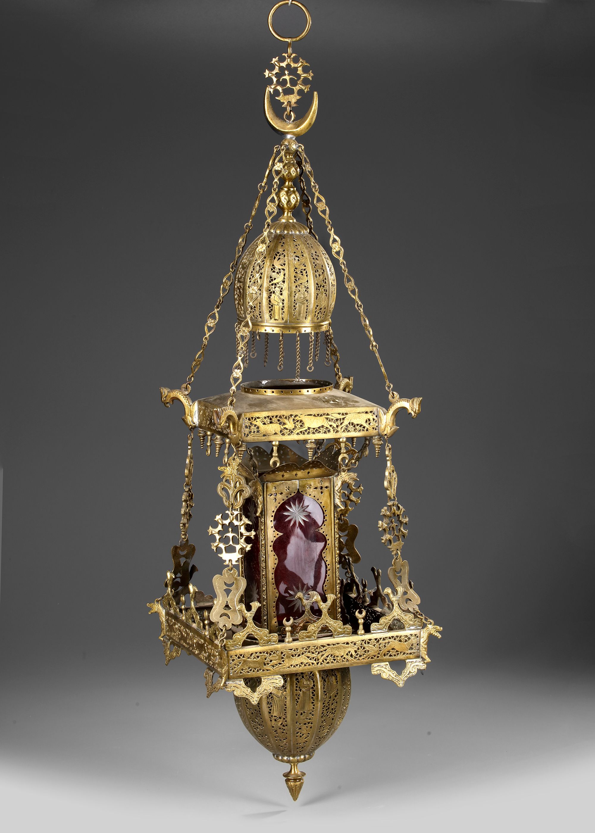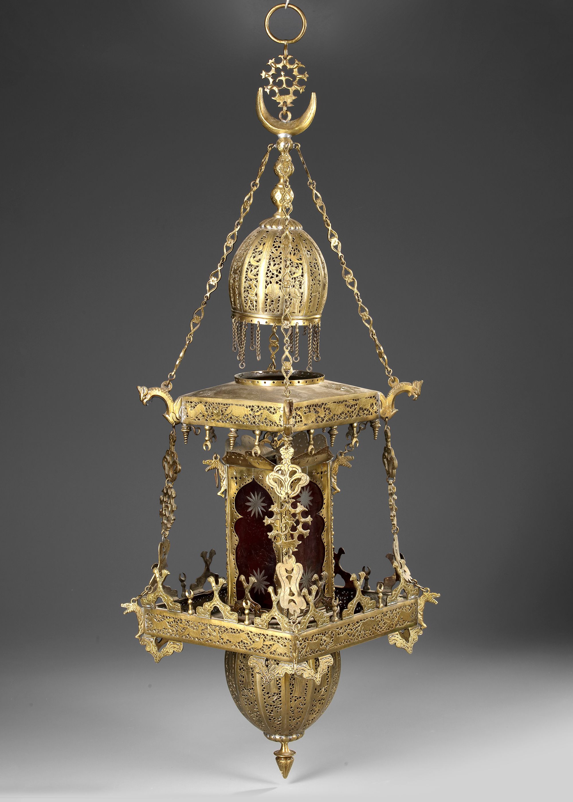 A gilt bronze hanging mosque lamp, decoration with pierced figures, birds and animals on a scrolling vine ground, hung with chains. 100 by 28 cm