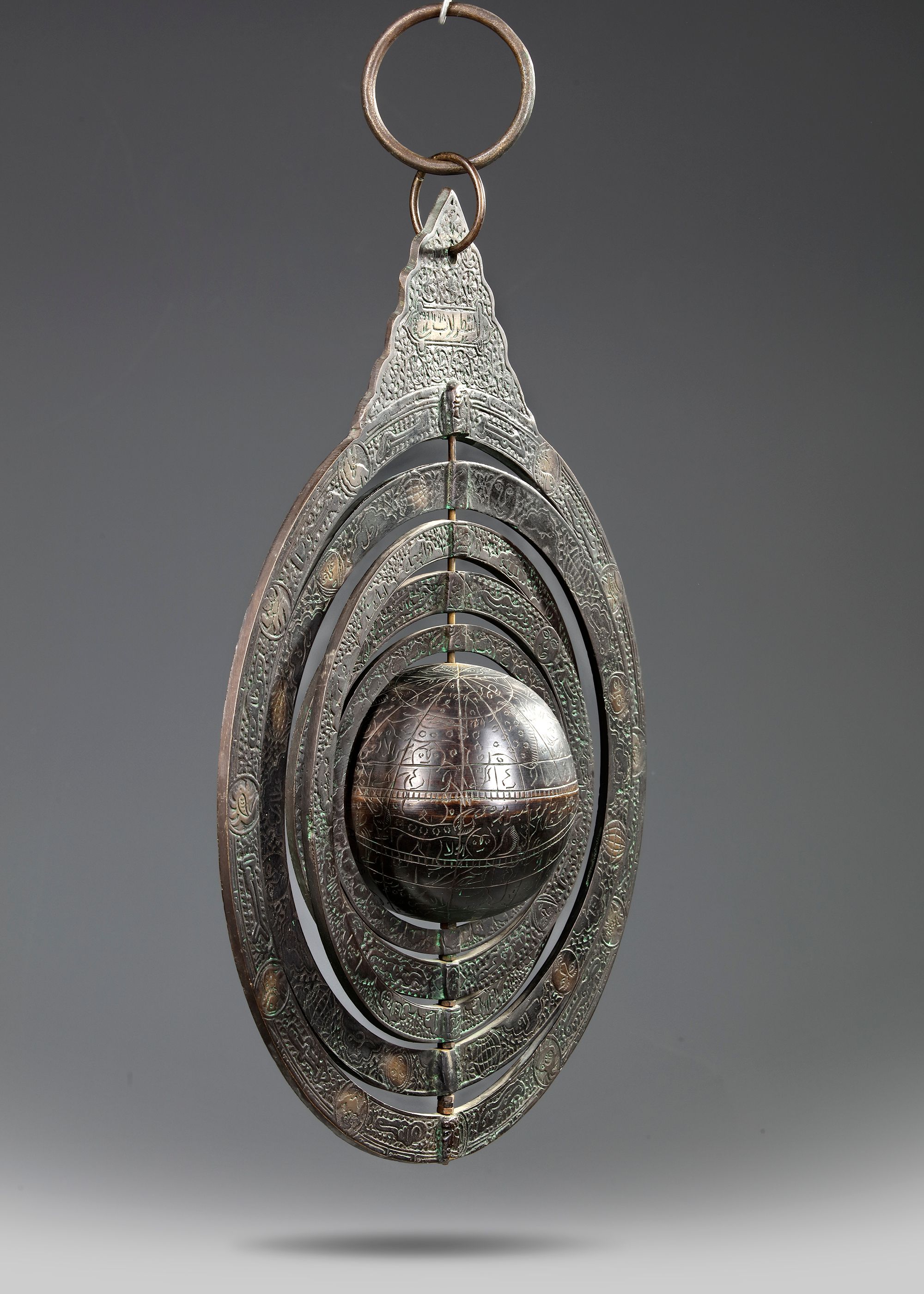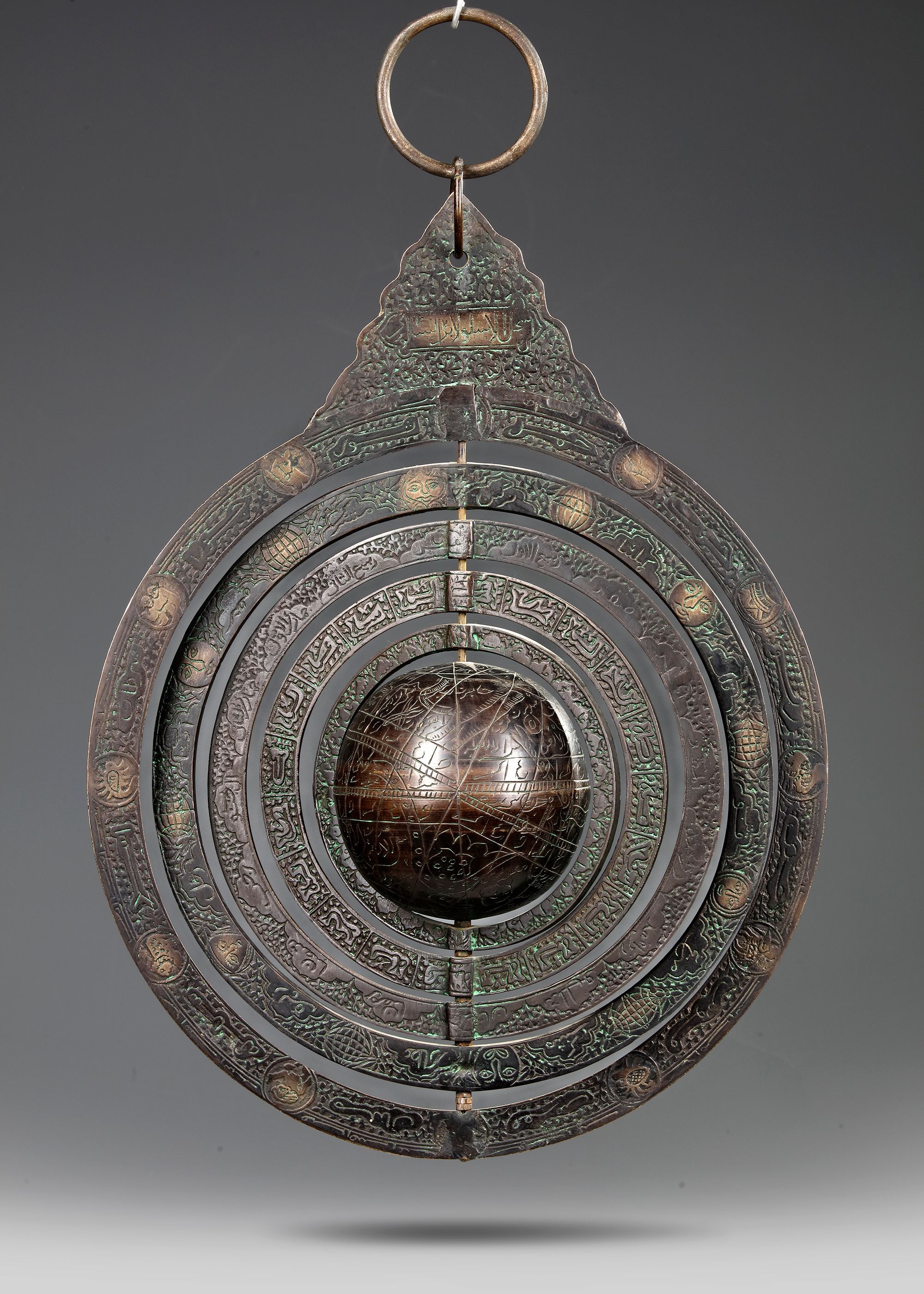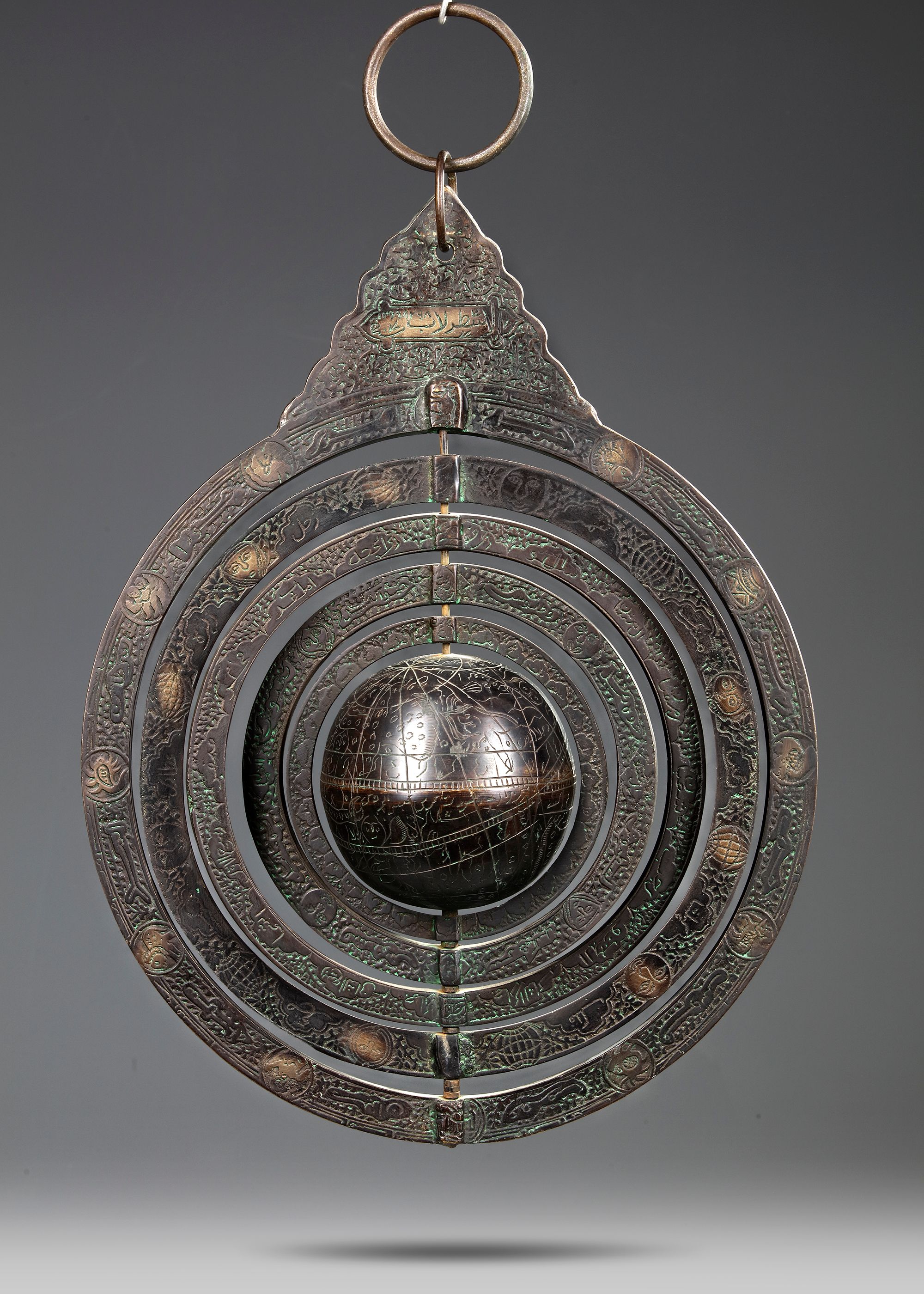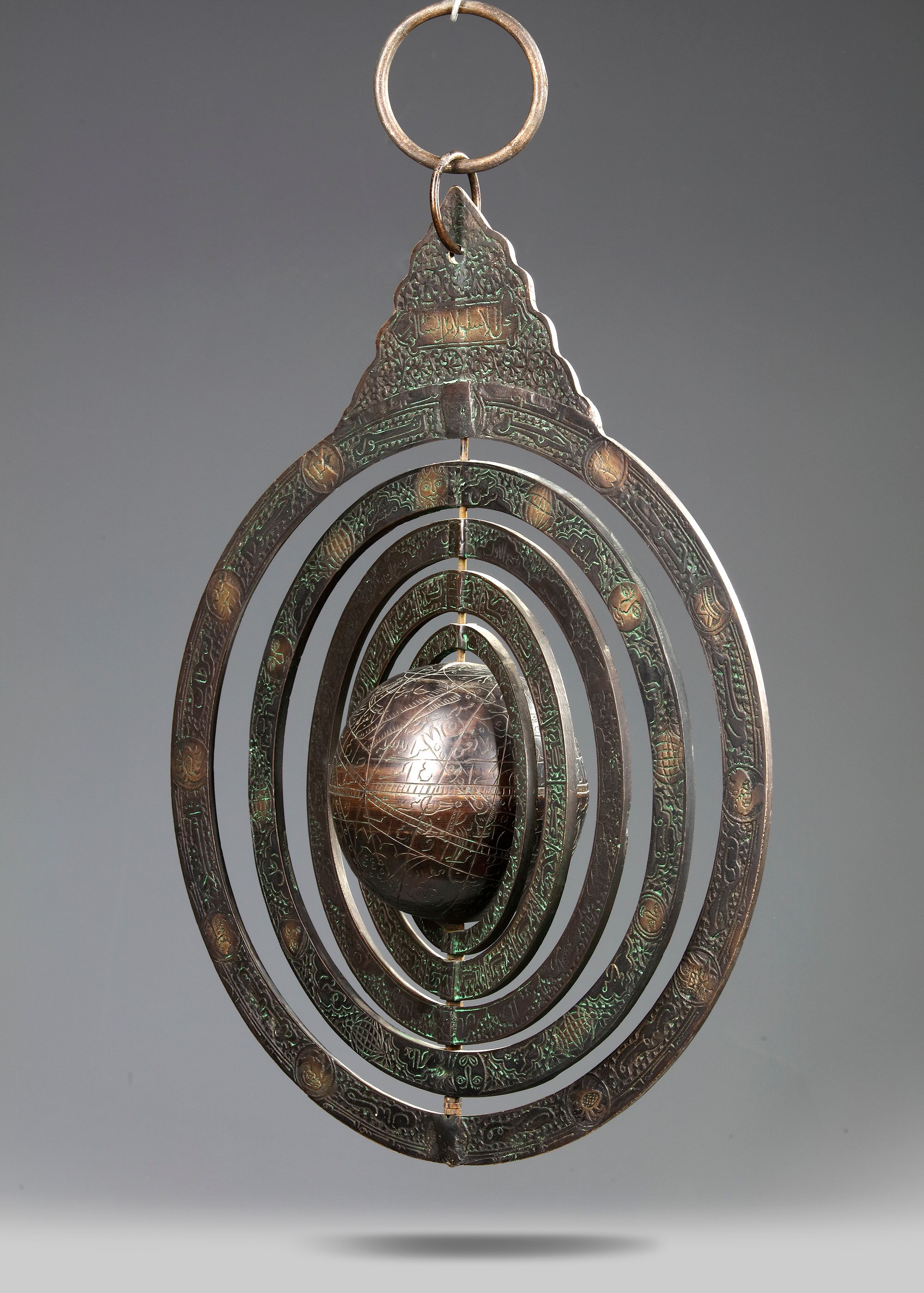 Consisting of a spherical framework of five rings, centred on Earth or the Sun, that represent lines of celestial longitude and latitude and other astronomically important features with Arabic letters on the second and the third ring, the planets on the fourth, the astrological signs on the fifth ring.
