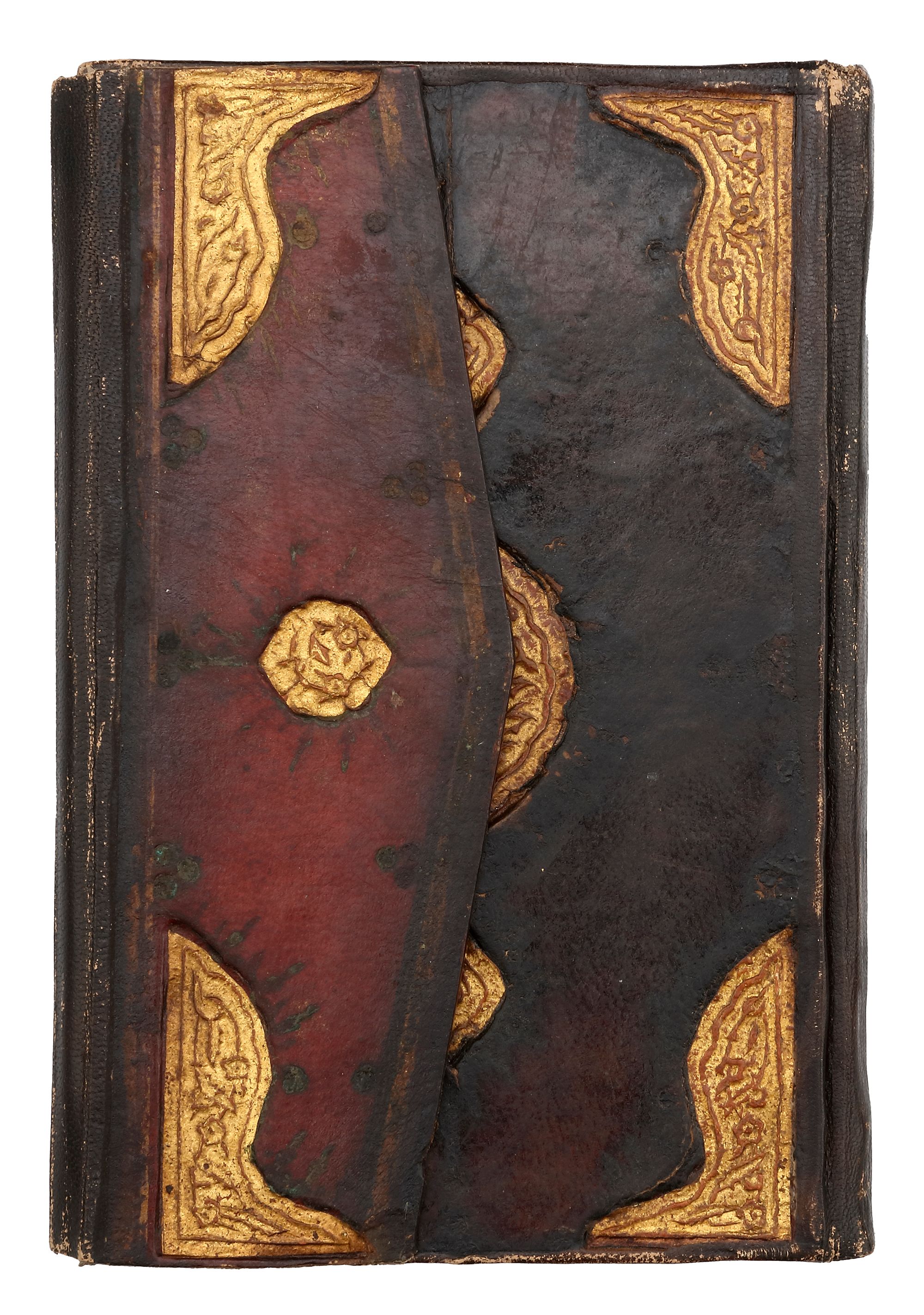 In brown morocco binding with flap decorated with gilt floral motifs.