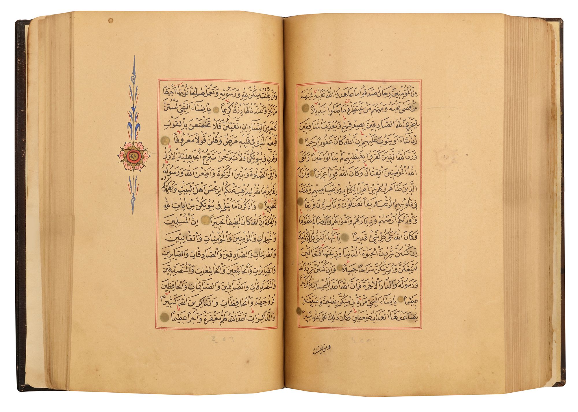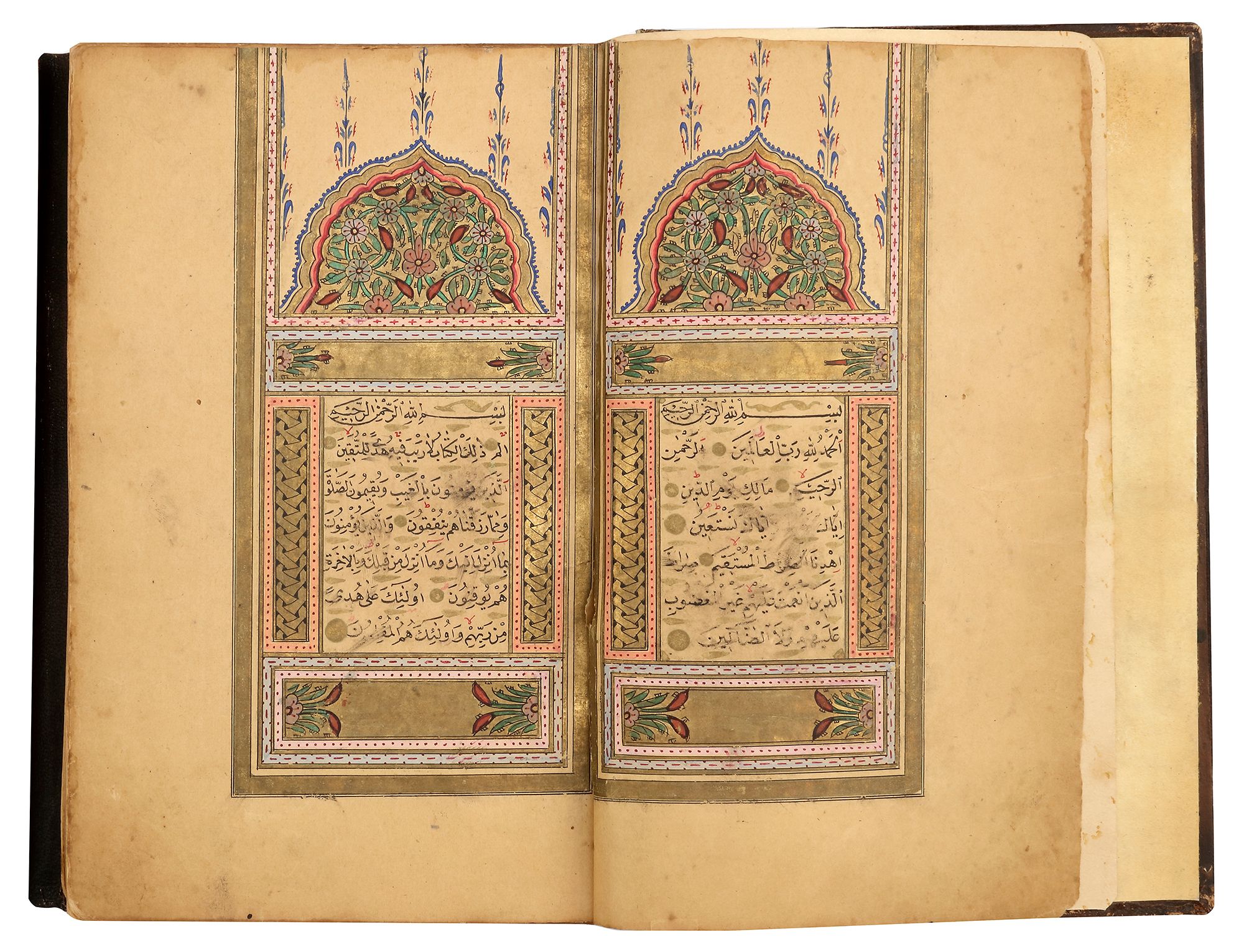 A complete Quran, Arabic manuscript on paper, 320ff. with 2 fly-leaves, 15 lines to each page in bold black naskh script within a double red border. Surah headings in red thuluth script. Two opening biofolia with striking blue and gilt decorated borders containing 7 ll. reserved in clouds. Gold verse markers with Al tajwid in red ink, gilt floral occasional marginal " Hizb, Juz and Sajda " markers.