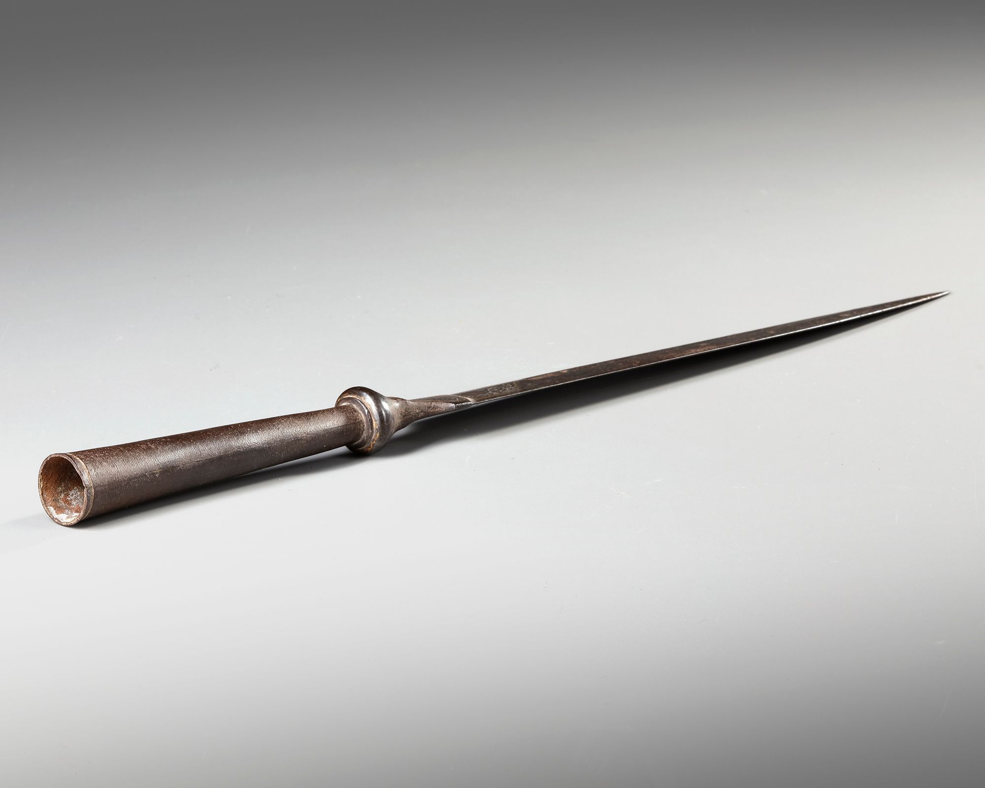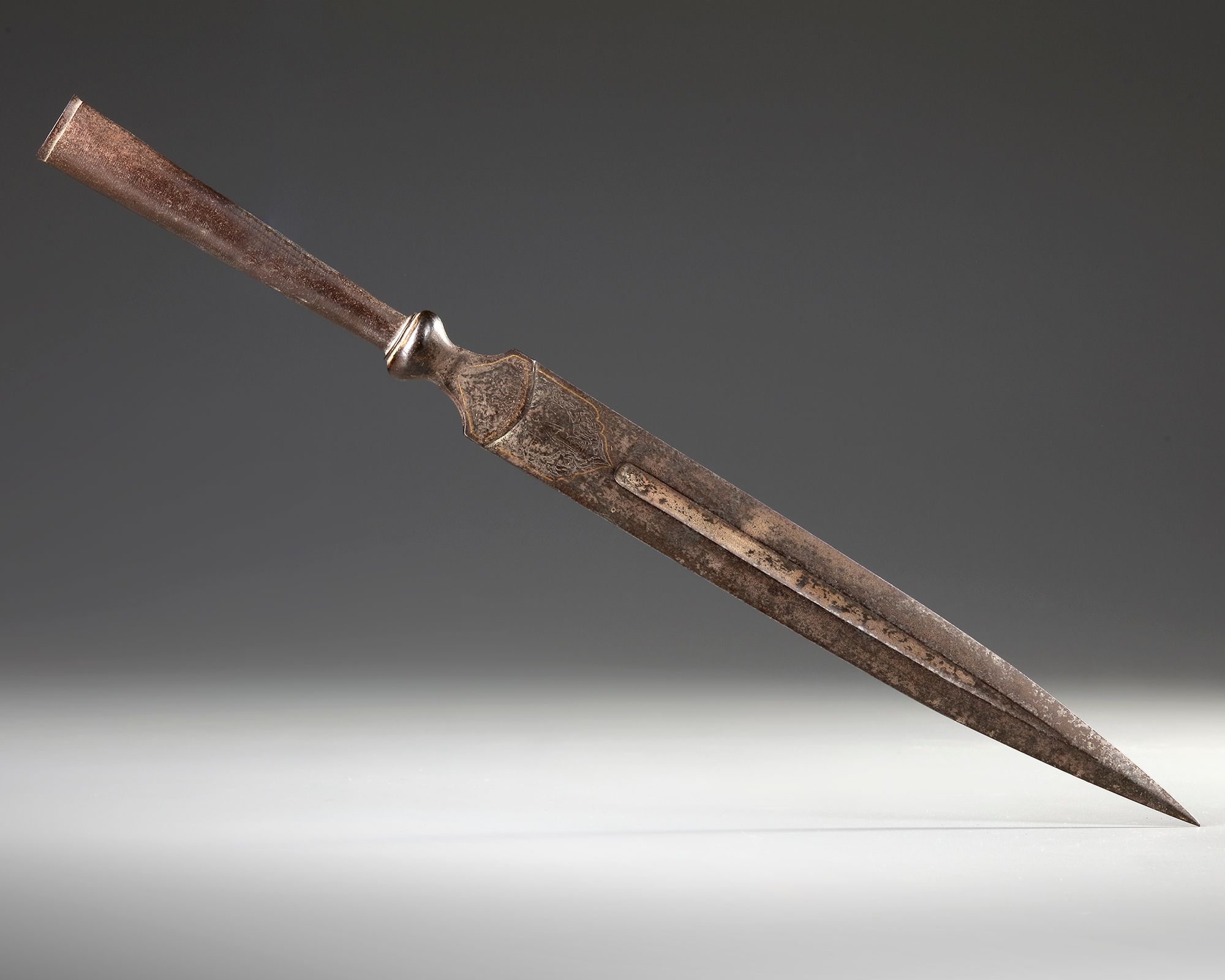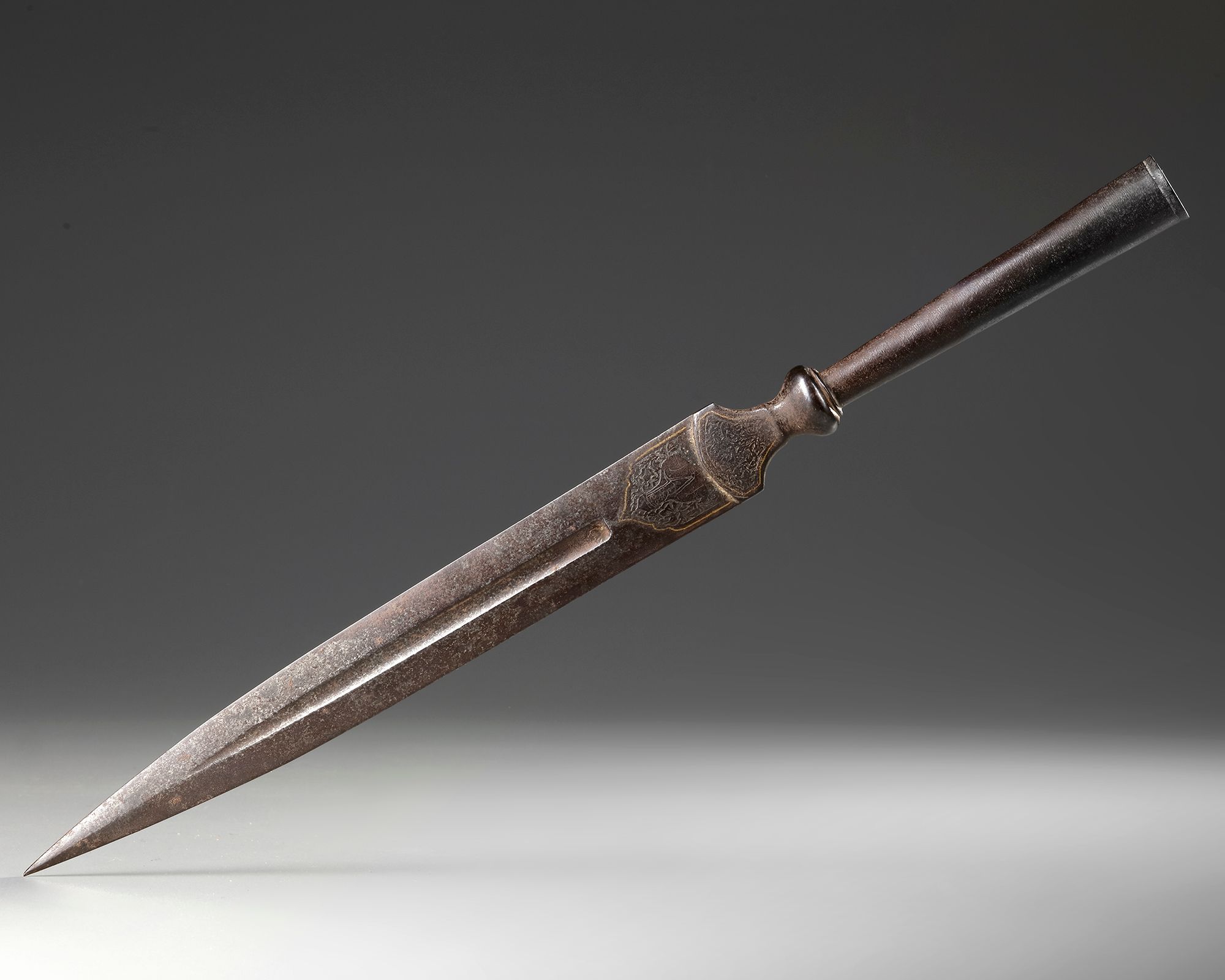 The straight double-edged fullered blade decorated at the forte with a warrior amidst floral sprays. 50 cm.