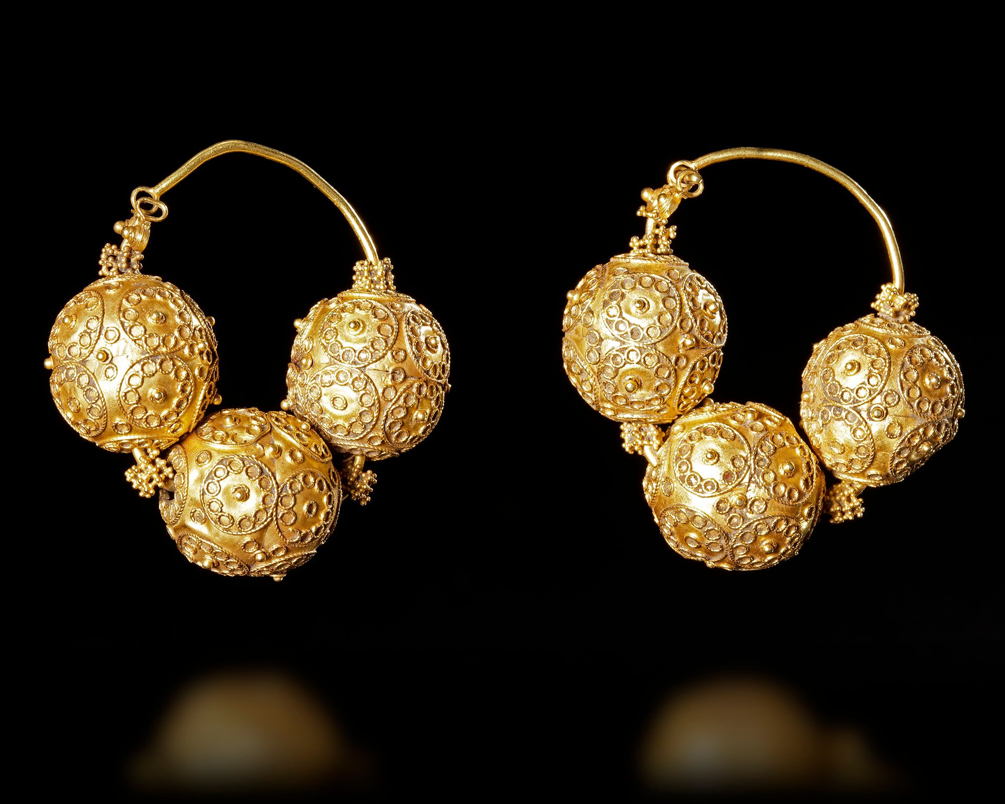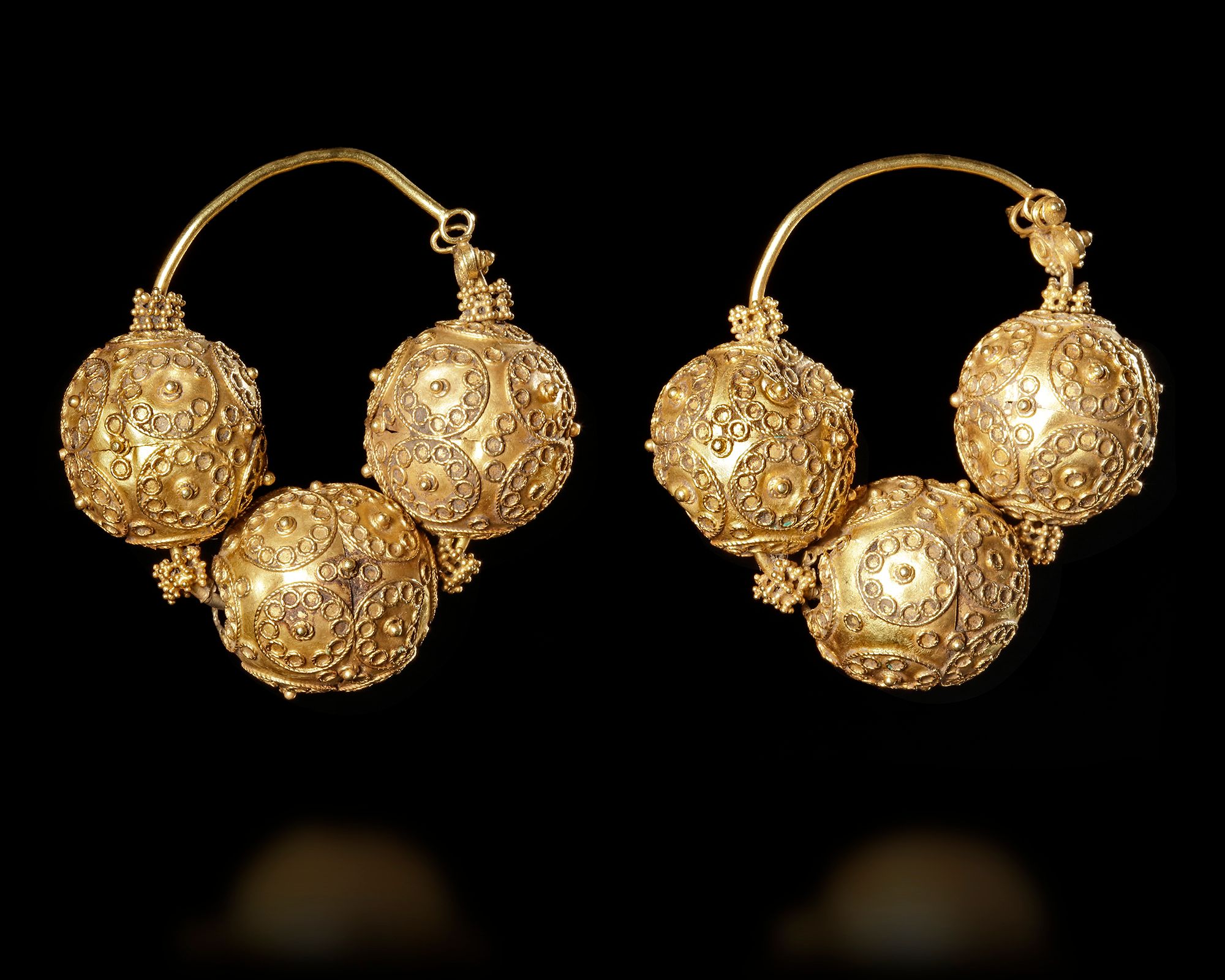 A pair of early islamic earrings from the end of the 12th c AD. The earrings are formed of a thick, circular wire with a device for closing the loop and three large globular beads which are threaded onto the wire and fixed by attachment with beaded spaces which are in turn soldered to the wire. The beads are made from thin sheet moulded into hemispheres which are then soldered at the edges to for a sphere. These were then in turned embellished with twisted wires and beads. The type originally derives from Byzantine prototypes and the interaction between the two cultures is well known in terms of borrowing from each other in the field of jewelry. They are exceptionally well preserved.