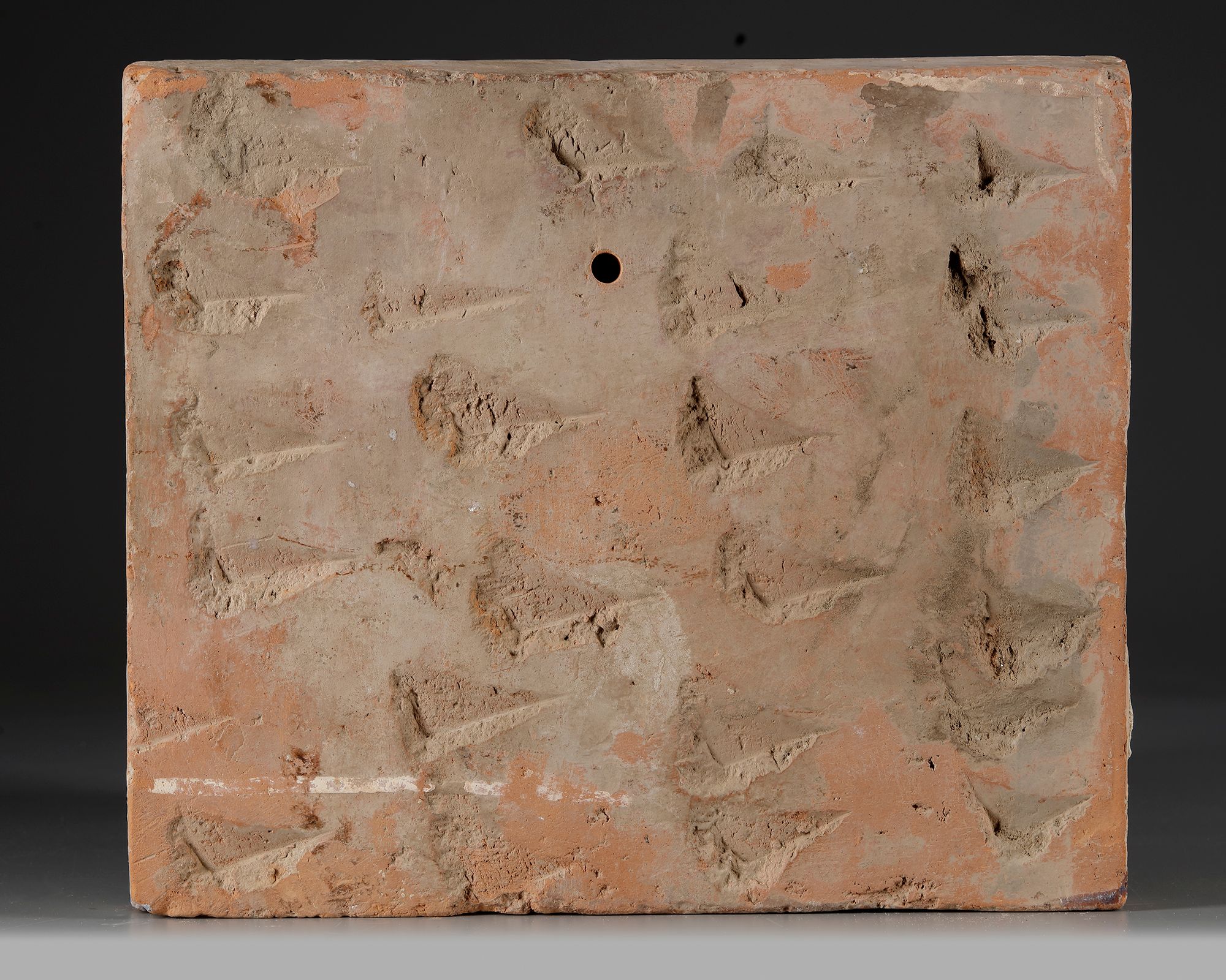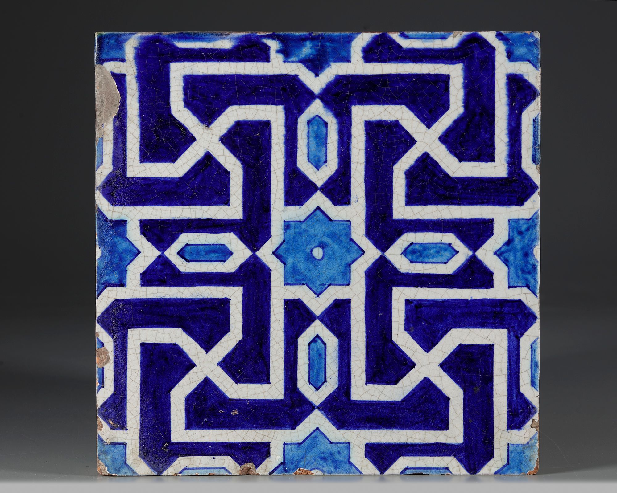 A Multan pottery thick tile of square form and decorated in cobalt blue and turquoise with geometric designs. 23 by 23 by 3.5 cm.