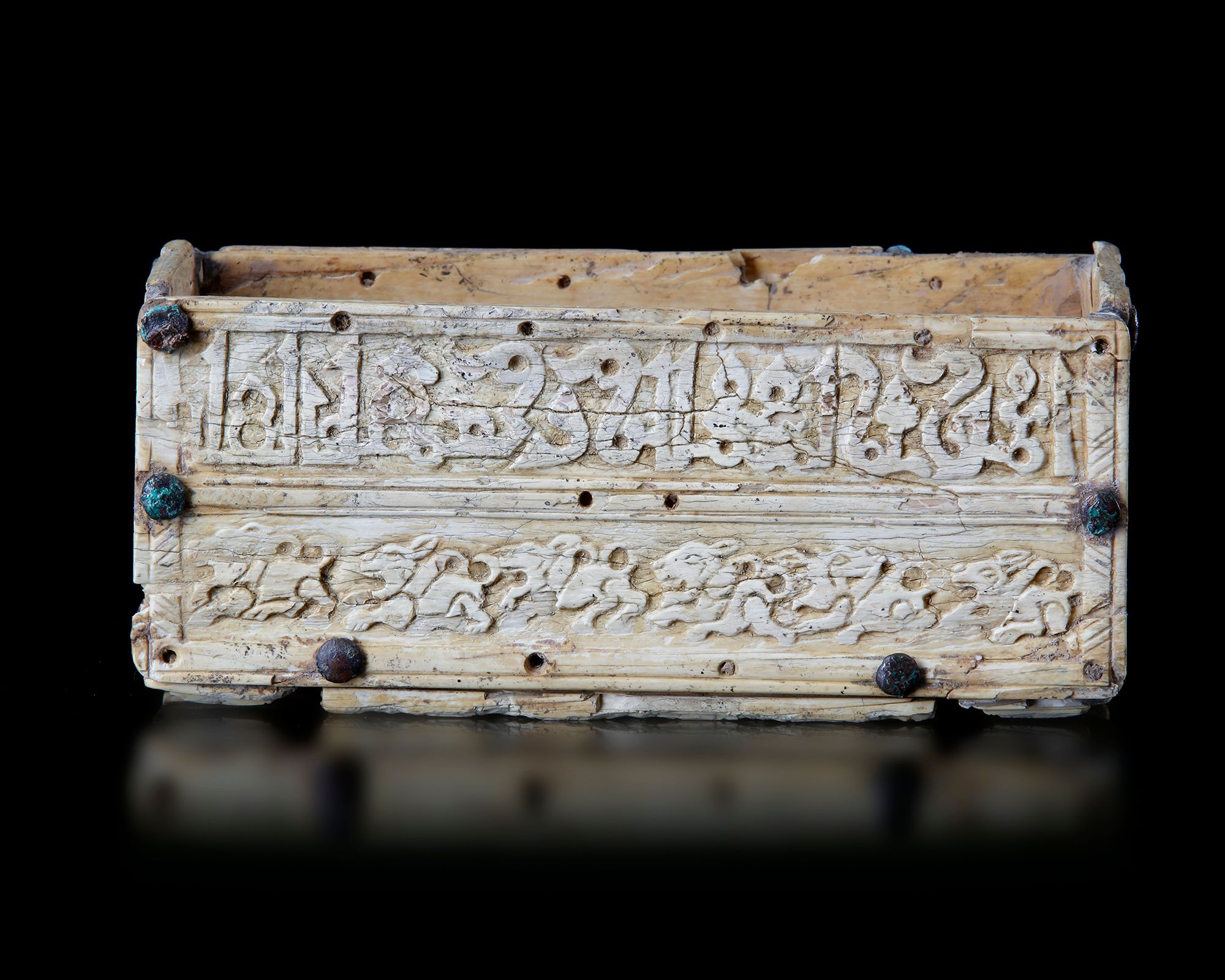 Of rectangular form resting on three thicker carved bases, each side carved elegantly with two bands of angular Kufic inscription ( Fatimid Kufic script) above a band of rabbits.