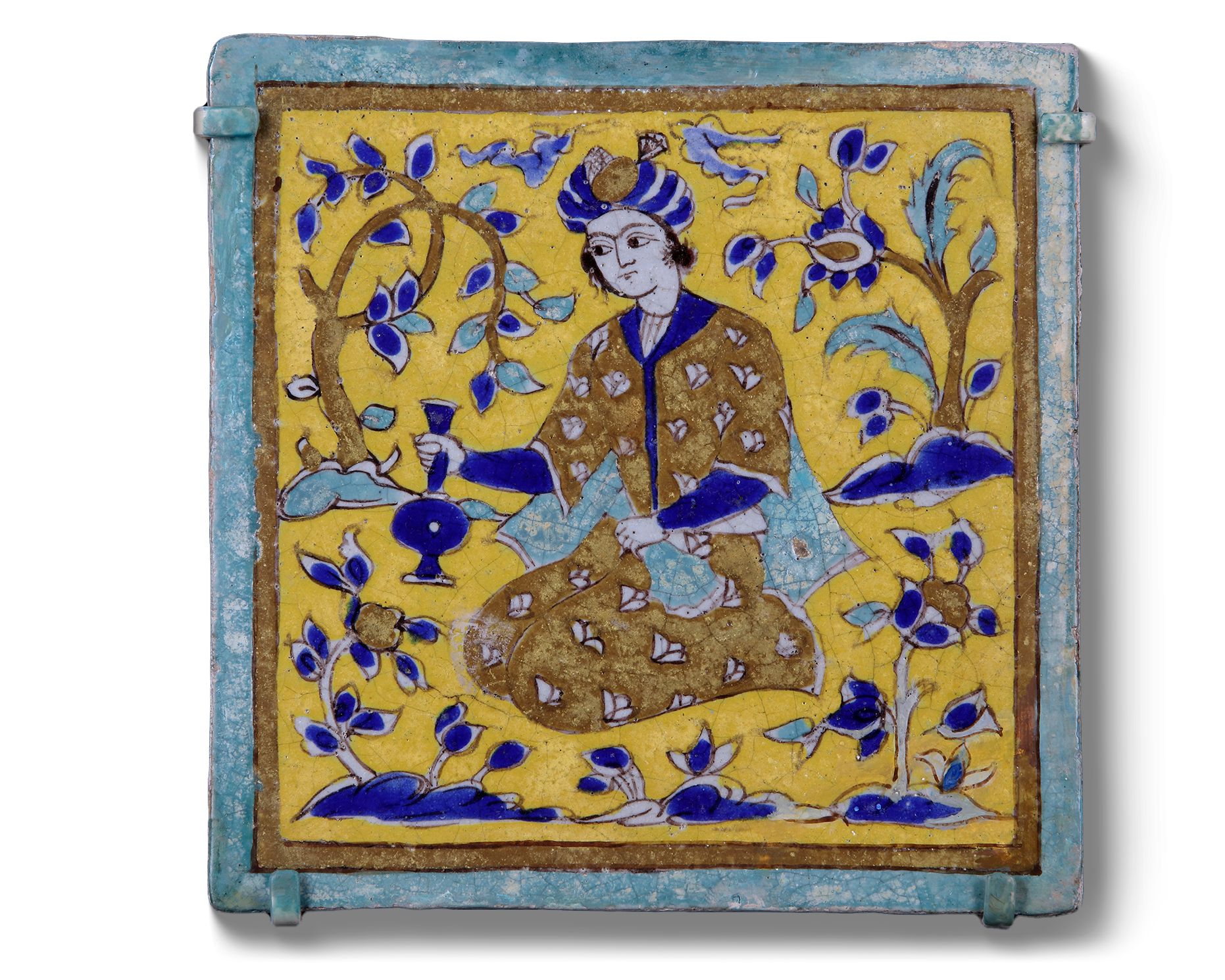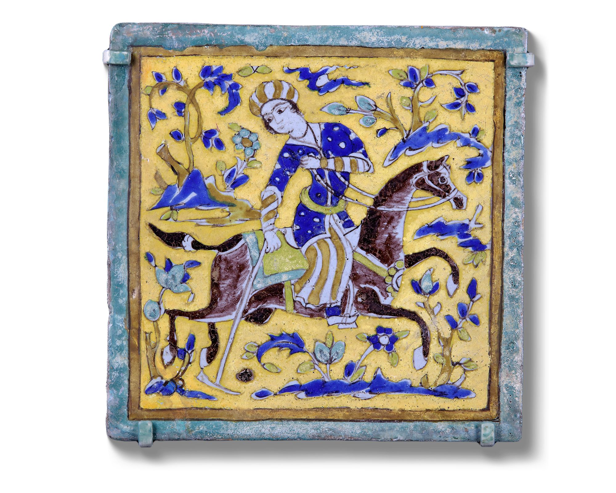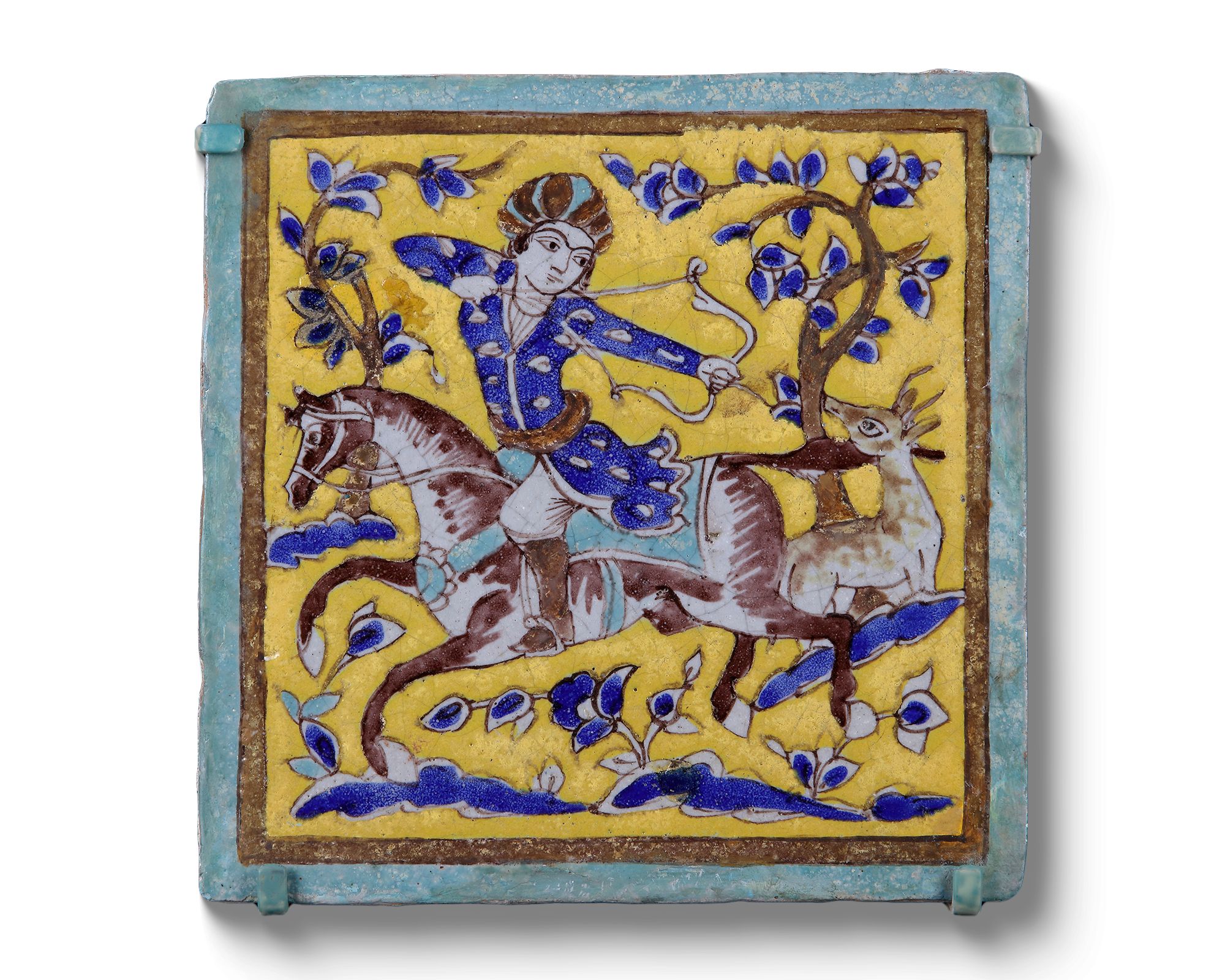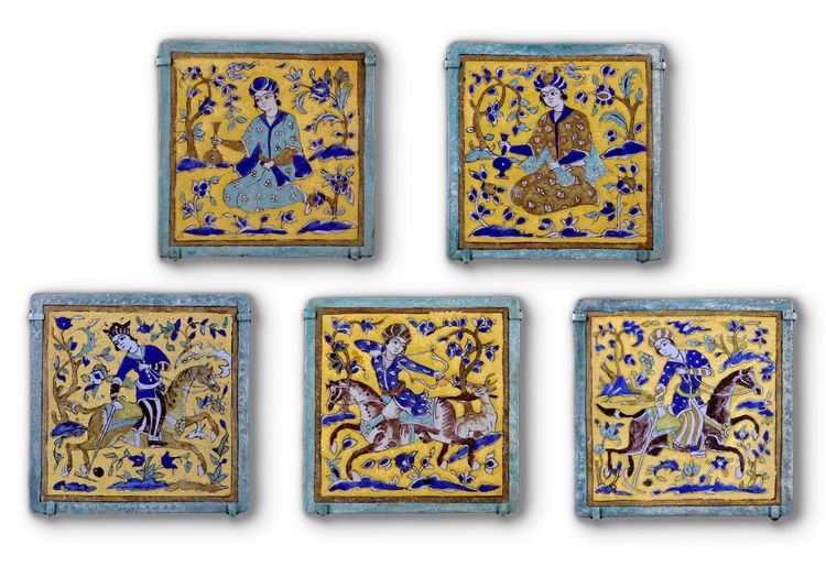Each of square form made of stone-paste, painted in yellow, turquoise, cobalt blue, black and opaque white with manganese purple in the cuerda seca (dry-cord) technique. Three tiles decorated with a figure of an archer seated on a horseback aiming at a deer in hunting scene amongst blossoming trees. Two tiles decorated with a seated youth drinking wine in a landscape.