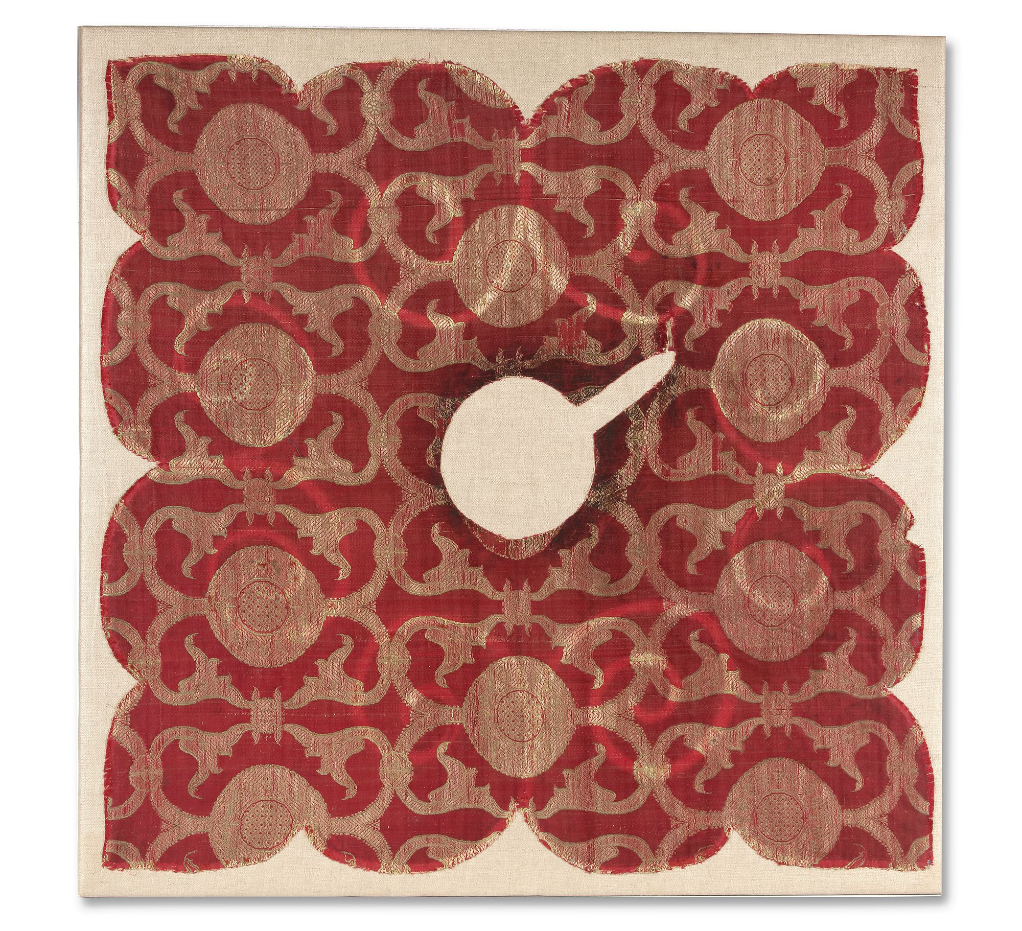 A fine brocaded silk barber’s apron, decorated with a series of pomegranates motifs linked to four split palmettes in gold colored silk thread against a red ground.