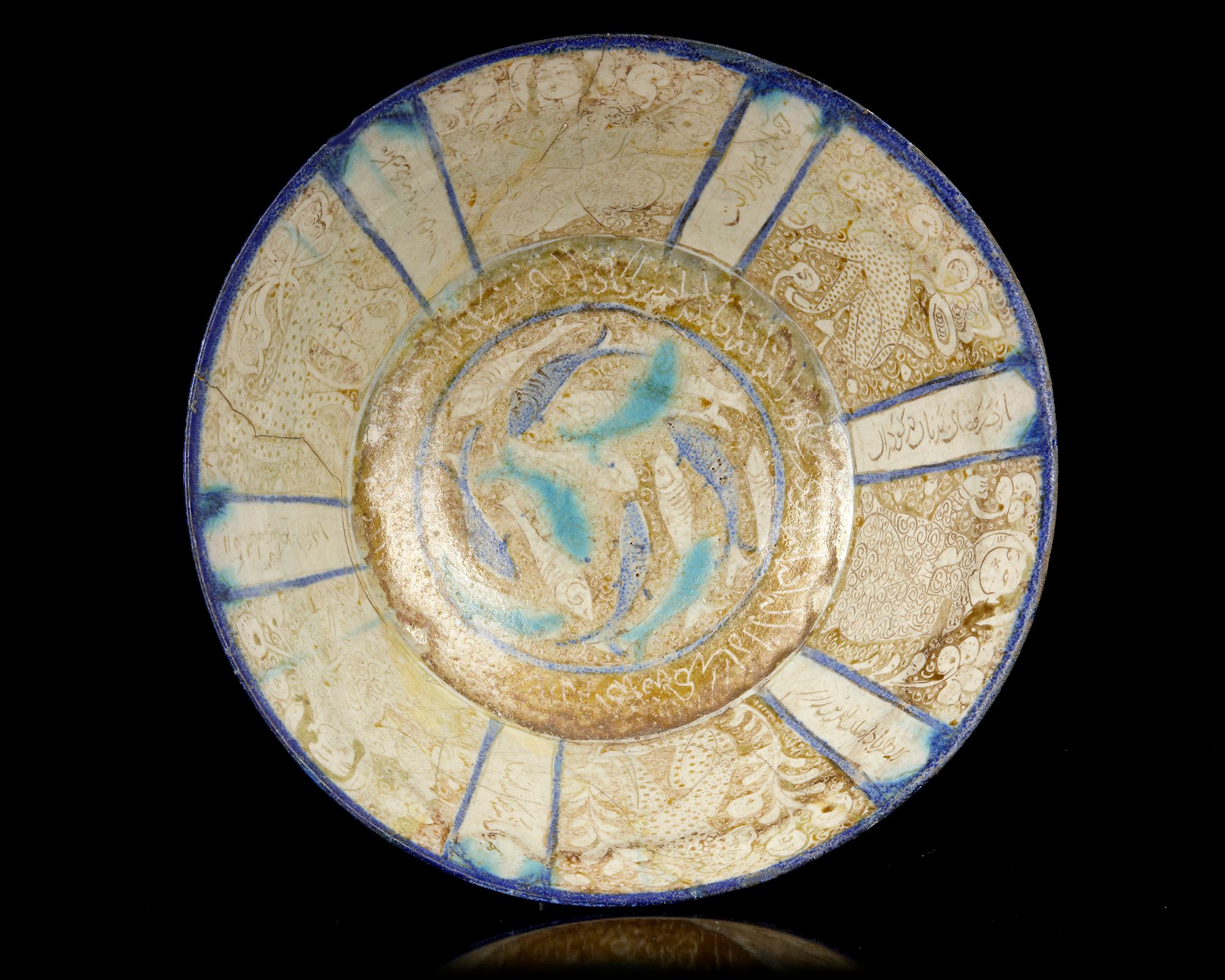 Of deep conical form, painted in lustre heightened in cobalt blue and turquoise on a cream ground, with a central medallion of swimming fish against a ground of cursive scrolls encircled by a border of sgraffiato calligraphy, the sides with six panels alternately depicting seated princely figures and speckled leopards, divided by vertical bands of calligraphy, the exterior with a band of four cartouches below a now obscured border of calligraphy.