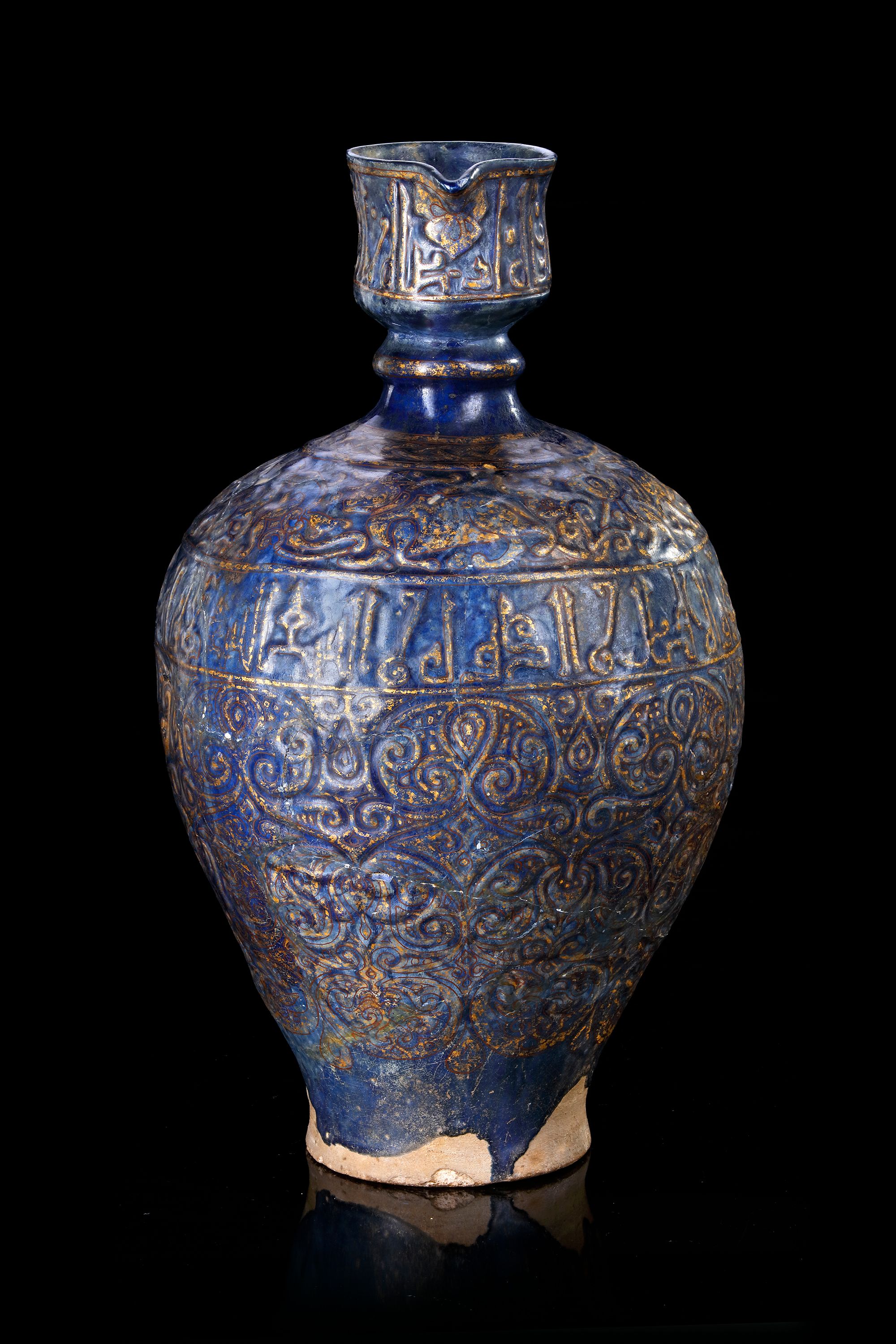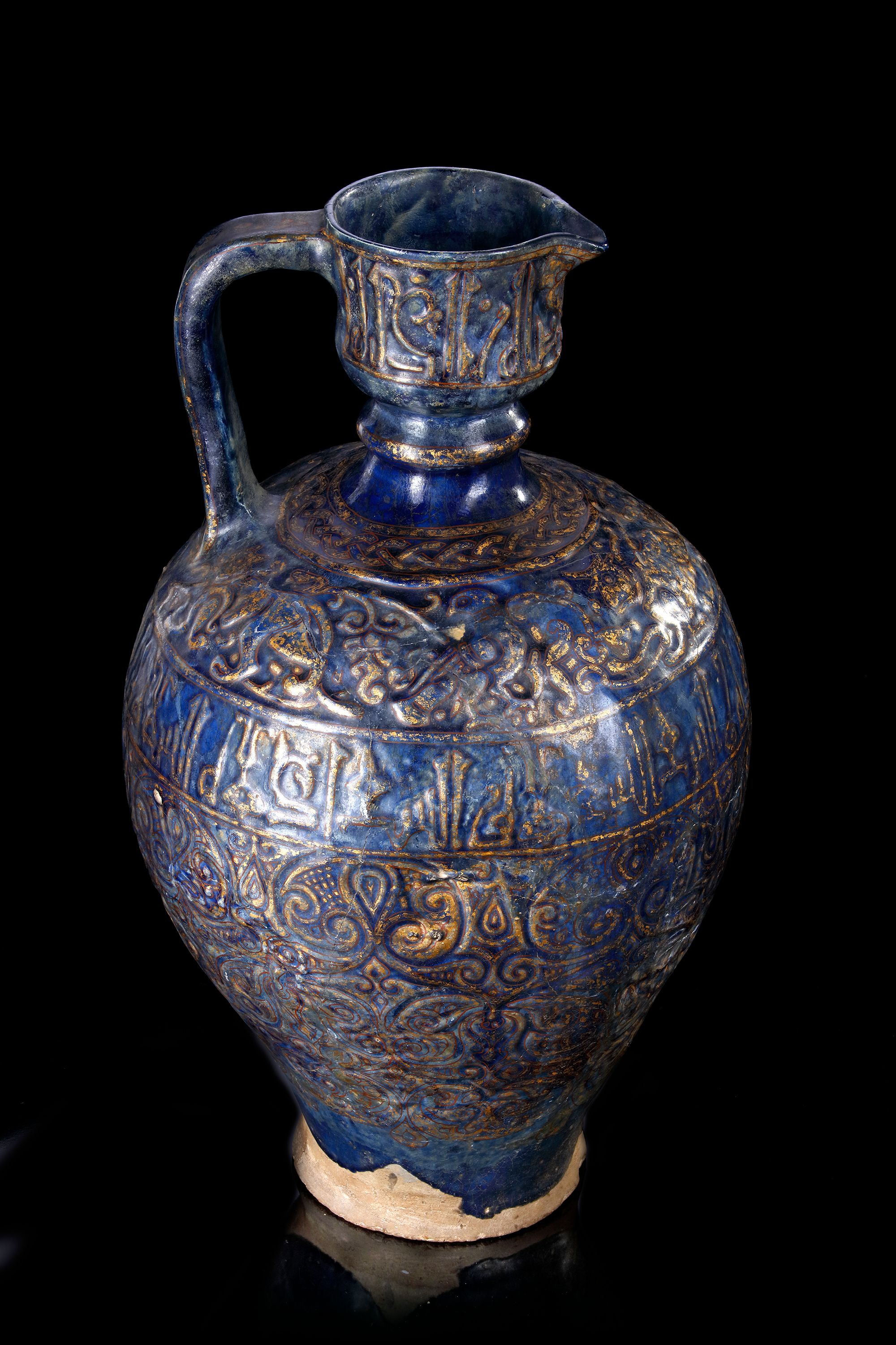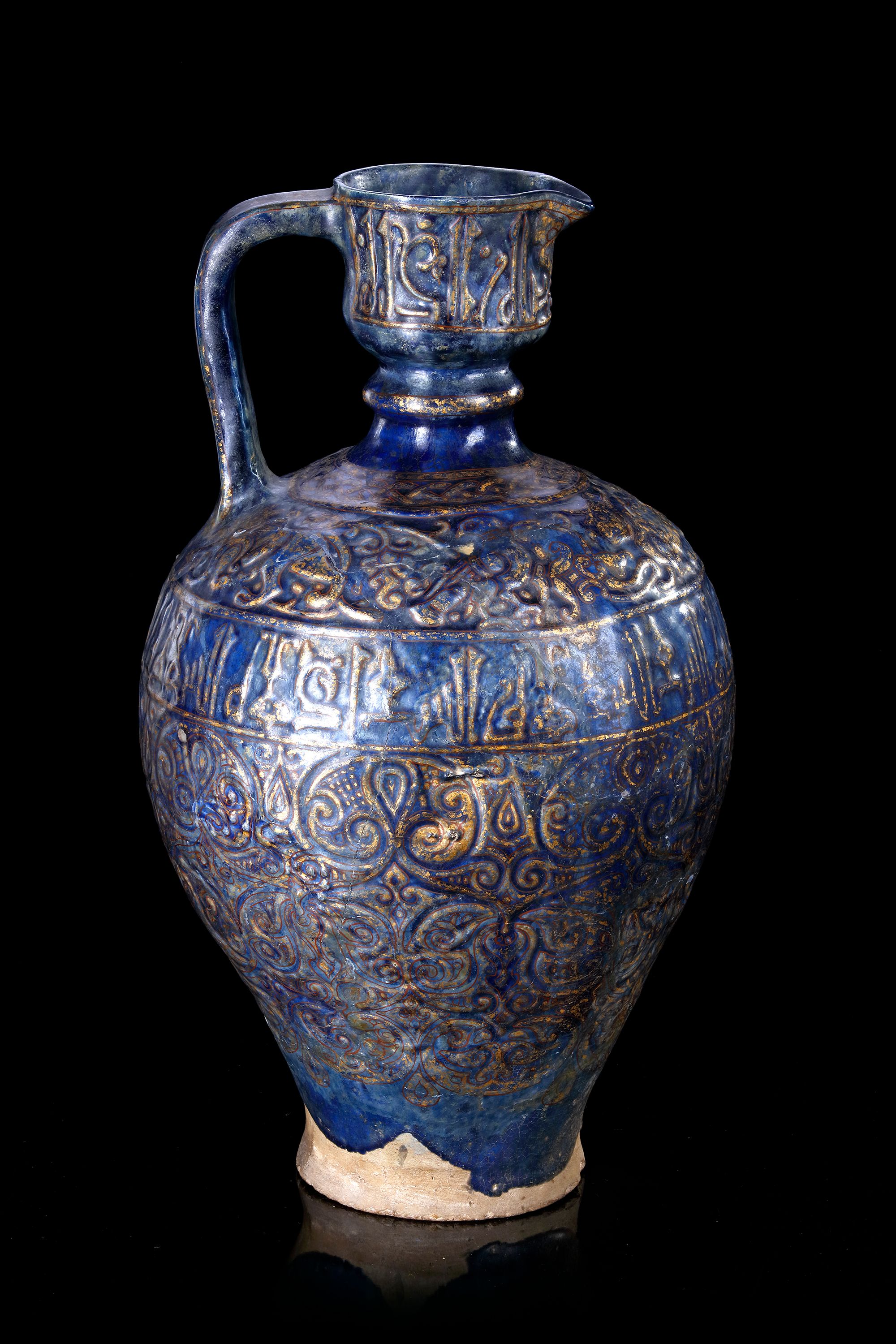A Persian pottery jug with drop-shaped body and high shoulder rising to a ribbed neck, vertical mouth with small spout and a simple handle. Decorated with gold carved lattice designs interspersed with stylised leaf-motifs on a cobalt-blue ground, beneath a band of angular Kufic inscriptions, shoulder with a band enclosing elegant gilt carved perched bird, a cow and mythical beasts under a band of gilt carved interwined chain. The neck similarly decorated with a band of angular Kufic inscriptions.