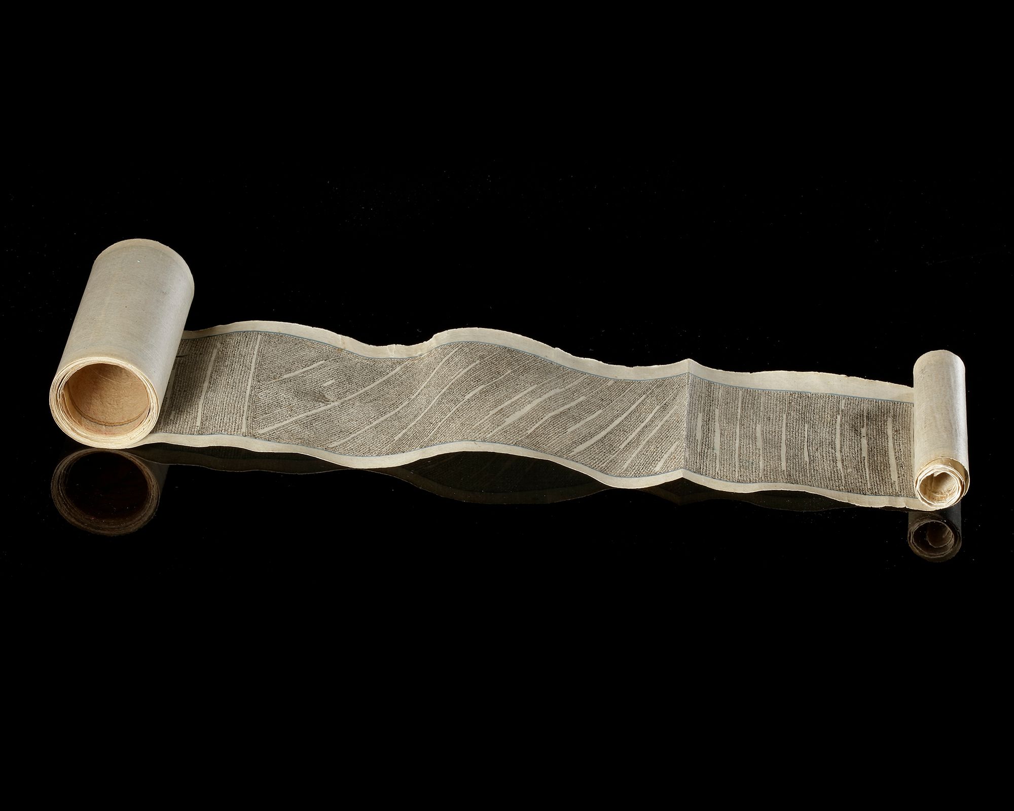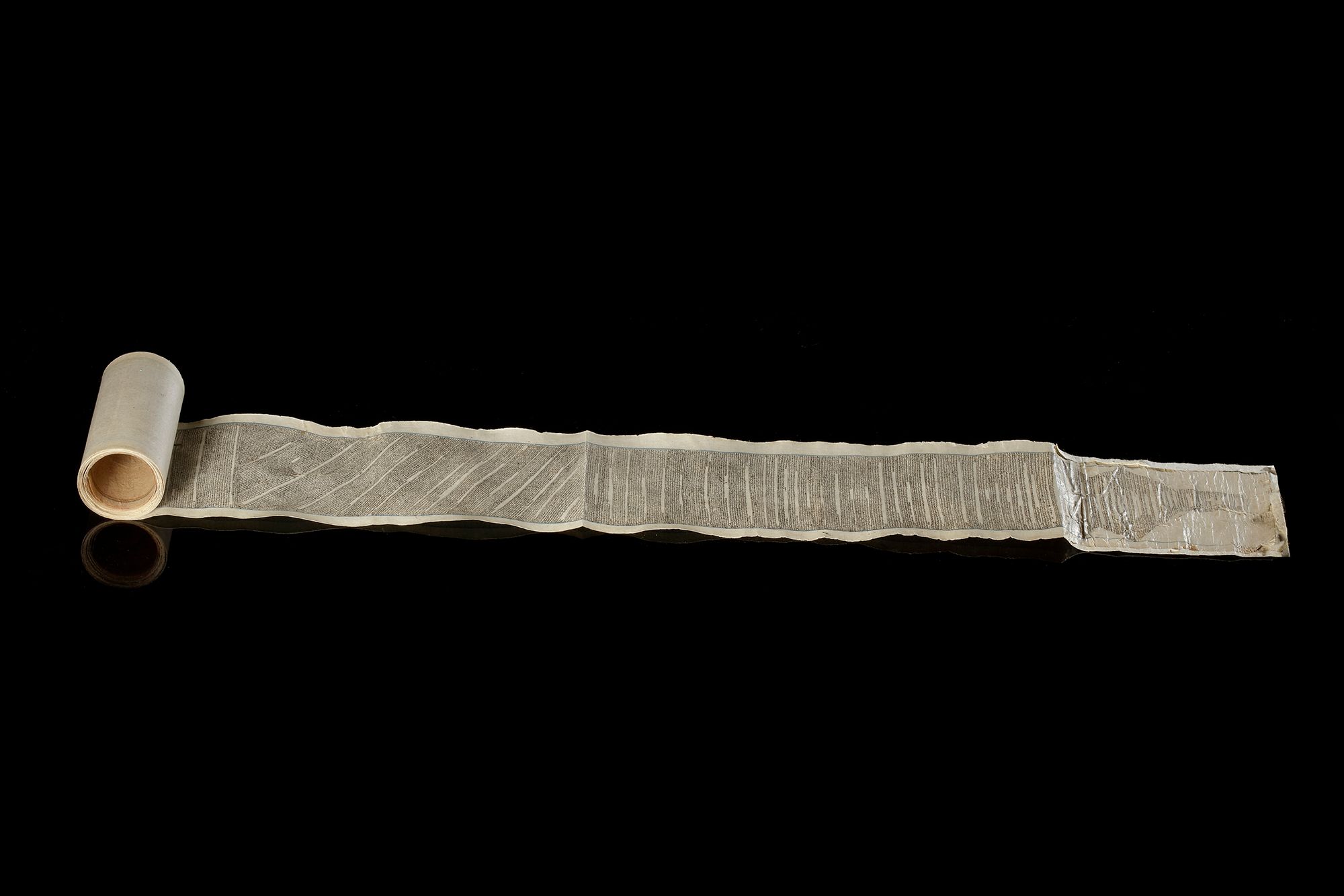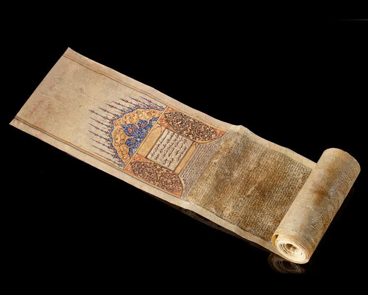 Arabic manuscript on paper in scroll form, written in black Ghubar script of the whole Quran, the headpiece with gold and royal blue decoration enclosing surah Al-Fatiha in naskh script.