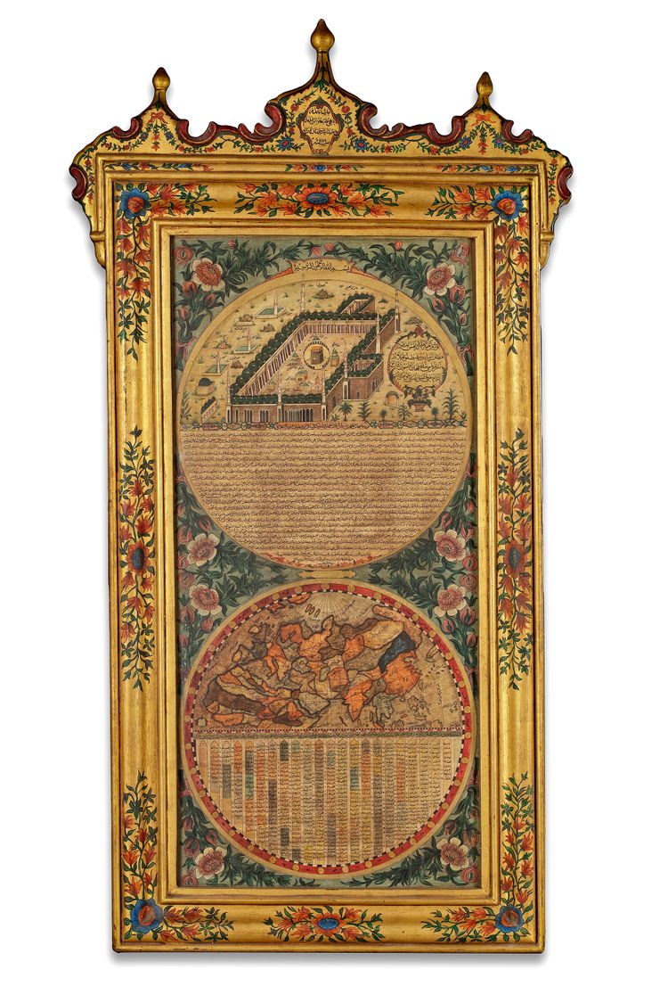 This qibla finder map in a wooden frame, dated 1764/65 AD, is modeled after the original series of Qiblafinders, invented and made by Baronyan (Bārūn al-Mukhtariʽ) some 30 years earlier.