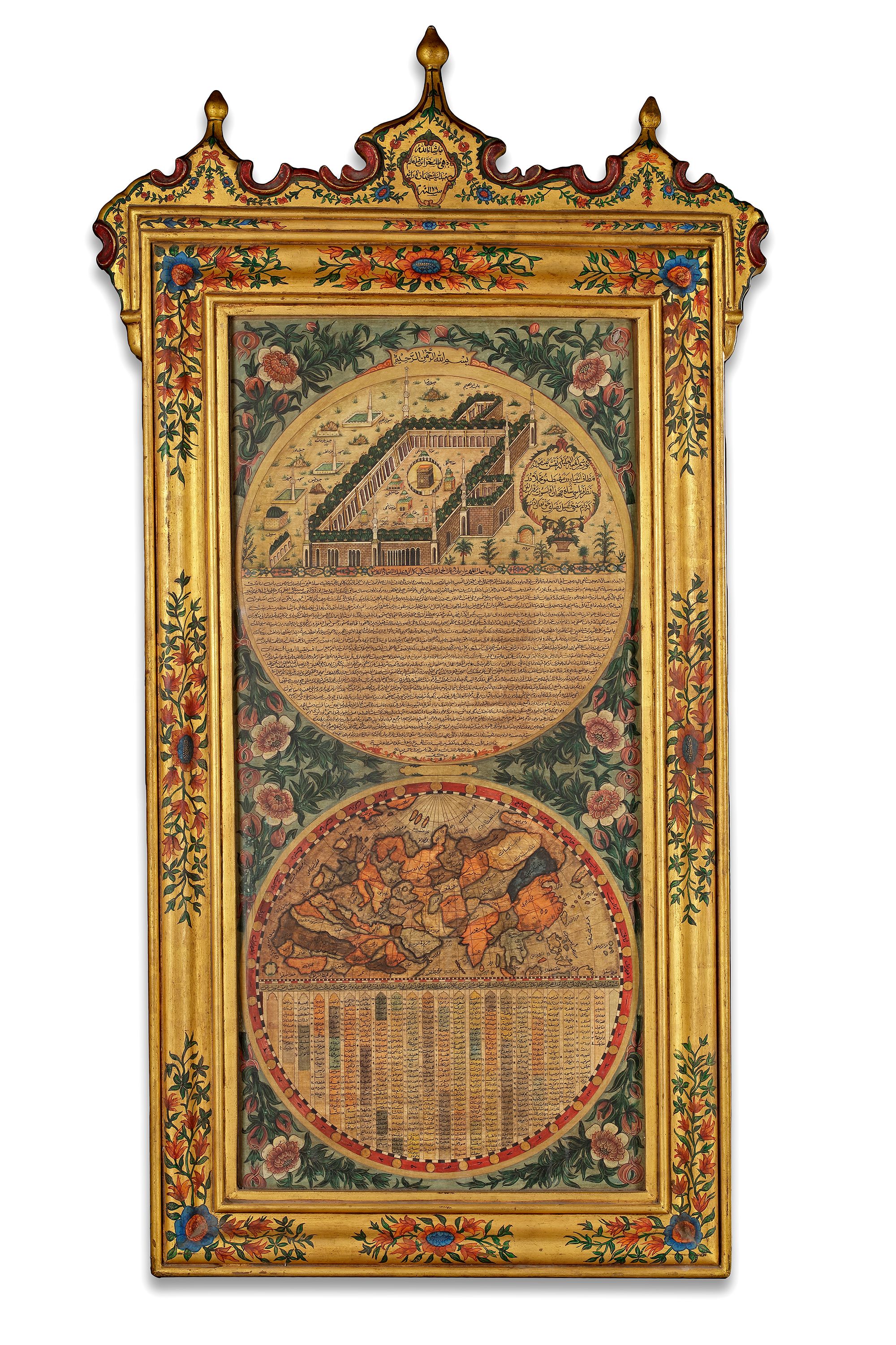 Qibla finder comprising a rectangular wooden panel with two printed roundels, the upper one with a depiction of the Haram al-Sharif in Mecca and a description by the inventor of the instrument, the lower roundel with a depiction of a map of the world signed in a cartouche by Abdulwahab Siddiki, thereunder a series of tables listing the cities and places of the world. The description mentions al-Bārūn al-Mukhtariʽ as the inventor and is dated 1151 AH/1738-9 AD.