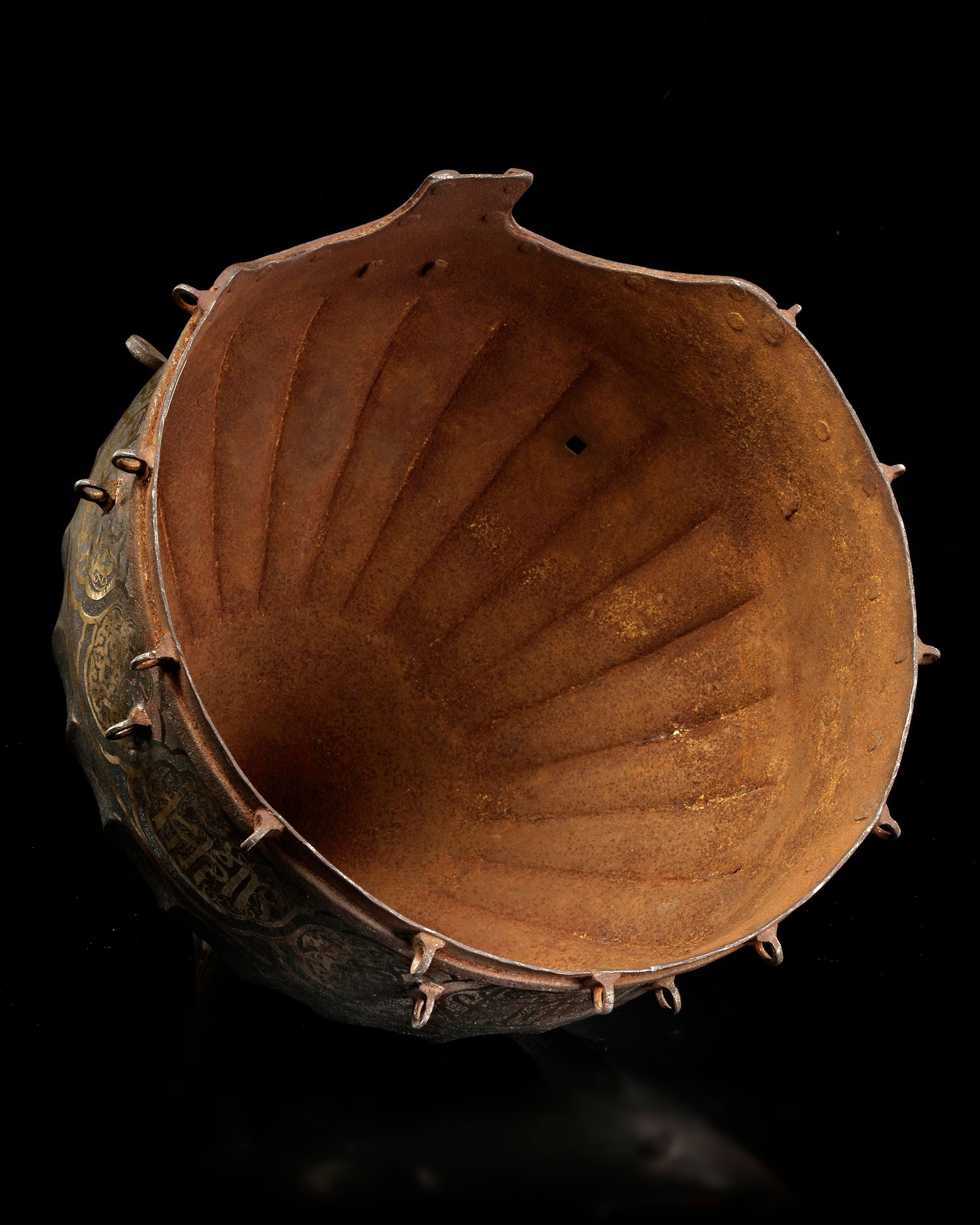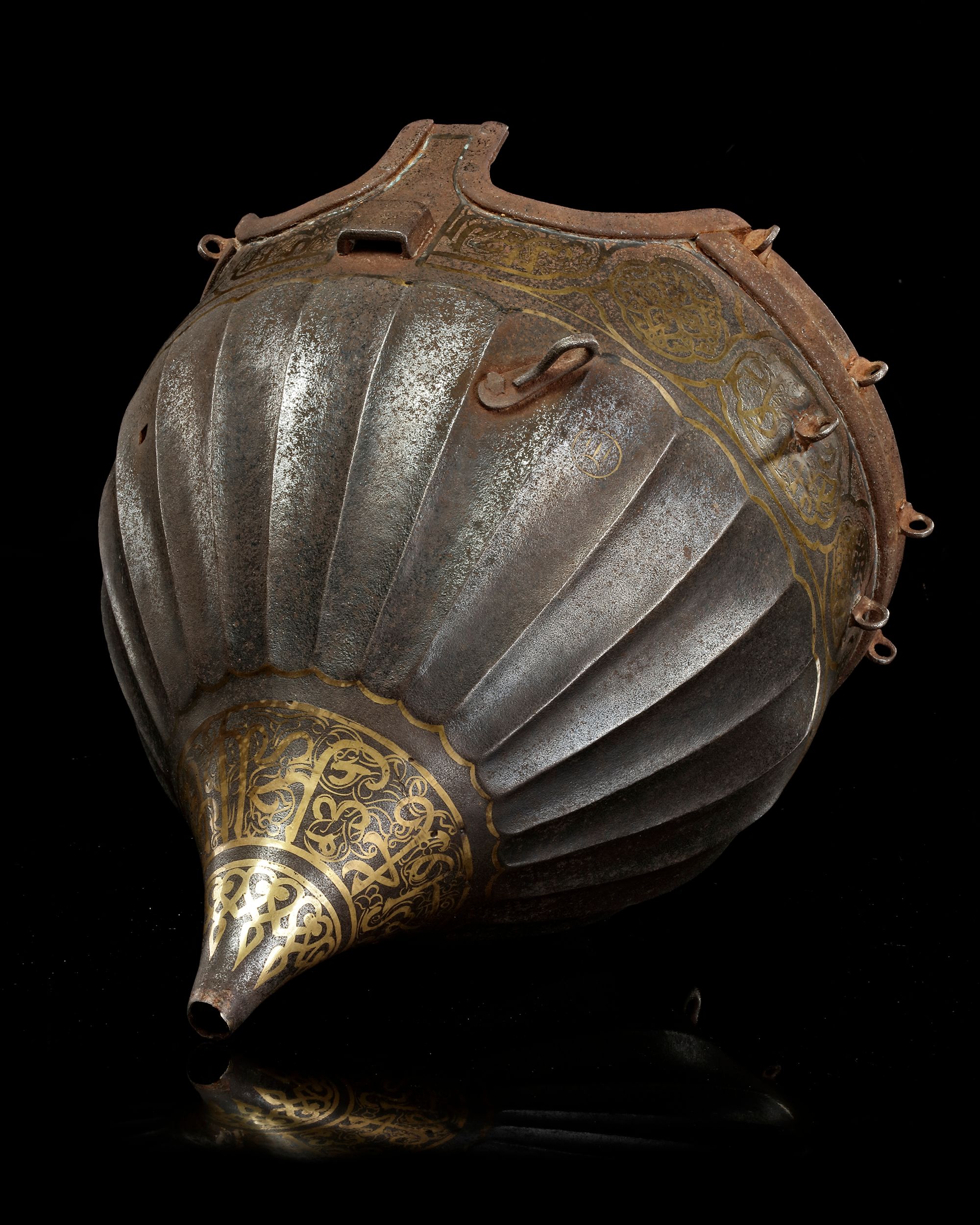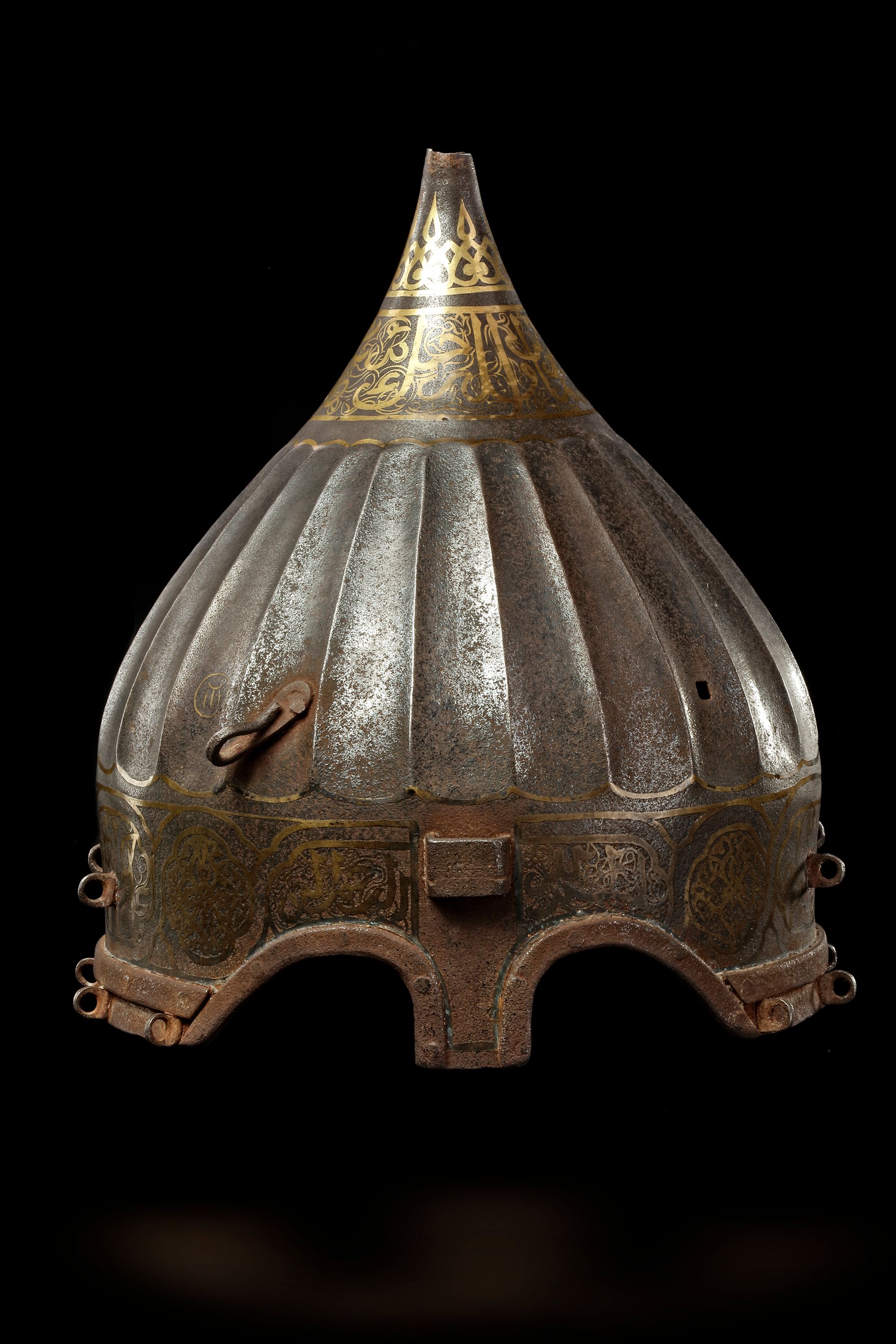 This helmet, which is characterised by its large yet elegant domical shape with a band of flutes and gently rising finial, is also referred to as a ‘turban helmet’ due to the resemblance of these flutes to the folds on a turban. Turbans could be representative of one’s rank or religious order, and the way that these were wound and the numbers of folds created were particularly important indicators of rank or religious status, some mystical dervish groups would wear turbans folded several times to reflect some important mystical number. The fluted design of the turban helmet might replicate this practice. The religious nature of the turban helmet was underlined by the presence of Arabic inscriptions taken from the Quran. These Quranic inscriptions supposedly provided God's protective power to the wearer.