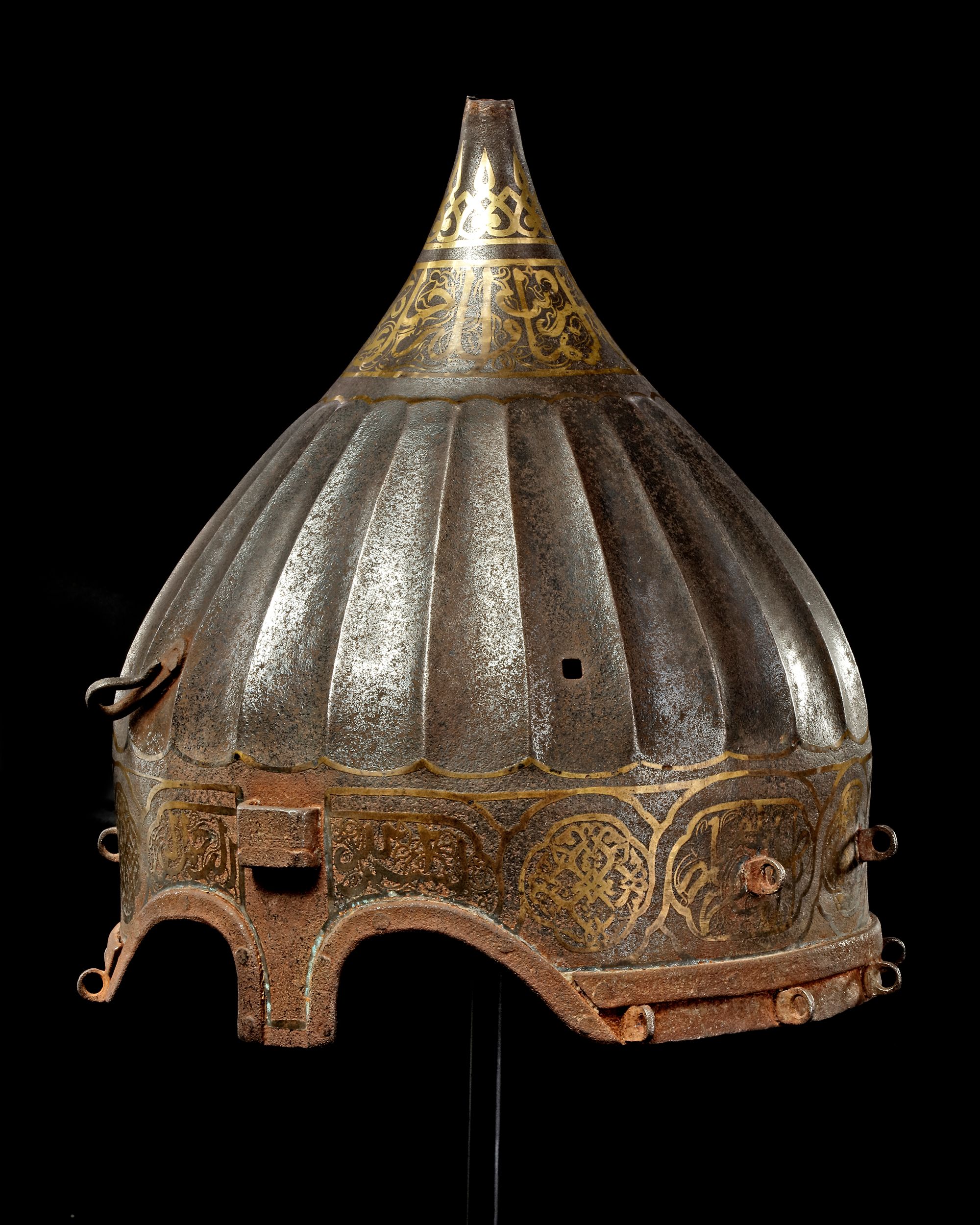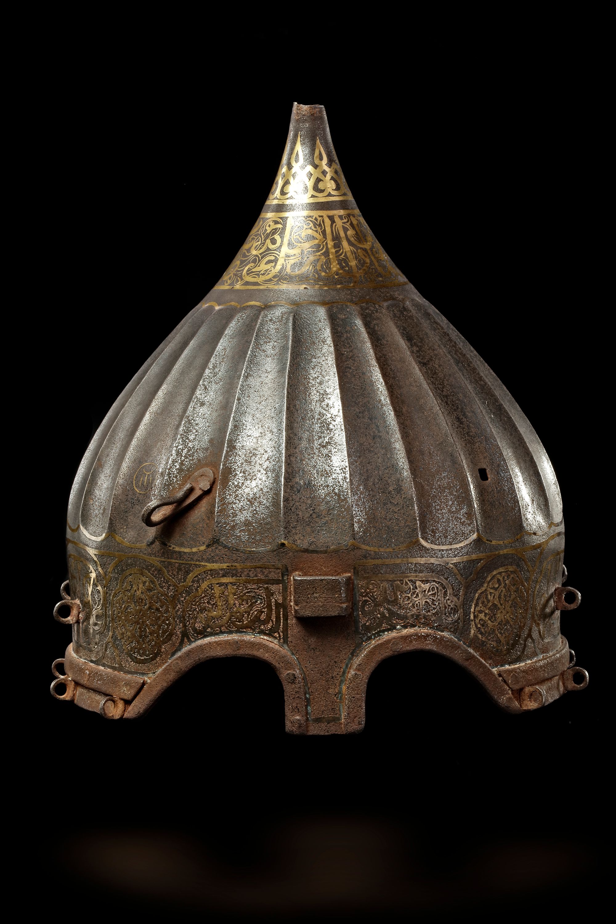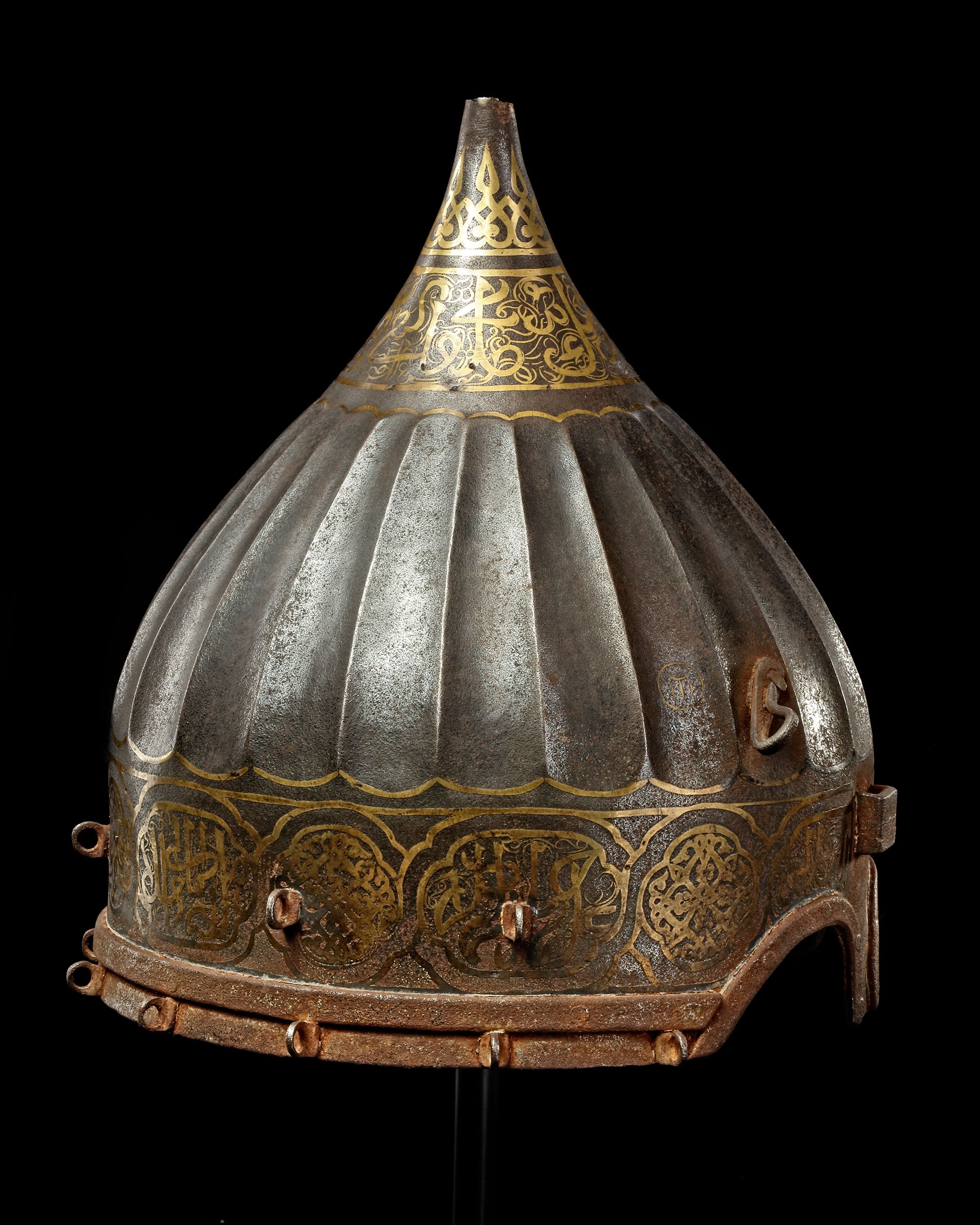 A fine steel turban helmet, of cylindrical form rising to a swollen band of vertical flutes narrowing to a central pointed apex housing a fixing for a finial, indents for the eyes and nose-guard to front, with applied rings for the nasal guard and plume holders, 17 rings around the lower edge and the rim for the suspension of an aventail, a wide band around base containing cartouches enclosing gilt engraved inscriptions, the helmet is gilded with the mark of the Ottoman arsenal (Kayi tribe), a similar band of gilt inscriptions around the top under a band of interlocked leafy palmettes.