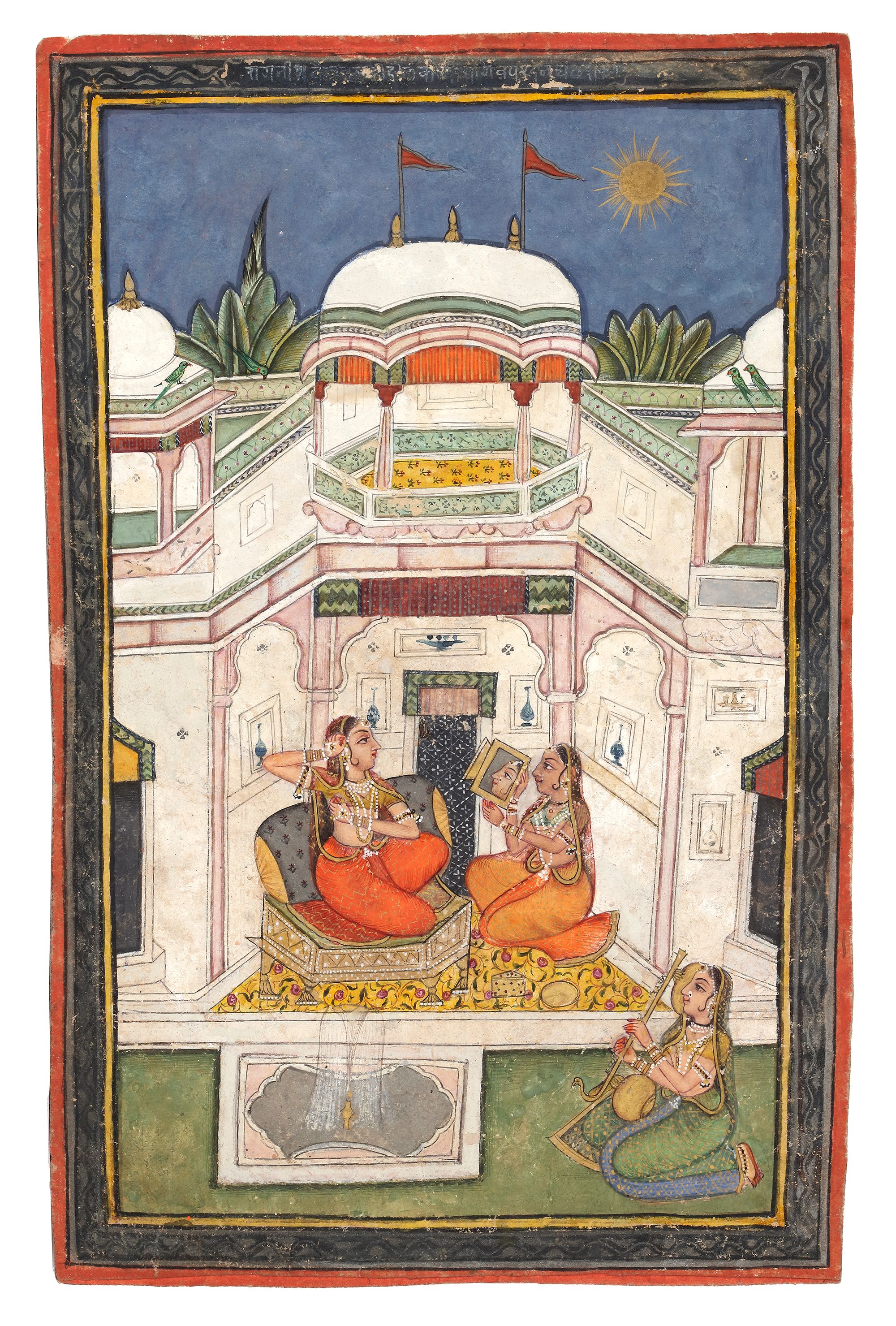 The lady seated on a Golden throne attaching her earrings with the aid of a mirror, with attendants and musician on an open veranda of a palace, green parrots above and roosters in the foreground, an inscription at top.