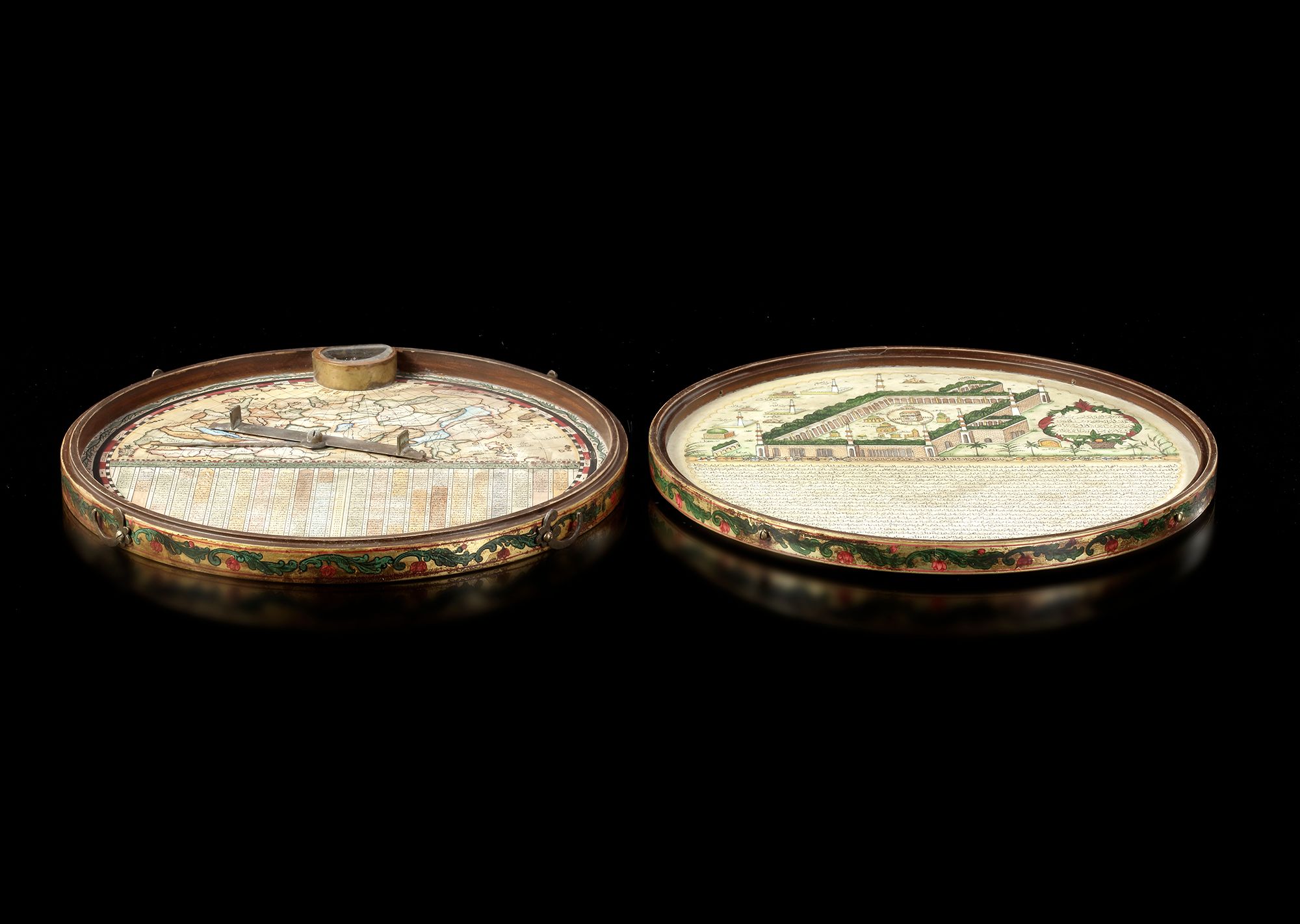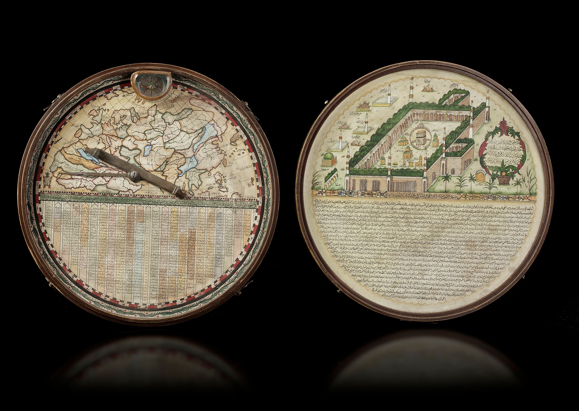 An Ottoman Universal Qibla Indicator (“Kıblenüma-ı Afaki”) modeled after the original invented in 1151 AH/1738 AD by the Armenian Bārūn al-Mukhtariʽ (Petros Baronyan) and presented to the Ottoman Grand Vizier Yeğen Muhammed Pasha. This instrument shows the direction to Mecca for almost 400 cities in the world. Baronyan used an engraved map and a list of cities which he numbered in the map so that the direction could easily fixed.