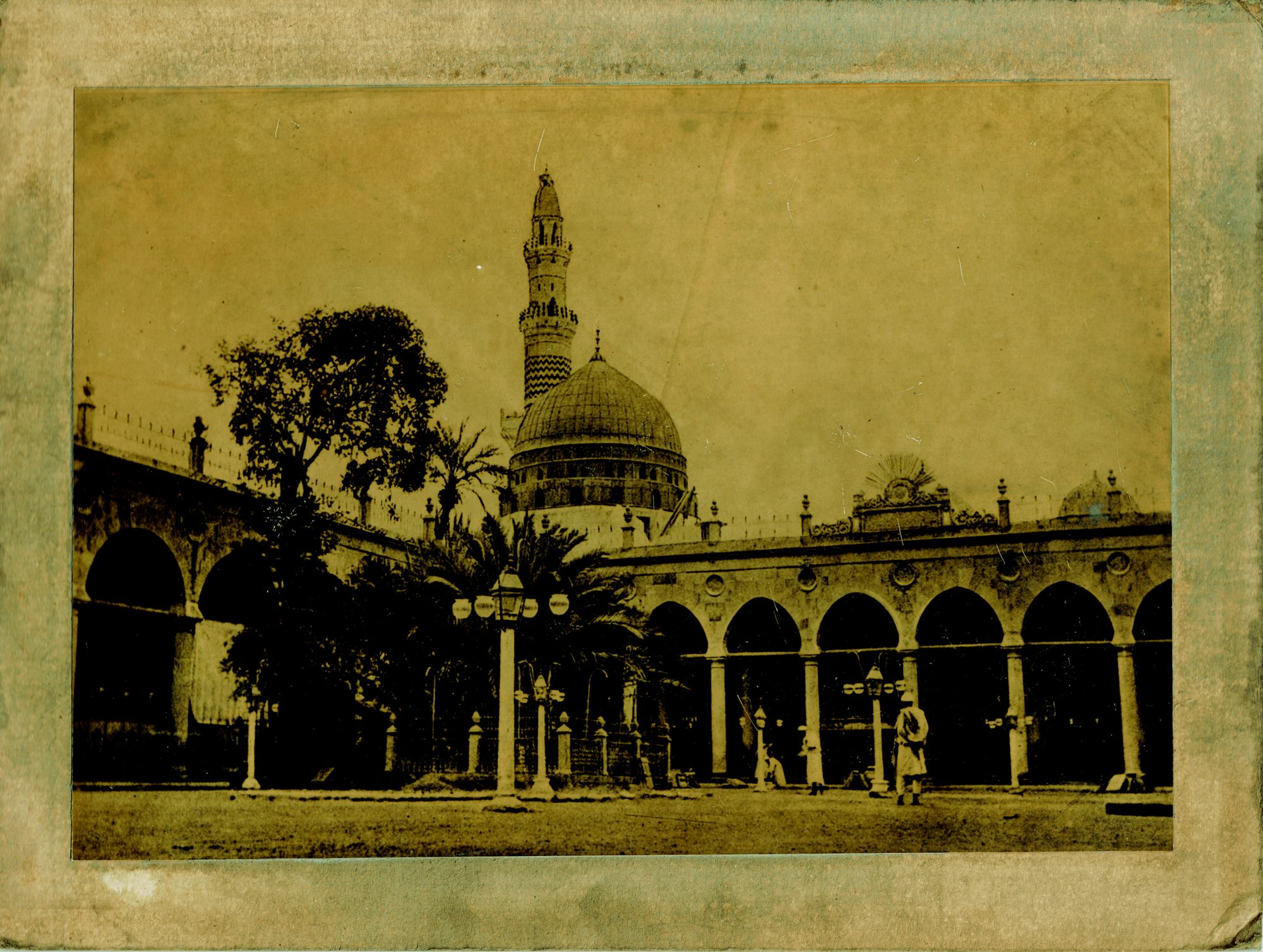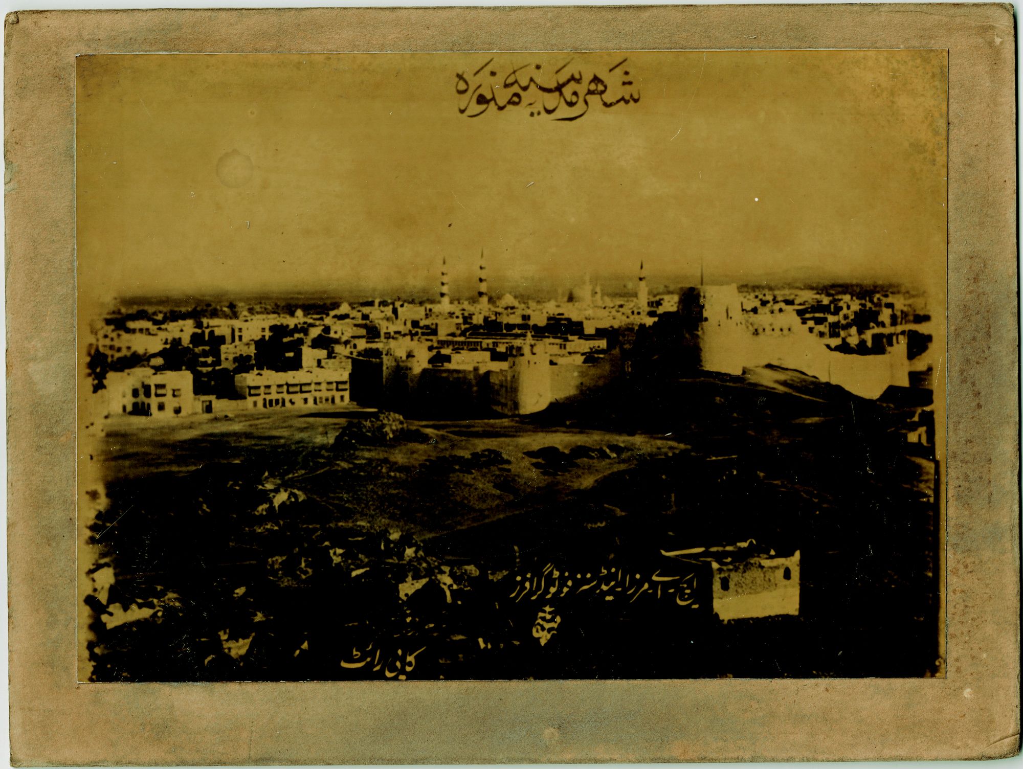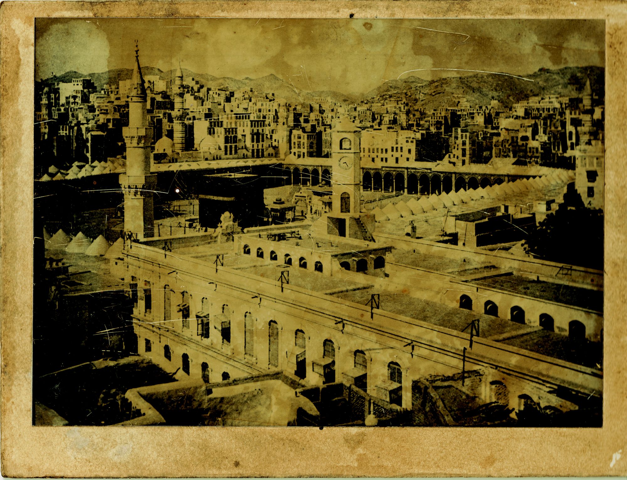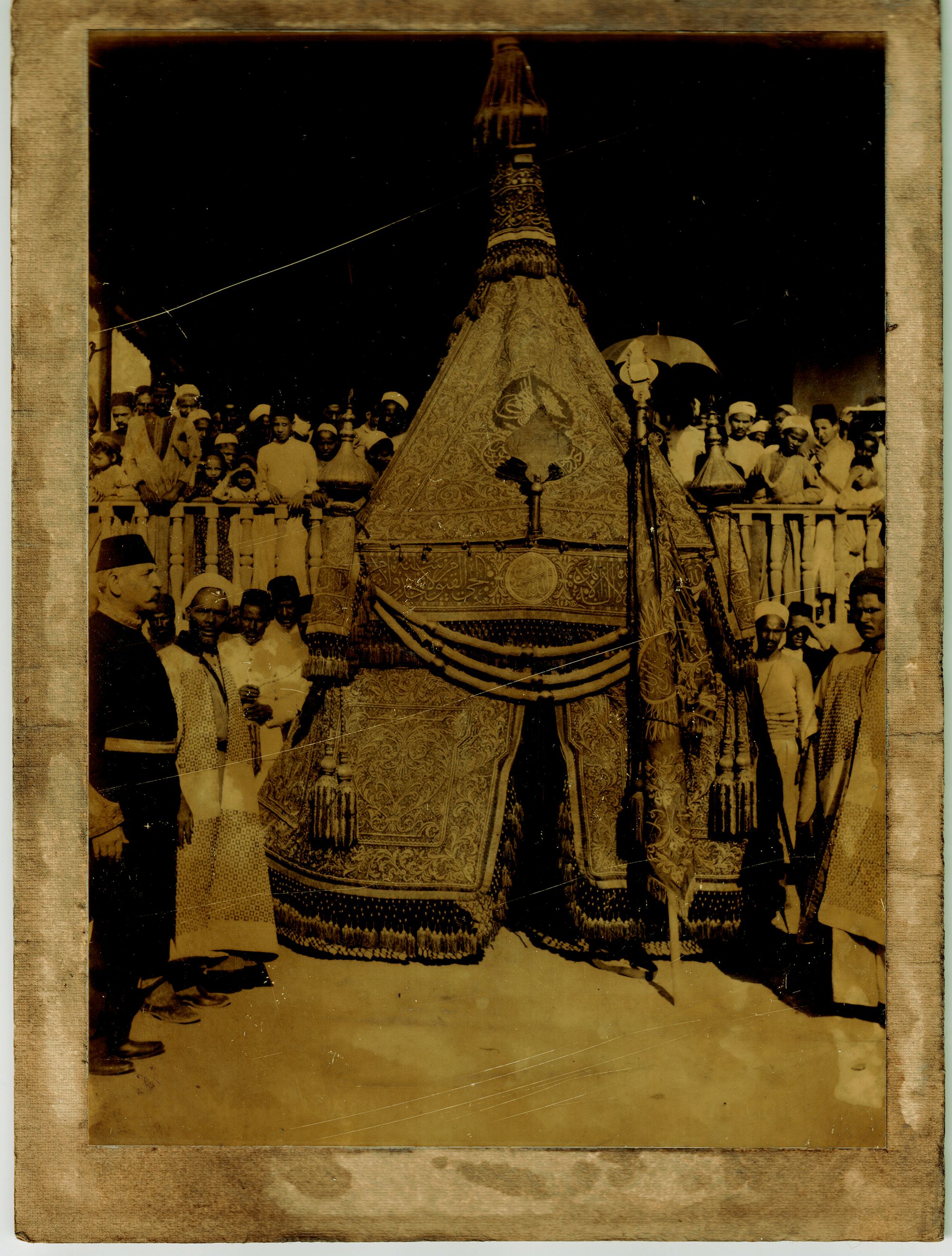Images of Mecca with prayers around the Kaaba with al-Salam gate, arrival of the Mahmal at Mecca, pilgrims' tents at Muna, a view of the city of Medina and the Prophet's mosque, a close view of al-Masjid al-Nabawi with its prominent green dome, a view of Mecca with al-Kaaba in the centre, a view of Al-Baqi Cemetery.