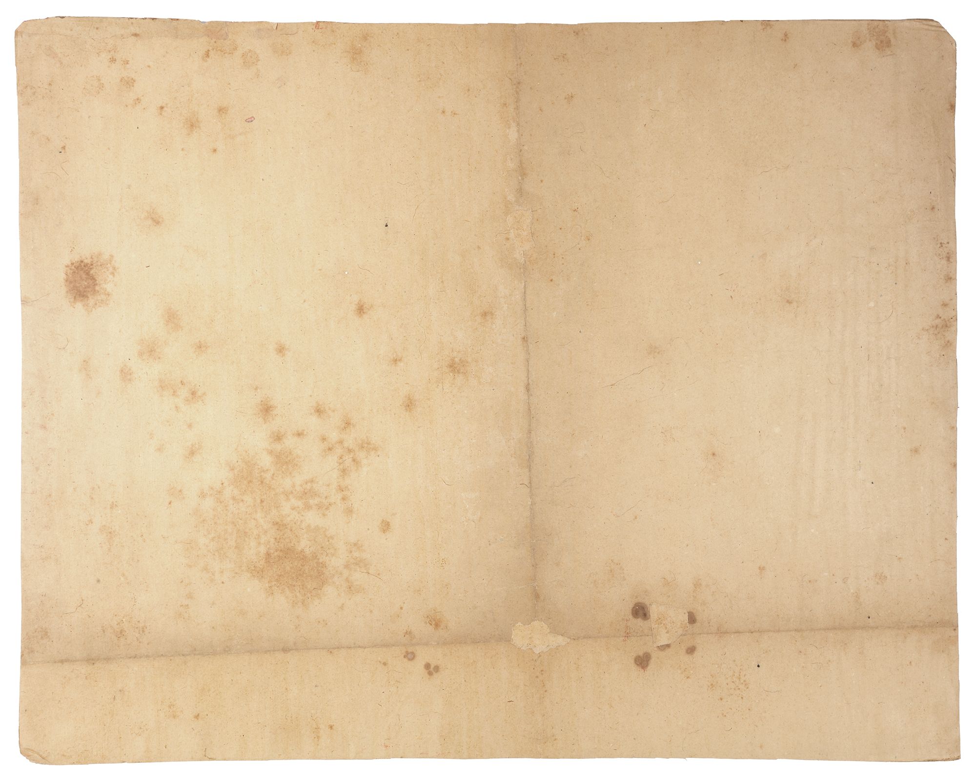 Gouache with gold on paper, depicting the nimbate ruler seated against a golden bolster, receiving his nobleman in a palace garden, with attendants, within narrow grey margins with black rules and red border.