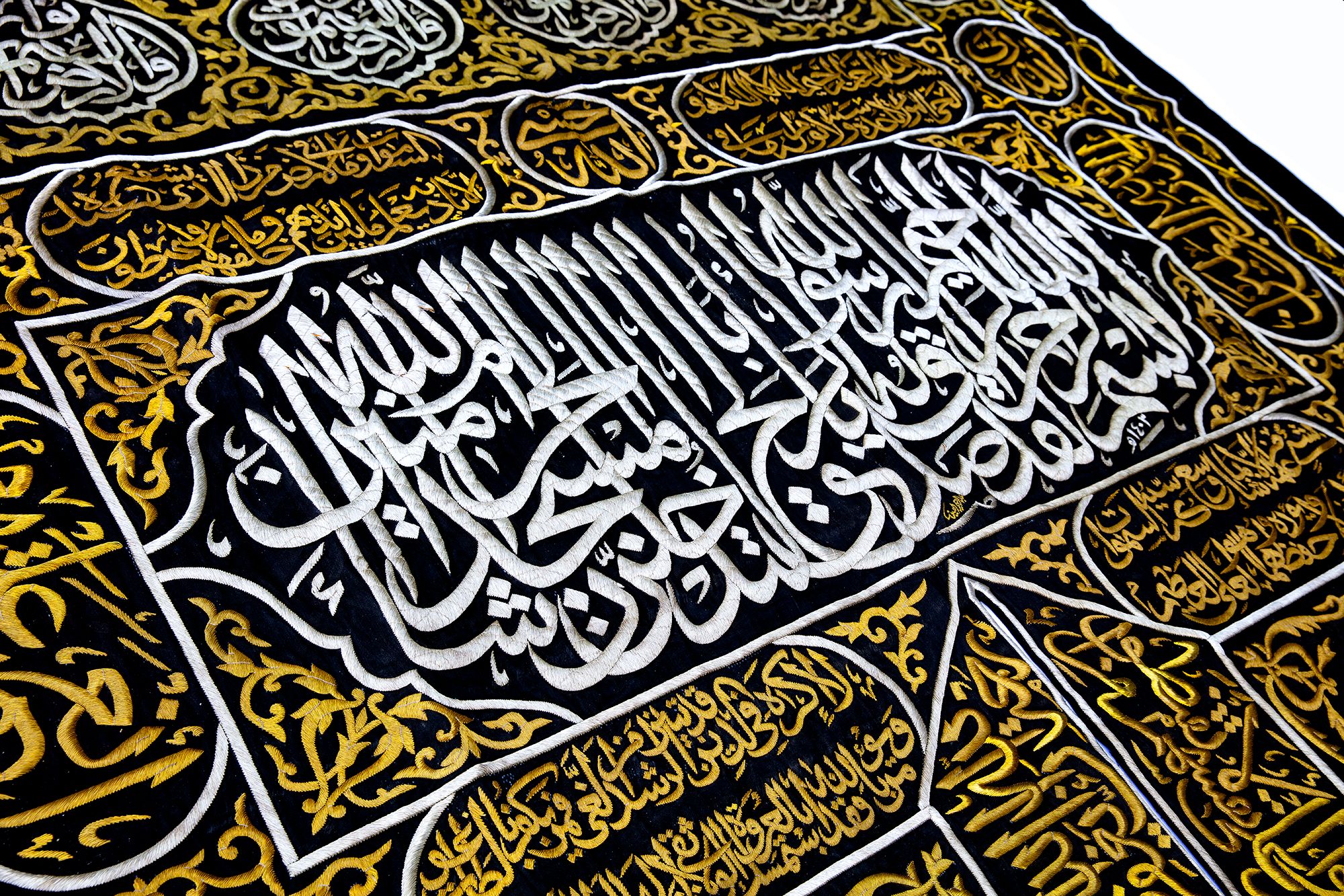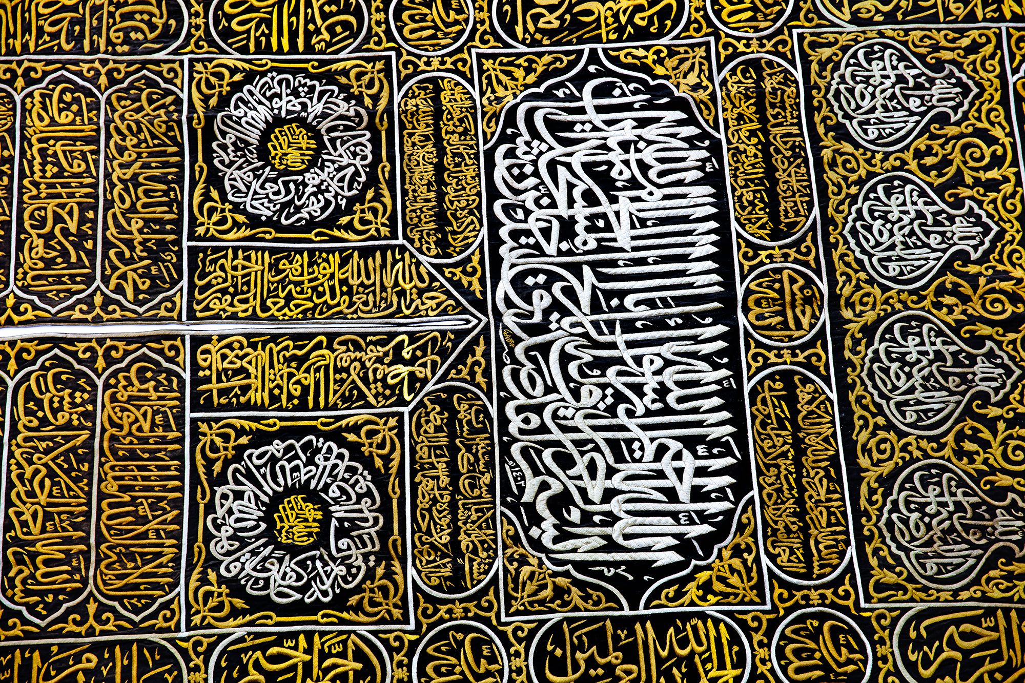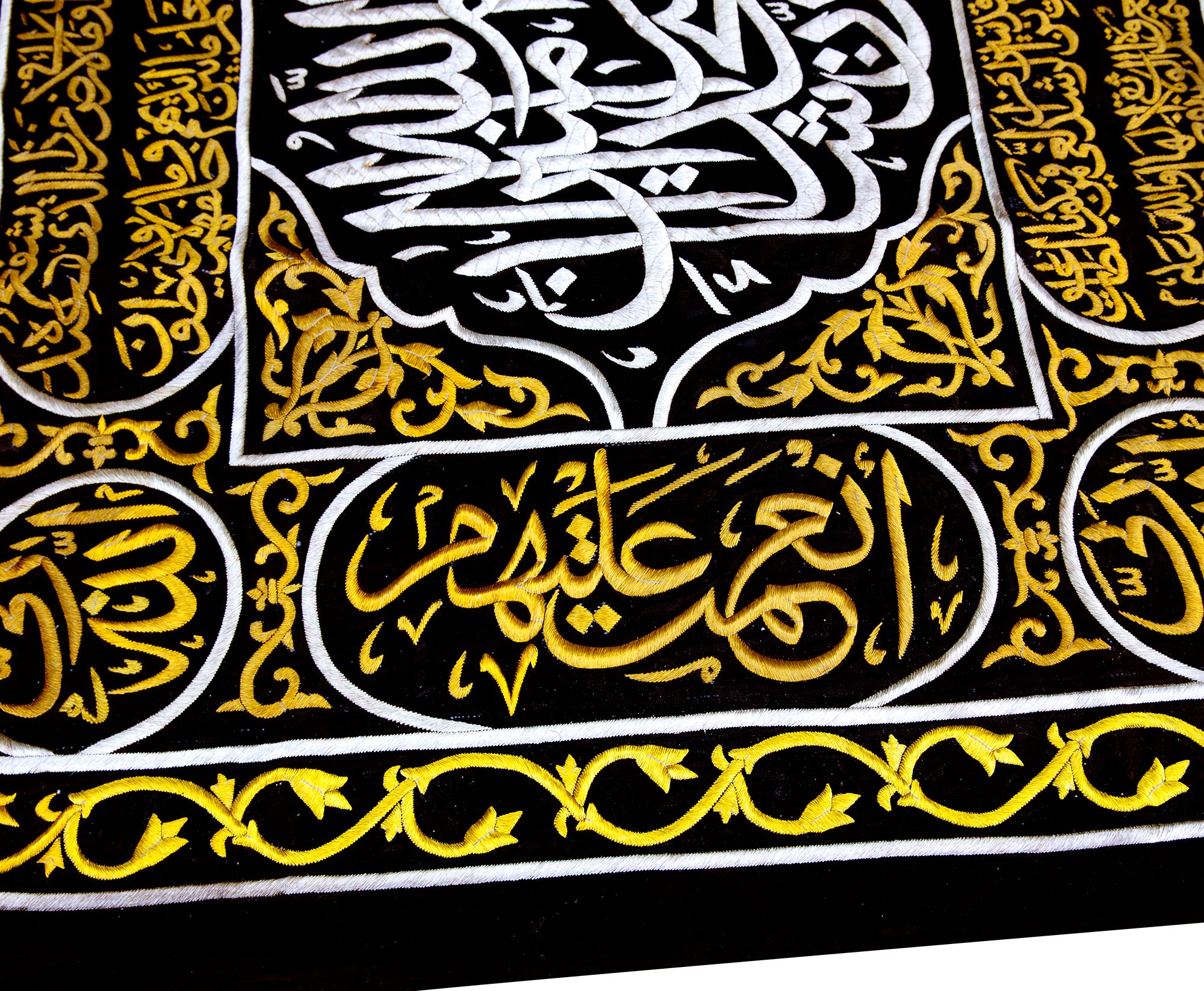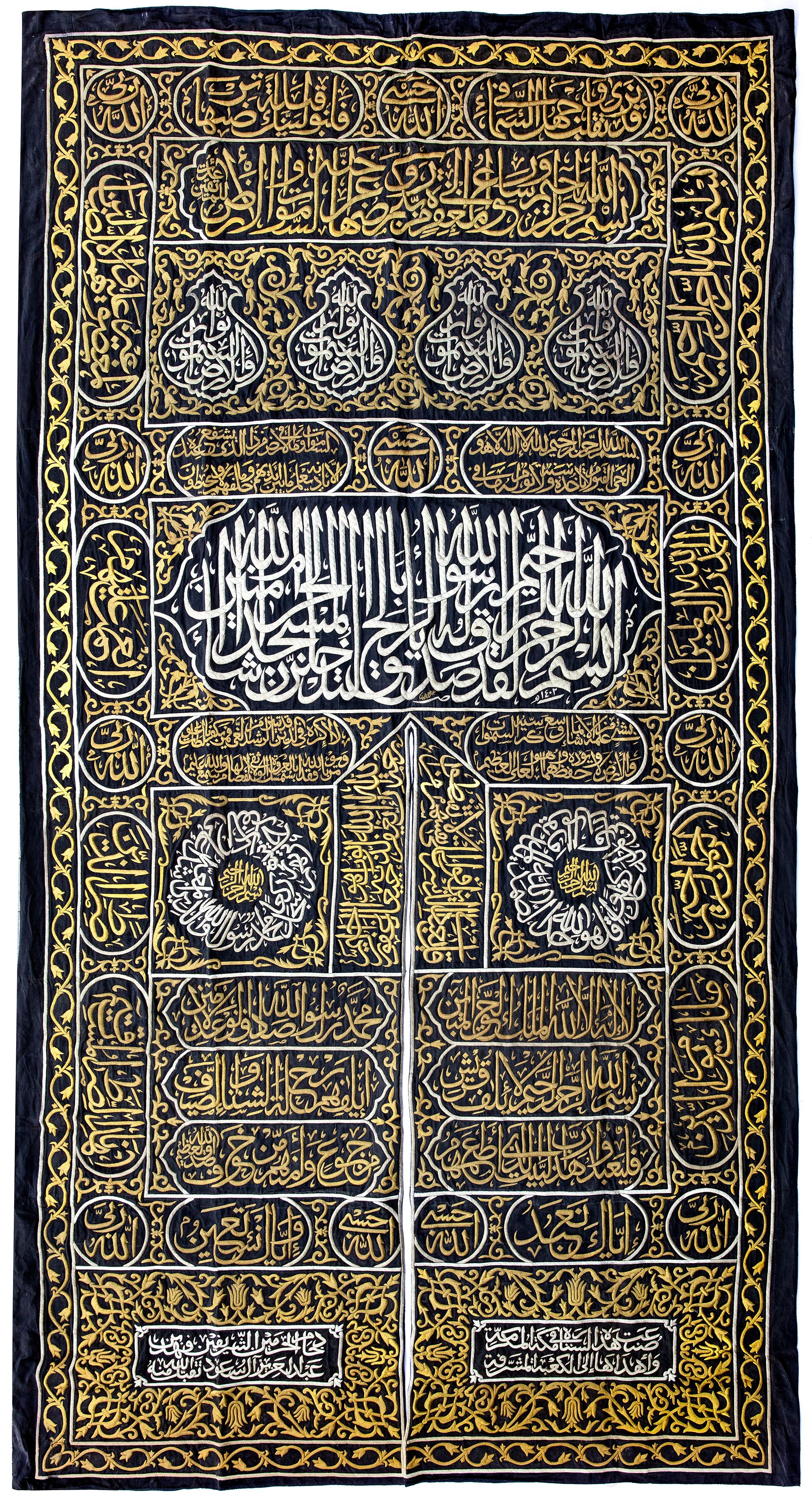 At the top a large panel with a cartouche enclosing Quran 3 surah Al-Imraan v.133 with four Qandeels surrounding Quran 24 surah Al-Nur v.35. On either side of door slip a verse from Quran 39 surah Al-Zumar v. 53 and two large roundels stylized with surah Al-Ikhlas and Quran 48 surah Al-Fath v. 29 in silver wires on a black silk ground. On both sides of the door slip panels containing Kalimaat Al-Tawhid and Quran 106 surah Quraysh with four verses. The lower section with two panels with the inscriptions: 'this sitara is made by the order of the Custodian of the Two Holy Mosques Fahd bin Abdulaziz Al Saud', 1403 AH/ 1982 AD. On a dense design of gilt floral motifs.