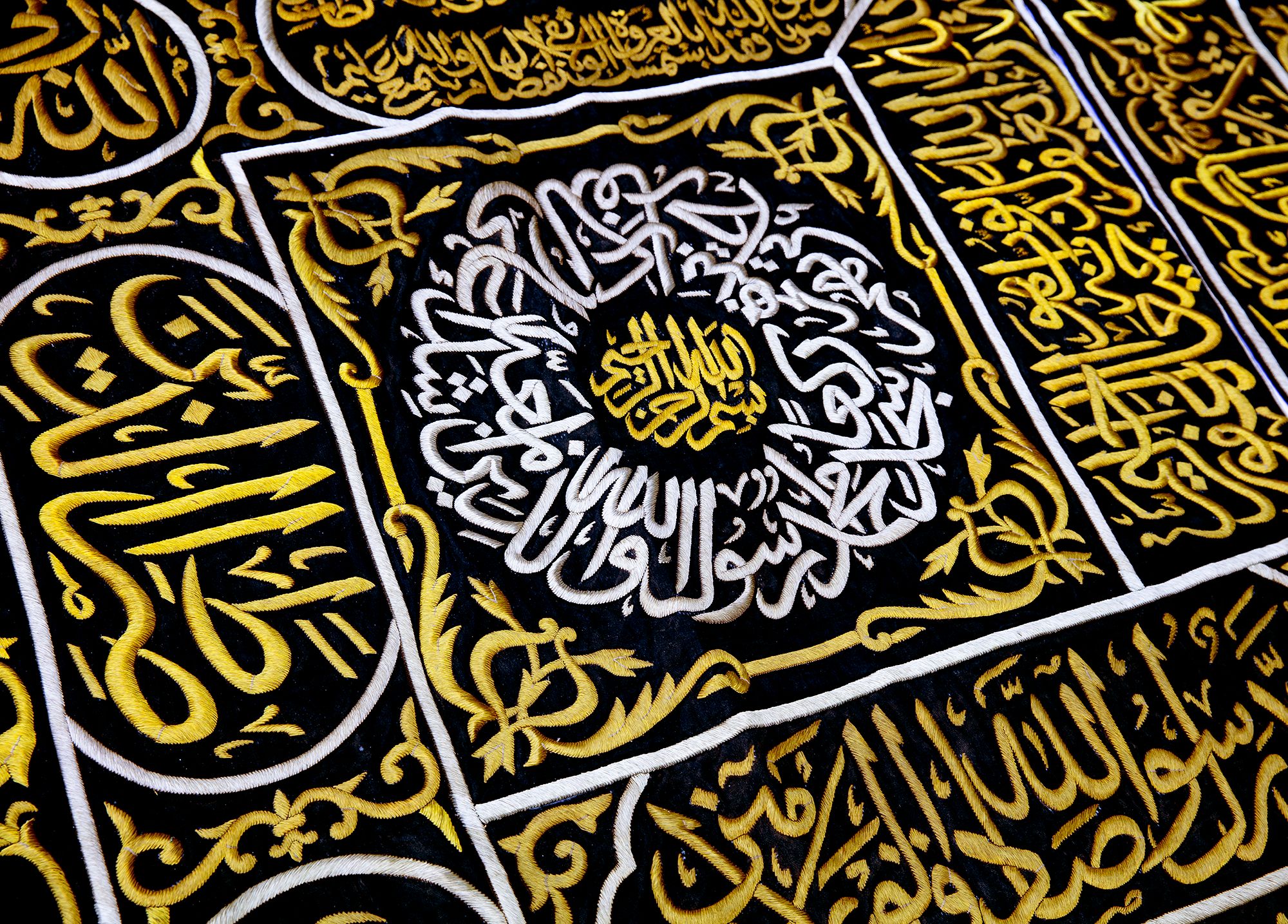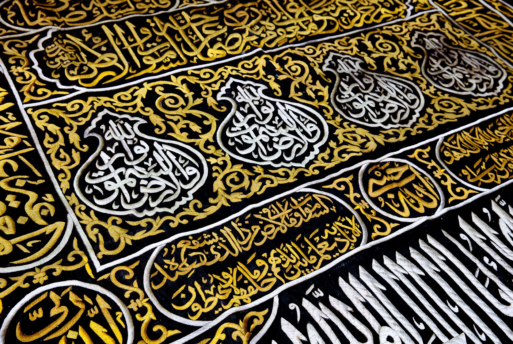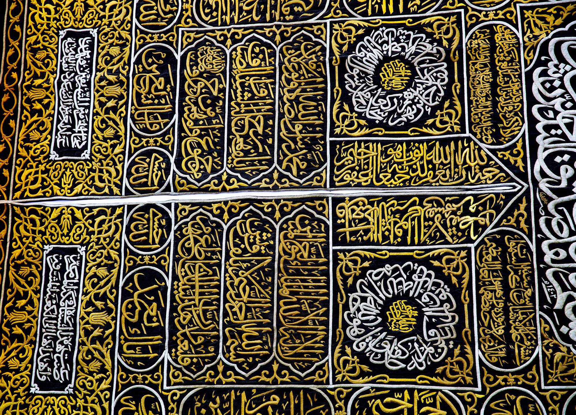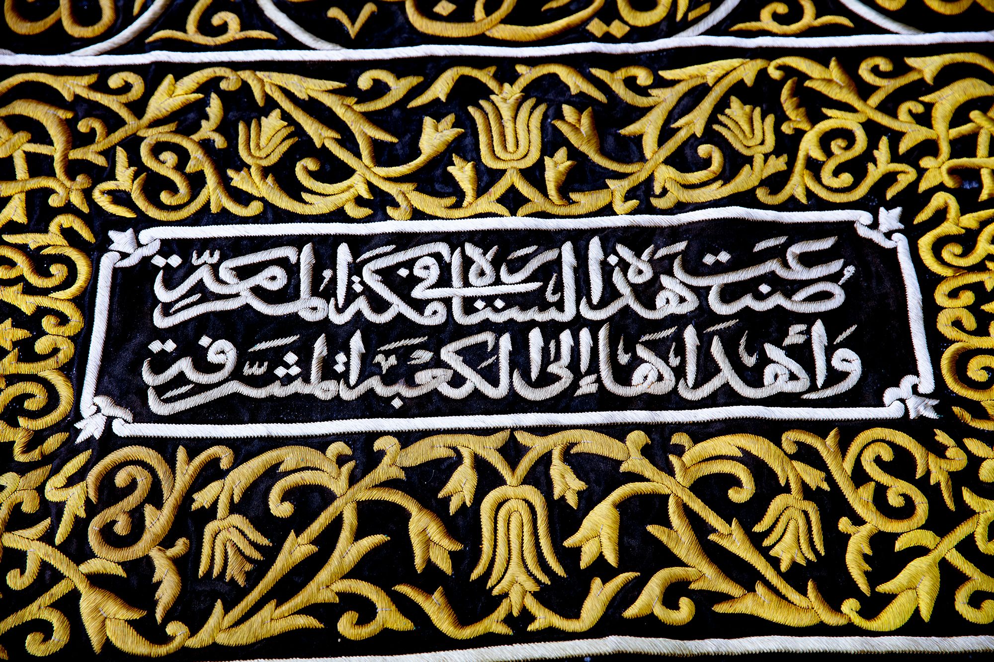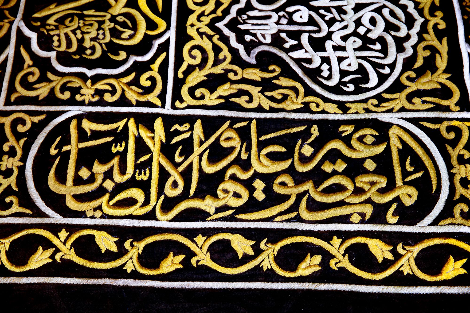 At the top a large panel with a cartouche enclosing Quran 3 surah Al-Imraan v.133 with four Qandeels surrounding Quran 24 surah Al-Nur v.35. On either side of door slip a verse from Quran 39 surah Al-Zumar v. 53 and two large roundels stylized with surah Al-Ikhlas and Quran 48 surah Al-Fath v. 29 in silver wires on a black silk ground. On both sides of the door slip panels containing Kalimaat Al-Tawhid and Quran 106 surah Quraysh with four verses. The lower section with two panels with the inscriptions: 'this sitara is made by the order of the Custodian of the Two Holy Mosques Fahd bin Abdulaziz Al Saud', 1403 AH/ 1982 AD. On a dense design of gilt floral motifs.