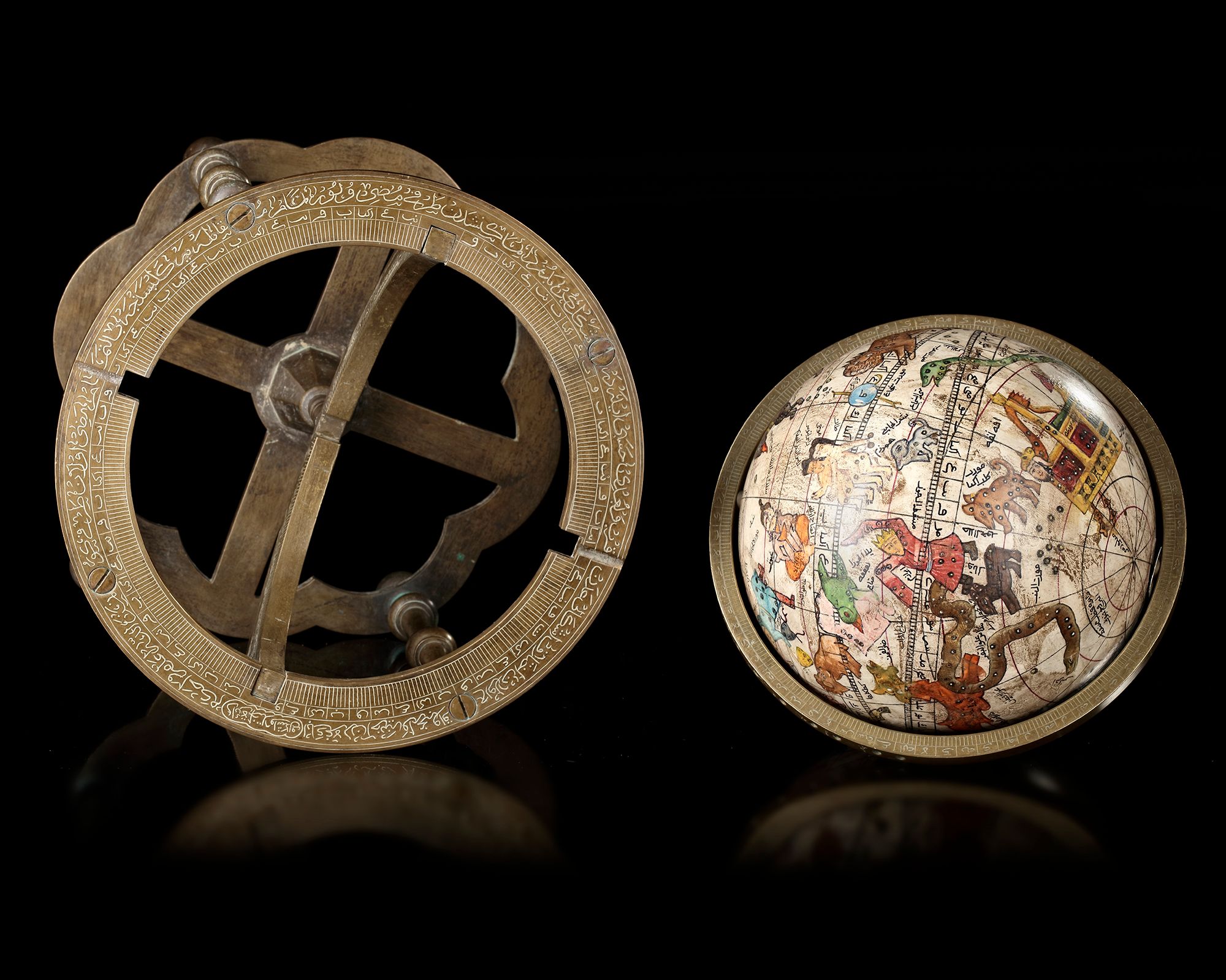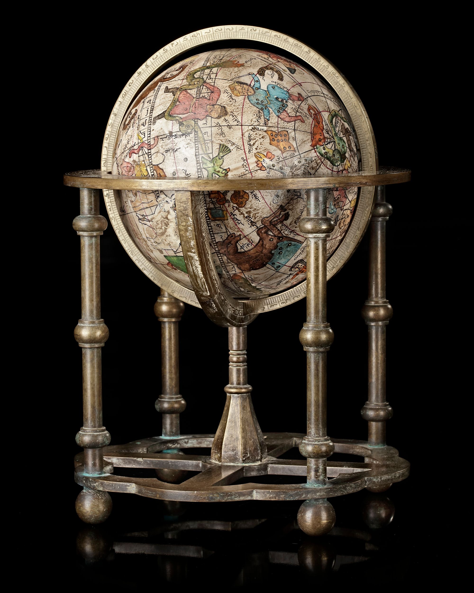 The sphere globe of paper cache, The entire surface highly decorated with script, figures and graphical representations of constellations, the lines for the Equator, the Ecliptic and the ecliptic meridians, mounted on a constructed heavy bronze stand and within meridian... Diameter 17 cm... Height of stand 24 cm.